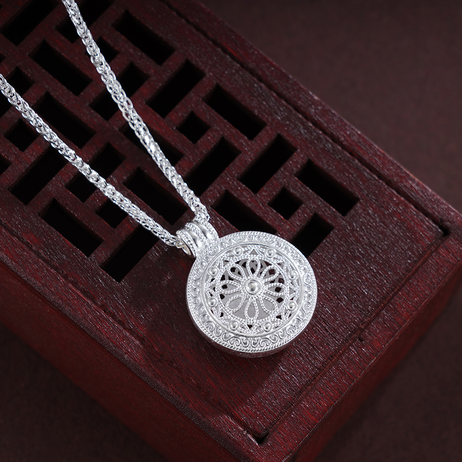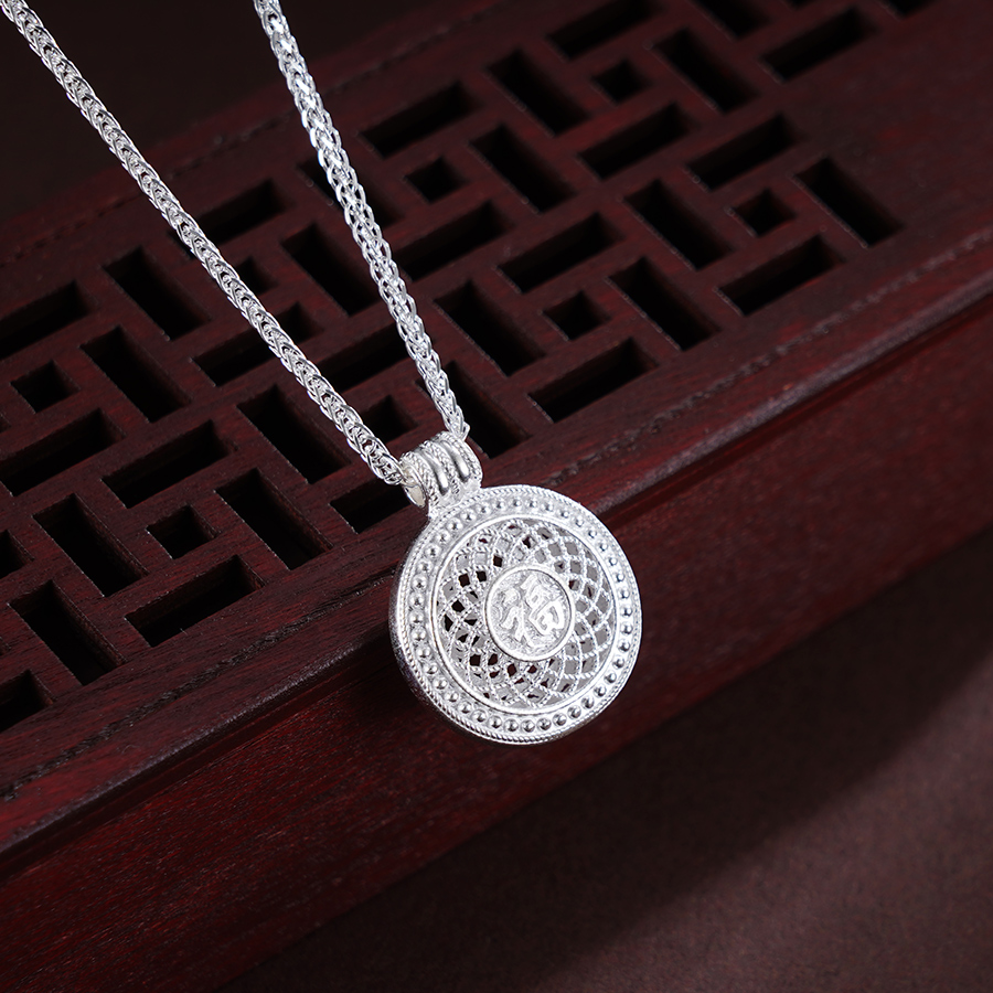 【寓意】:3D立体圆牌吊坠,银花丝精妙编织,福字生动点缀,整体清雅灵动,象征着福气满满和吉祥守护。