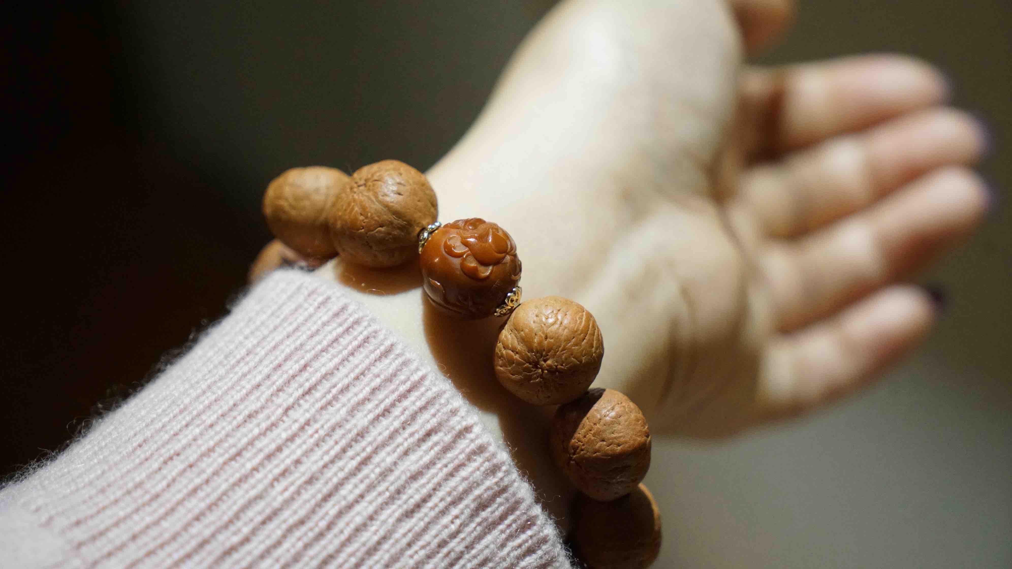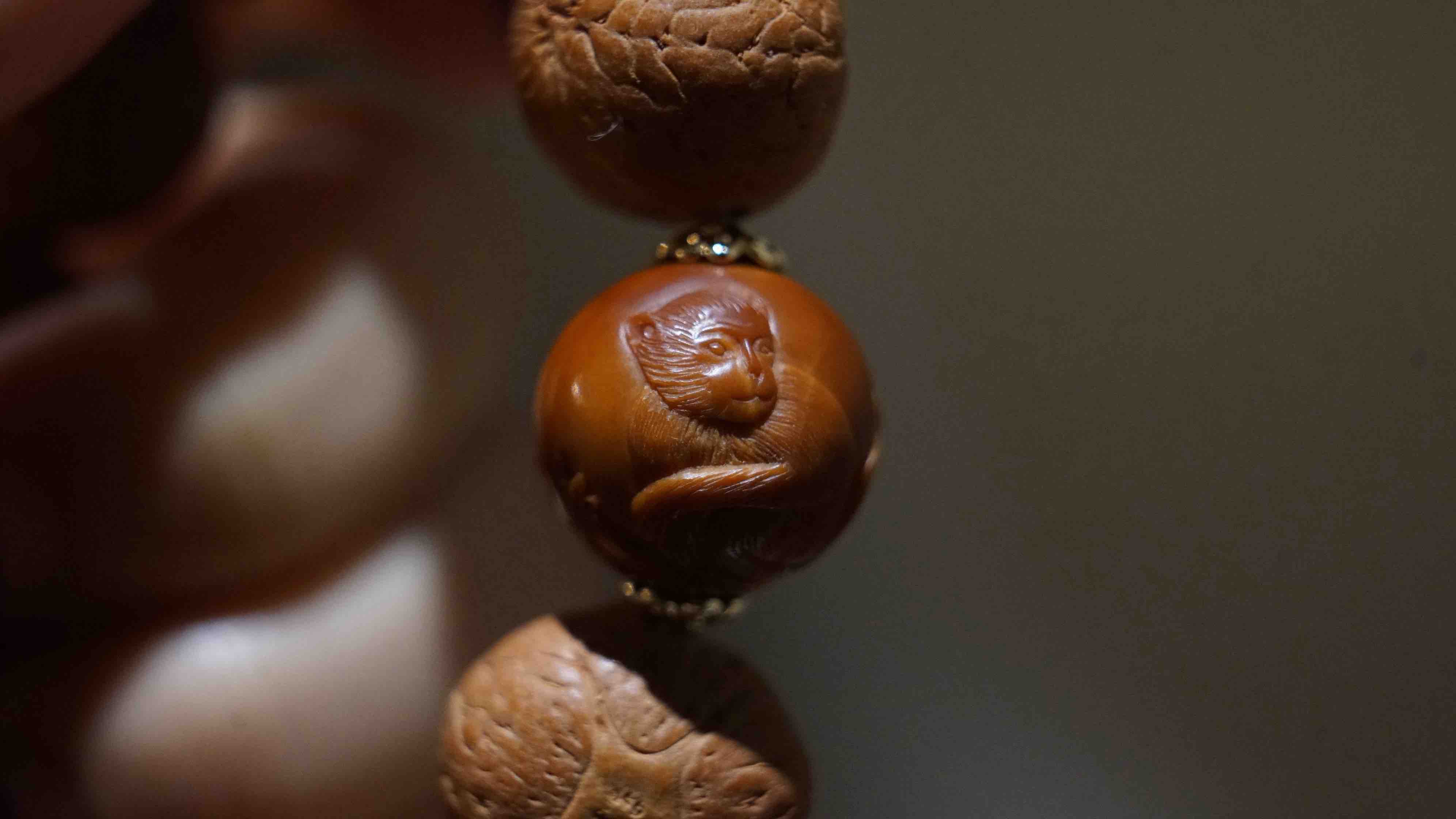 份量上手打手,皮质很棒,盘完出来效果一流。搭配了很值得一提是名家的橄榄核雕,生肖守护佛,猴。我们可以看到猴子的毛发,面部的立体形态,肢体动作的和谐程度,这都是工匠非遗技术的超高表现,我们蜜桃很甜与各位核雕艺术雕刻家合作已有十年,希望把美的能量传递到各位心中。