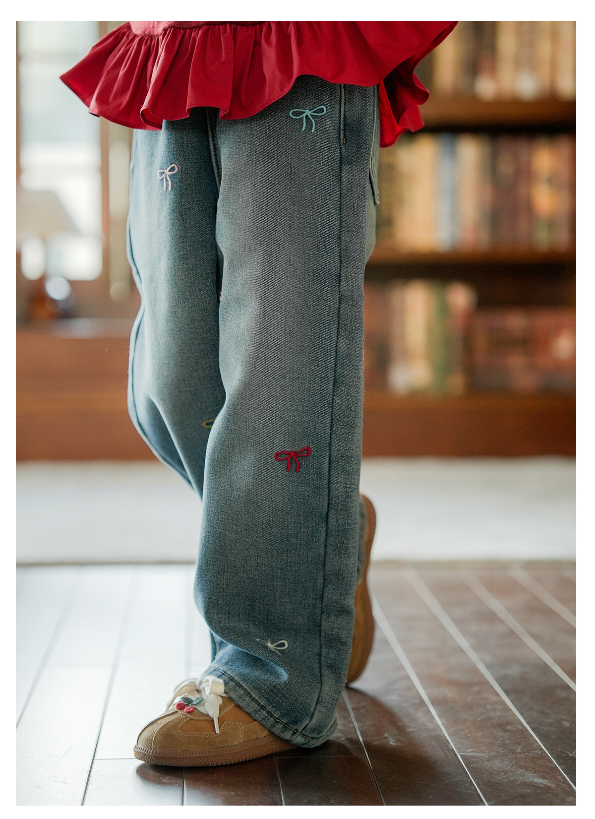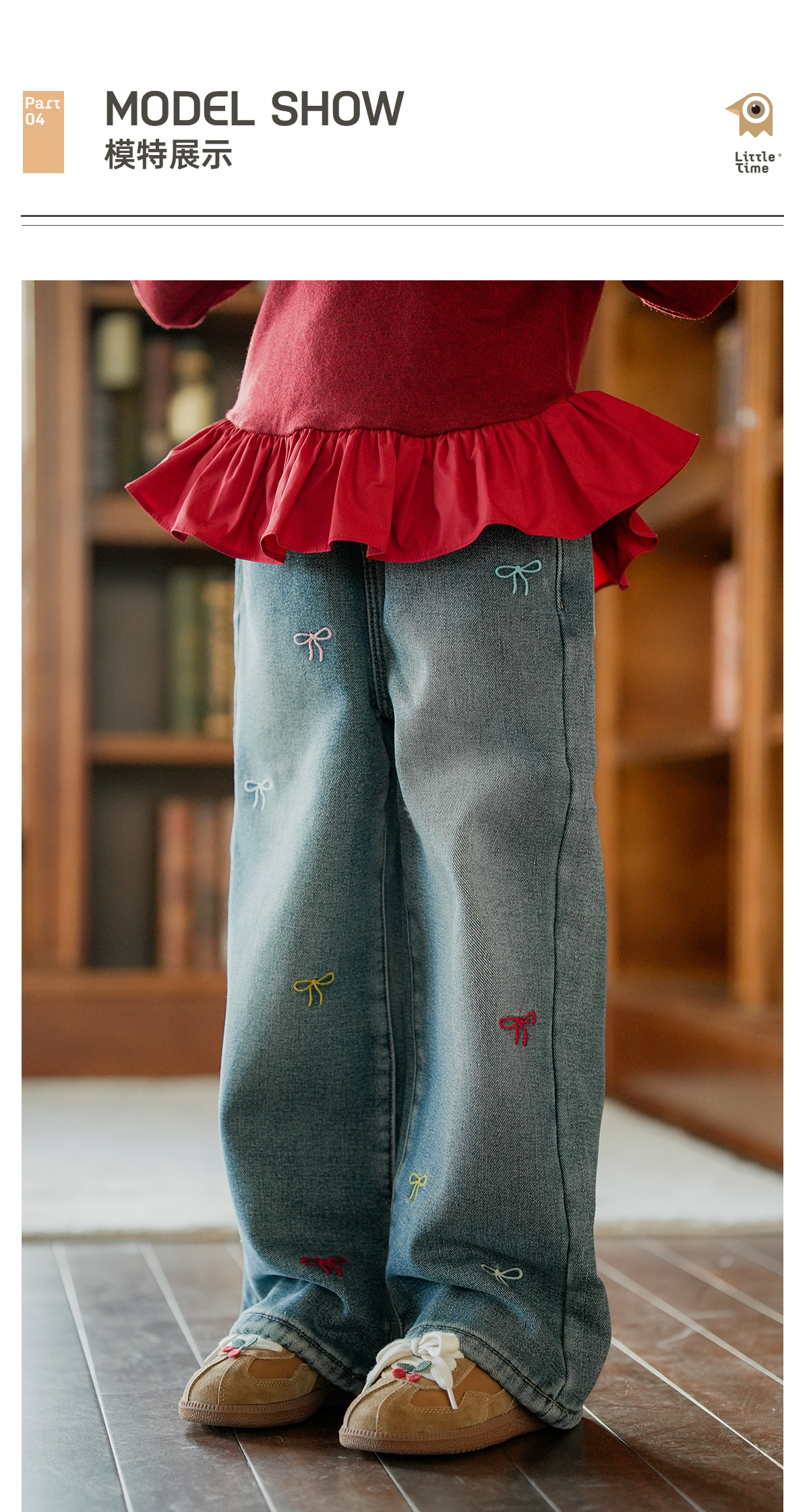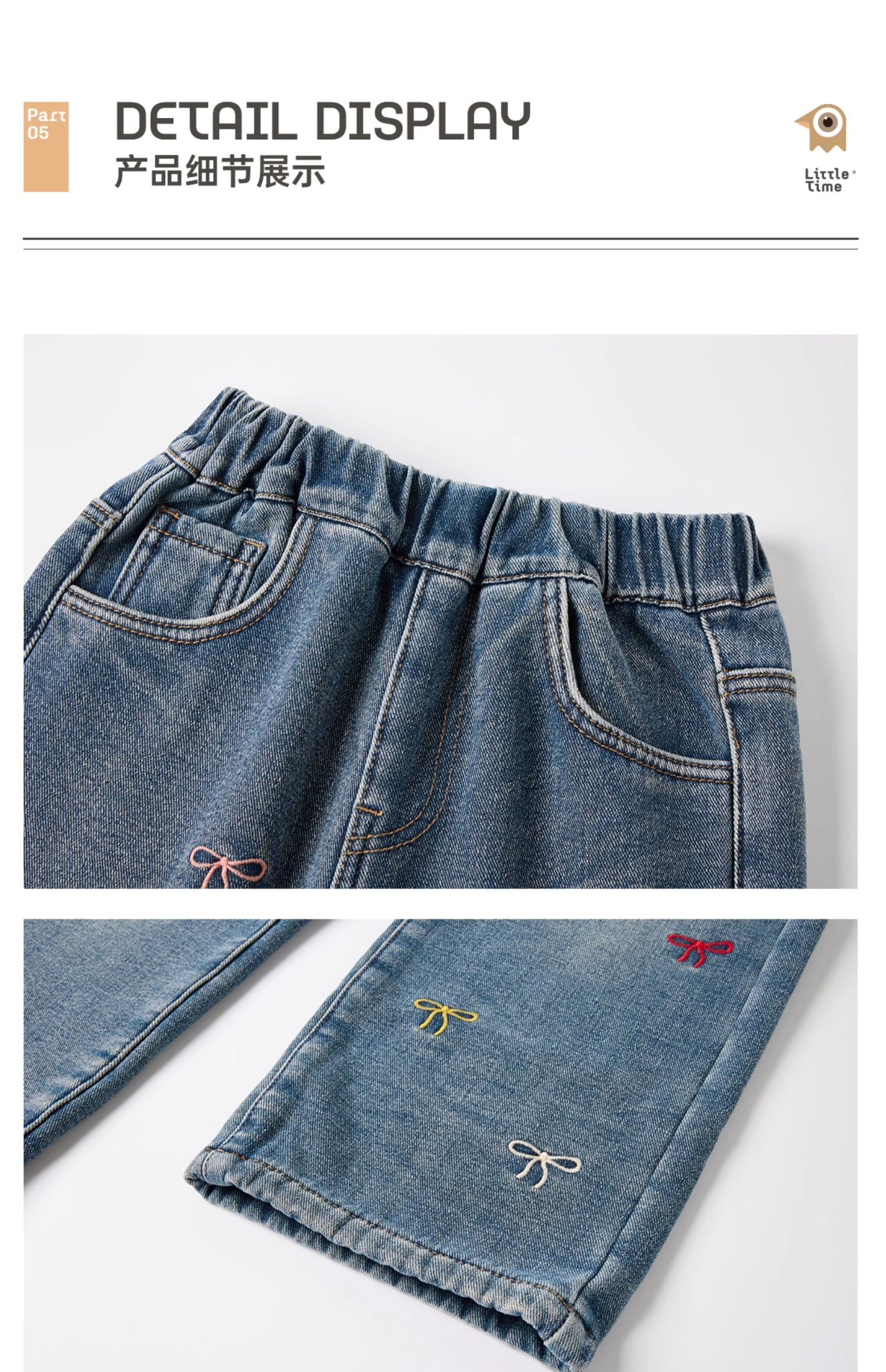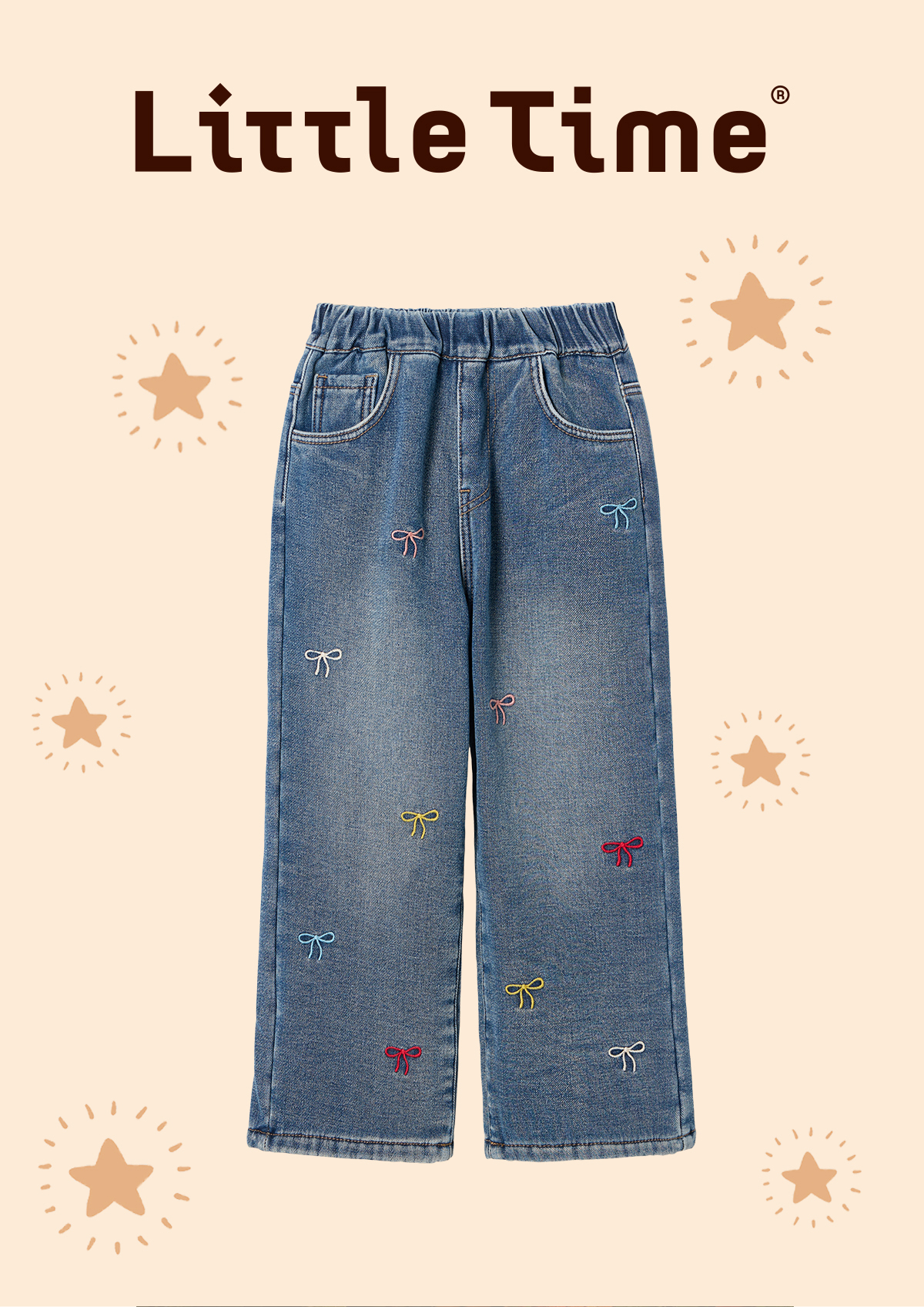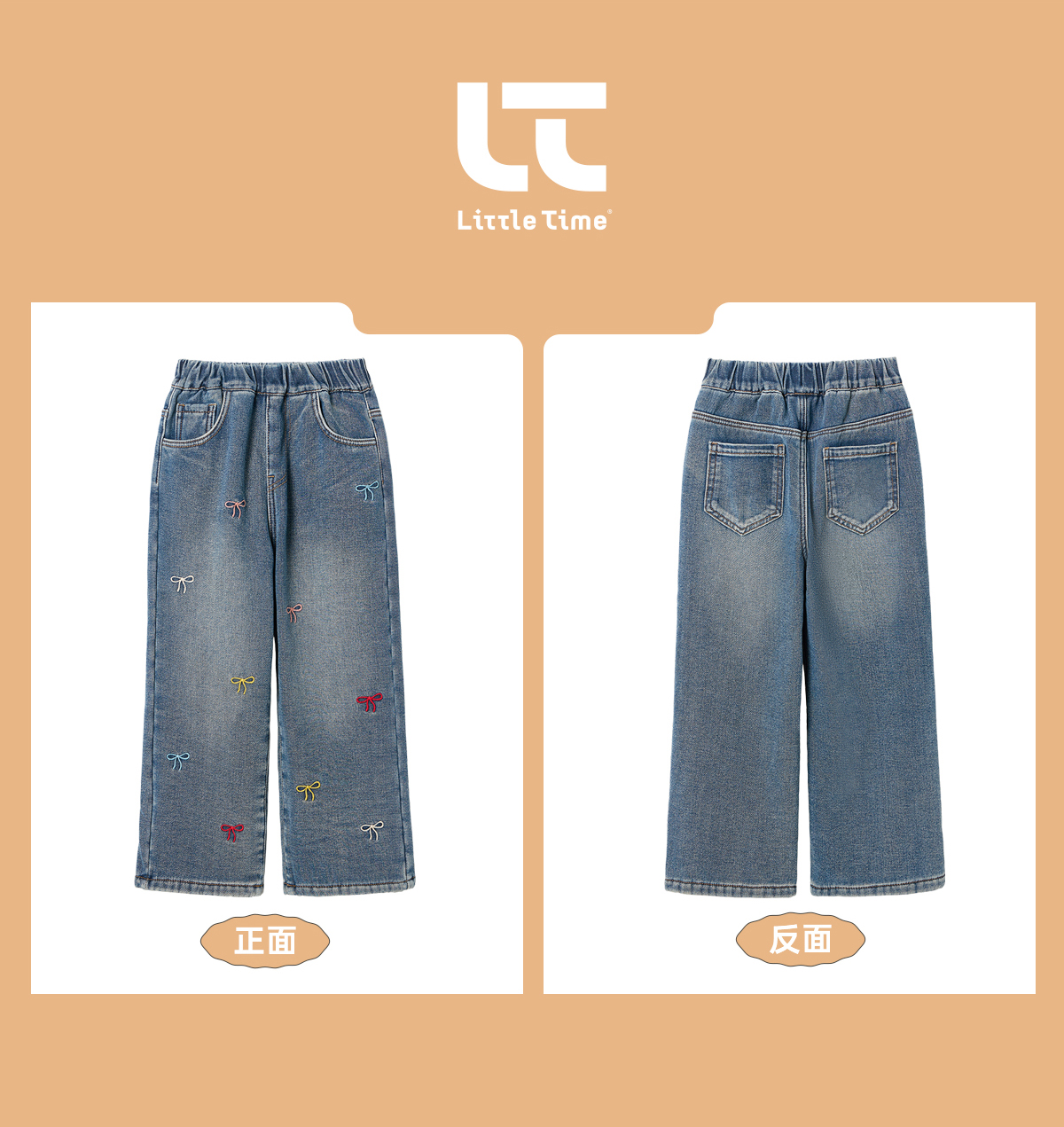 littletime女童牛仔裤秋冬加绒宽松长裤2024新款刺绣儿童直筒裤子