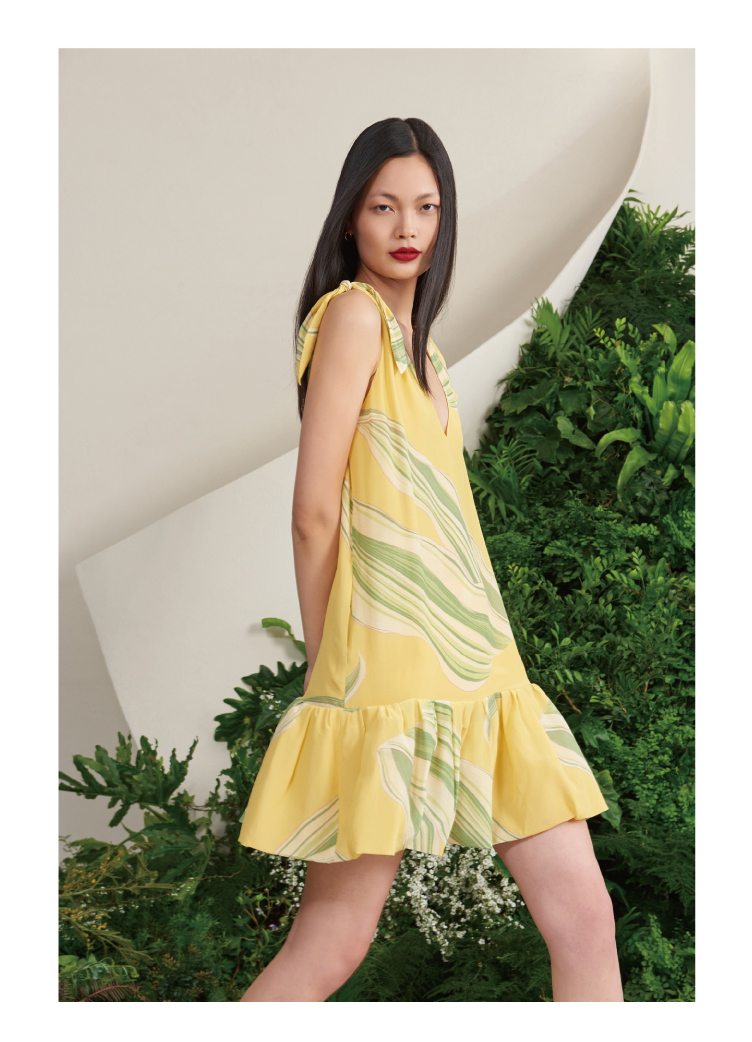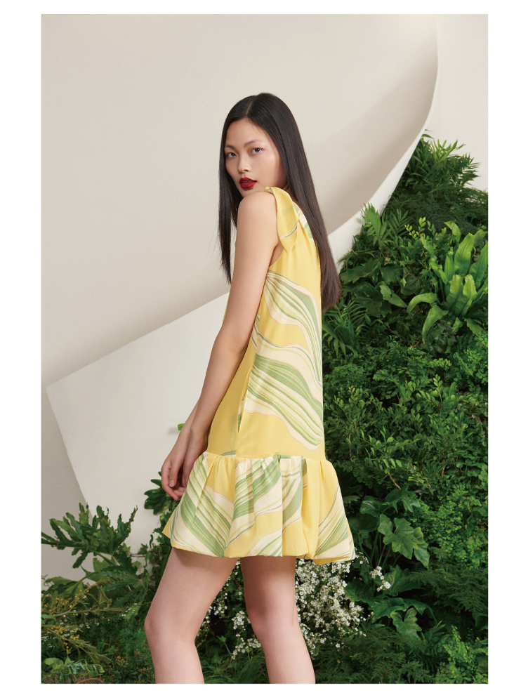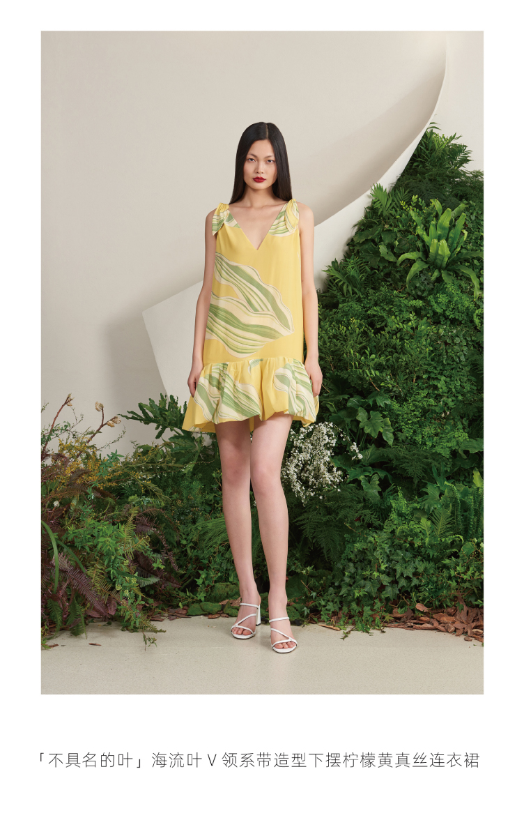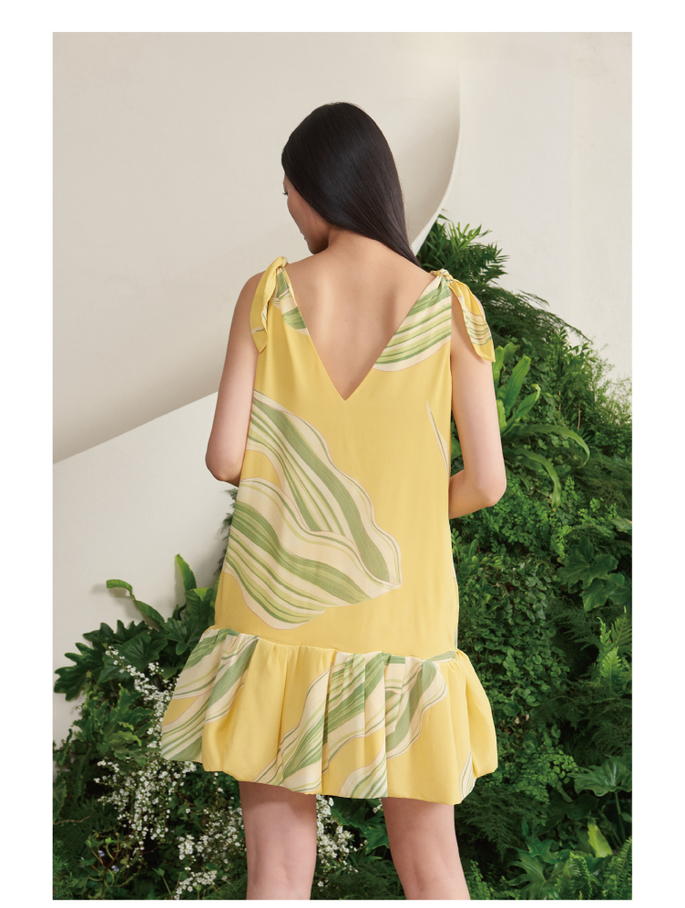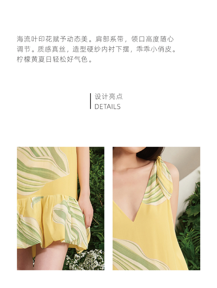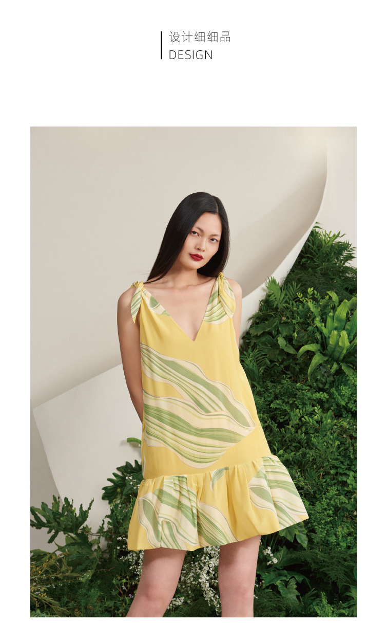 【不具名的叶】海流叶V领系带造型下摆柠檬黄真丝连衣裙/0000702E