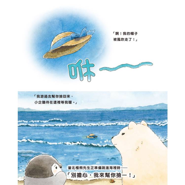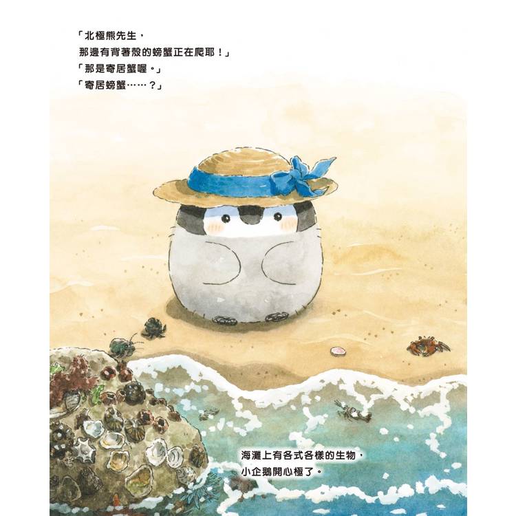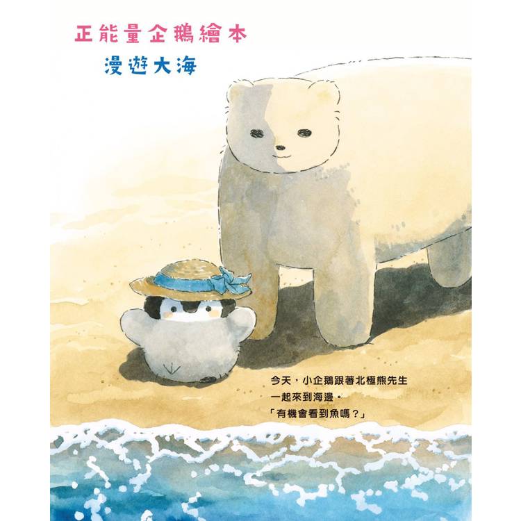 有一天,小企鵝跟著北極熊先生一起來到海邊。
