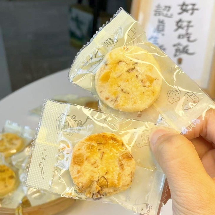 这个杏仁酥是用杏仁碎制作而成,用了很多的杏仁喔! 每一块都有大颗大颗的杏仁果粒,吃起来超满足!