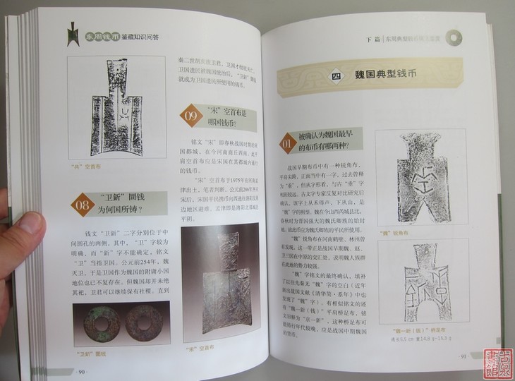 《东周钱币鉴藏知识问答》一书从东周时期集市管理制度﹑交易方式的发展变化,钱币铸造﹑流通的时代背景﹑东周钱币研究未解领域等几个方面对东周钱币历史进行分析;还对不同形制的钱币出土于同一窖藏中的现象作了合理解释;以钱币分析为依据对东周历史,特别是东周平民的历史进行了细致描述。该书以翔实的史料为基础,结合先秦时期的文献资料较为全面系统地阐述了东周时期钱币的起源、在集市中的应用形式、分布、流通历程,并列出众多地理名称的古今对照,较为详细地介绍了周﹑燕﹑楚﹑齐﹑秦等典型钱币铭文。