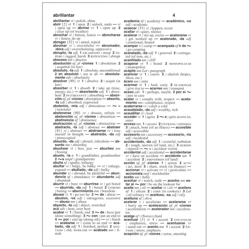适用于4-12年级学生。这本畅销的西班牙语-英语词典新版定义了拉丁美洲西班牙语和美式英语的核心词汇。这本双向词典包含西班牙语-英语和英语-西班牙语两个部分,是西班牙语和英语初学者学习语言的理想资源。