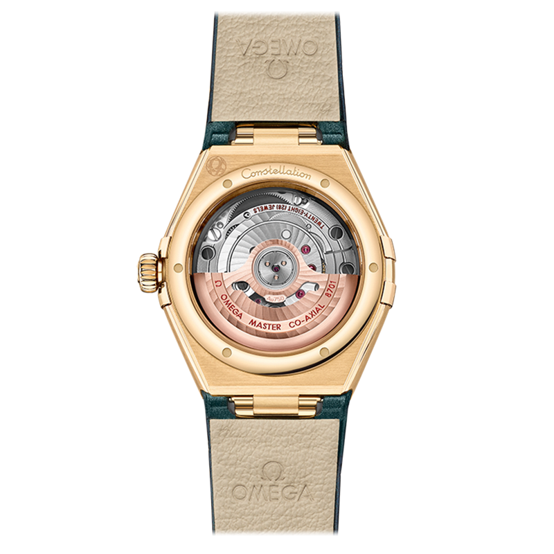 镜面材质 | 蓝宝石水晶玻璃 | 表盘 | 黄色18K金表壳 表圈镌刻罗马数字时标,珍珠母贝表盘饰有钻石小时刻度,6点位设有日历窗。 指针、欧米茄品牌标识、星徽标志以及钻石托槽采用黄色18K金制成。 |