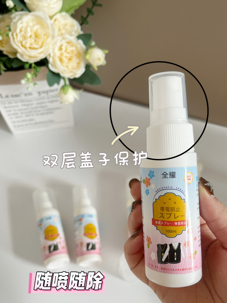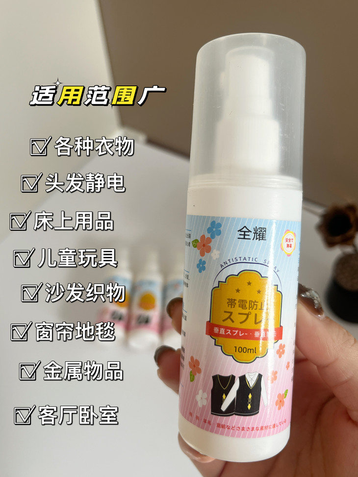 【全耀防静电喷雾】 效果真的没的还说,喷完以后真的没有静电 什么成分的咱就不说了,说了也不懂 就知道喷完后没被电了你说神奇不神奇 最让我佩服的就是它这个还是长时间的防静电 把去年收起来的毛衣统统拿出来都喷了一遍, 衣服都变柔顺了 喷完以后压箱底的味道都没有了! 闻着一股淡淡的清新香味 建议每个家庭都准备一瓶,真的是刚需!