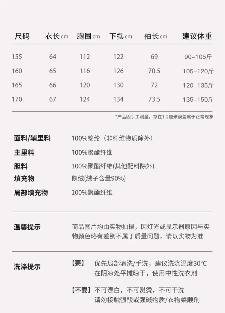 【尺码】155-170【建议尺码】155(90-105斤)160(105-120斤)165(120-135斤)170(135-150斤)【材质】面料/辅里料:100%锦纶 (非纤维物质除外)主里料:100%聚酯纤维胆料:100%聚酯纤维 (其他配料除外)填充物:鹅绒(绒子含量90%)(局部填充物:100%聚酯纤维)【充绒量】155/130g 160/136g 165/142g 170/148g