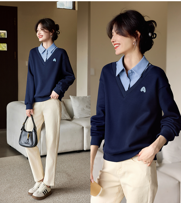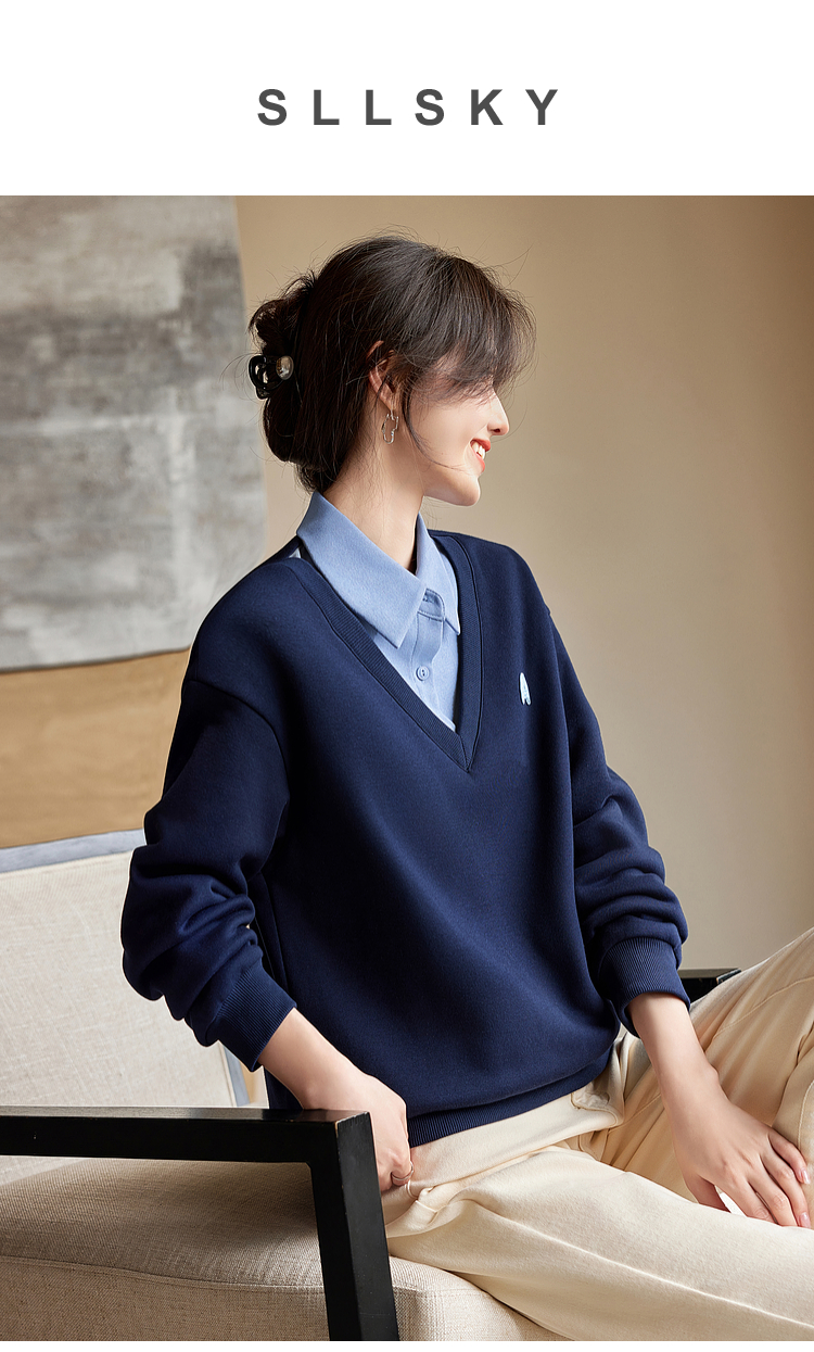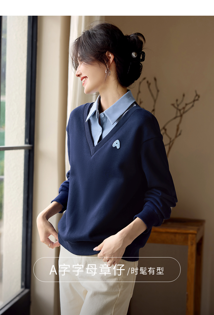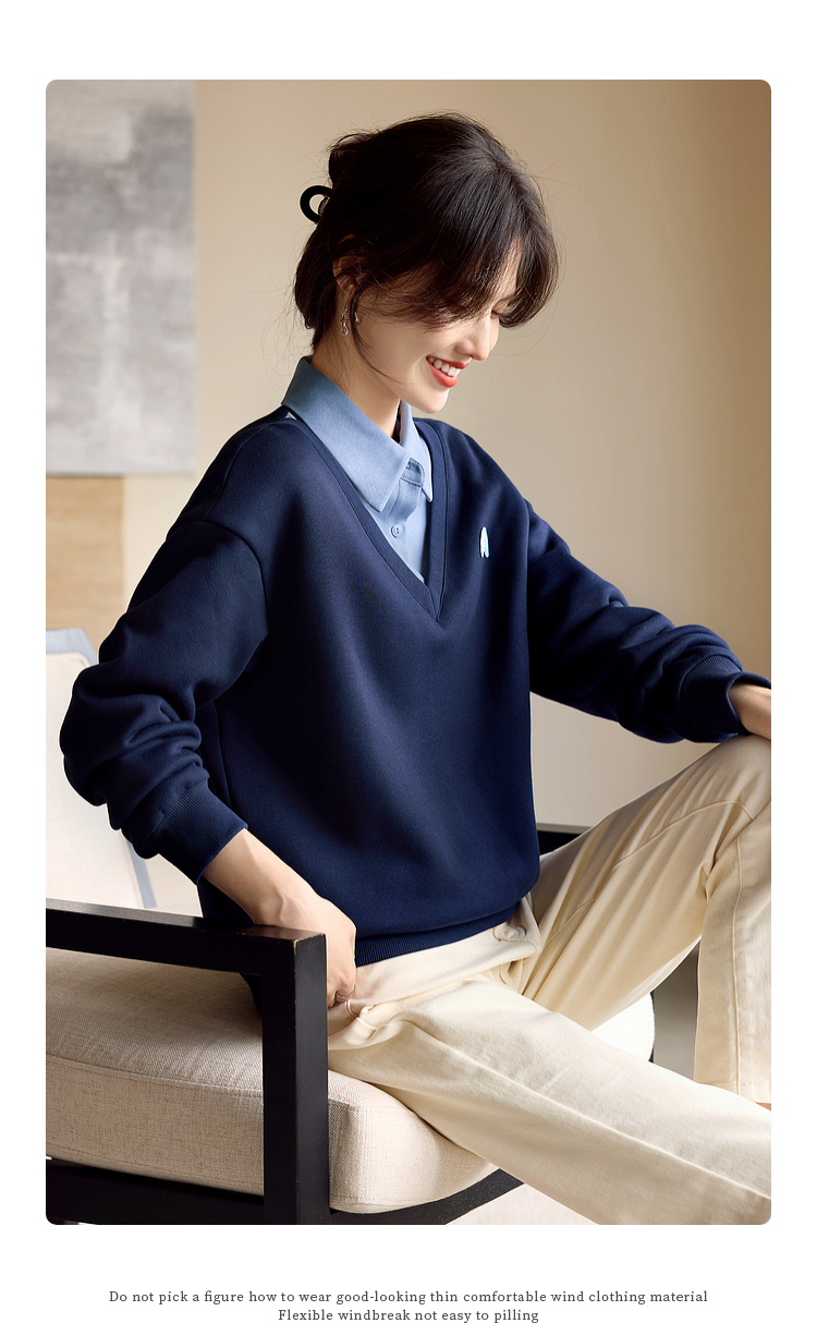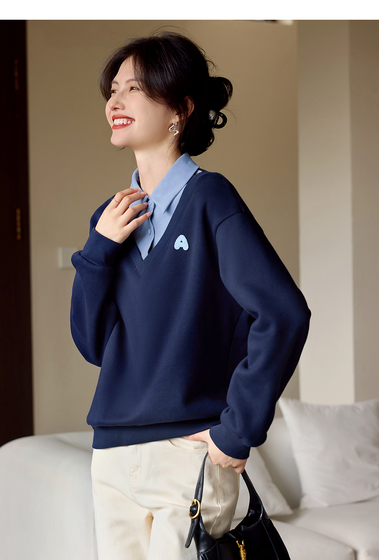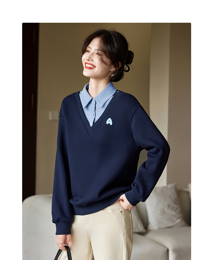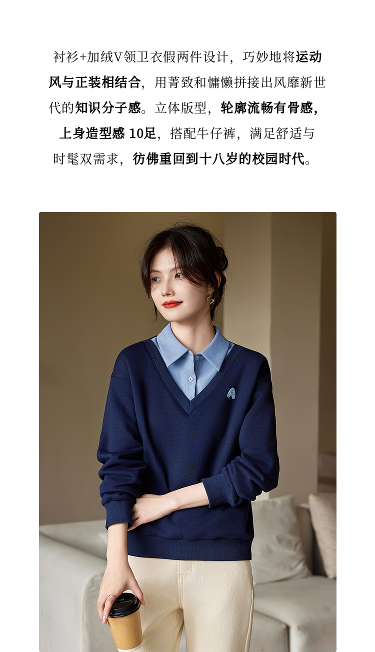 【专属特价】熙世界衬衫翻领假两件卫衣女加绒加厚秋冬学院风套头休闲宽松上衣