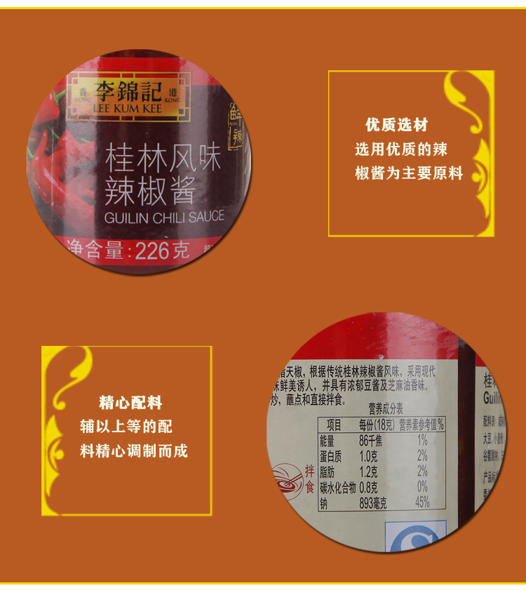 李锦记 桂林风味辣椒酱,精选优质指天椒,根据传统桂林辣椒酱风味, 采用现代工艺精制而成。辣味劲道,复合味鲜美诱人,并具有浓郁豆 酱及芝麻油香味。用于烹饪各种食材,适合小炒、蘸点和直接 拌食。 |