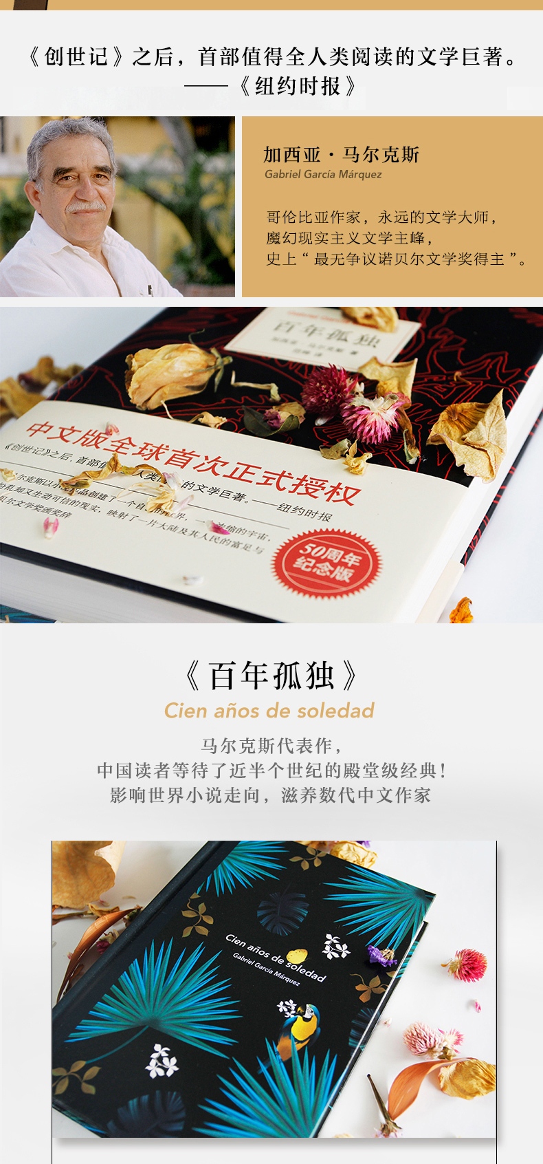 加西亚·马尔克斯著的《百年孤独》是魔幻现实主义文学的代表作,描写了布恩迪亚家族七代人的传奇故事,以及加勒比海沿岸小镇马孔多的百年兴衰,反映了拉丁美洲一个世纪以来风云变幻的历史。作品融入神话传说、民间故事、宗教典故等因素,巧妙地糅合了现实与虚幻,展现出一个瑰丽的想象世界,成为20世纪重要的经典文学巨著。