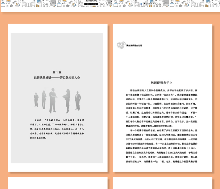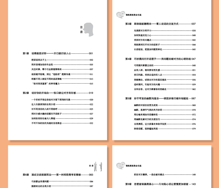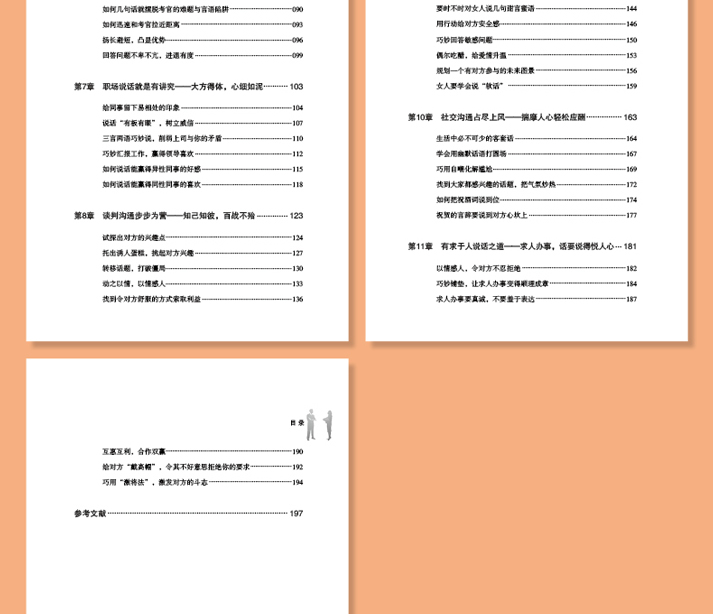 章 说得就是好听——一开口就打动人心 001把话说到点子上 002用术语增加你的专业性 005关注时事,哪个行业都能聊得来 007说话避开险境,别让“危险语”搅黄沟通 011根据不同人制定不同的说话策略 013“你对我很重要”的神奇魔力 015第2章 说好你的开场白——张口就让对方有好感 019一个好的开场让你给对方留下深刻的印象 020让人印象深刻的自我介绍 022对不同身份的人的不同称呼 025用对方感兴趣的话题打开话匣子 027如何恰到好处地与人寒暄 029不可不知的初次沟通的言语禁忌 032第3章 跟谁都能聊得来——看人说话的交流方式 037先观察对方再开口 038如何快速攻克人心 040找到对方的兴趣点 042用祝酒词打开对方的话匣子 044长话短说,把复杂问题简单化 045第4章 巧妙提问打开话匣子——用问题攻破对方的心理防线 047巧用提问掌握主动权048由浅入深,提问要有层次感 051投石问路,找到合适的切入点 054旁敲侧击,试探出对方的真实想法 056适时提问,引起对方的兴趣 059自问自答,让对方跟着你的思路走 062第5章 妙不可言的幽默沟通法——调侃打破冷场尴尬 067幽默的对话往往更见成效 068幽默,是调节气氛的灵丹妙 070用比喻来增加对话趣味性 072用幽默化解对方的无理言行 074自我调侃,让大家喜欢和你开玩笑 076转移话题,扭转尴尬局面 079第6章 面试交谈脱颖而出——时间获得考官青睐 083巧谈薪金待遇问题 084脱颖而出的自我介绍087如何几句话就摆脱考官的难题与言语陷阱 090如何迅速和考官拉近距离 093扬长避短,凸显优势096回答问题不卑不亢,进退有度 099第7章 职场说话就是有讲究——大方得体,心细如泥 3给同事留下易相处的印象 4说话“有板有眼”,树立 7三言两语巧妙说,削弱上与你的矛盾 1巧妙汇报工作,赢得领导喜欢 112如何说话能赢得异性同事的好感 115如何说话能赢得同性同事的喜欢 118第8章 谈判沟通步步为营——知己知彼,战不殆 123试探出对方的兴趣点124托出诱人蛋糕,挑起对方兴趣 127转移话题,打破僵局130动之以情,以情感人133找到令对方舒服的方式索取利益 136抓住对方漏洞,一语击破关键点 140第9章 恋爱蜜语赢得真心——几句贴心话让爱情更加甜蜜 143要时不时对女人说几句甜言蜜语 144用行动给对方安全感146巧妙回答敏感问题 150偶尔吃醋,给爱情升温 153规划一个有对方参与的未来图景 156女人要学会说“软话” 159第章 沟通占尽上风——揣摩人心轻松应酬 163生活中必不可少的客套话 164学会用幽默话语打圆场 167巧用自嘲化解尴尬 169找到大家都感兴趣的话题,把气氛炒热 172如何把祝酒词说到位174祝贺的言辞要说到对方心坎上 1771章 有求于人说话之道——求人办事,话要说得悦人心 181以情感人,令对方不忍拒绝 182巧妙铺垫,让求人办事变得顺理成章 184求人办事要真诚,不要羞于表达 187互惠互利,合作双赢190给对方“戴高帽”,令其不好意思拒绝你的要求 192巧用“激将法”,激发对方的斗志 194参考文献 197