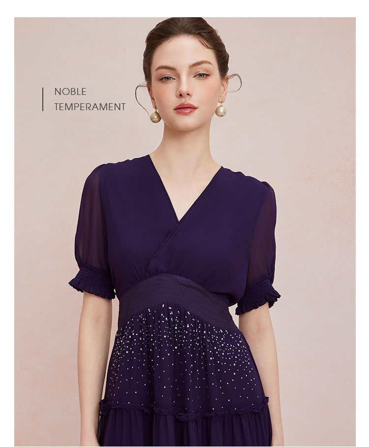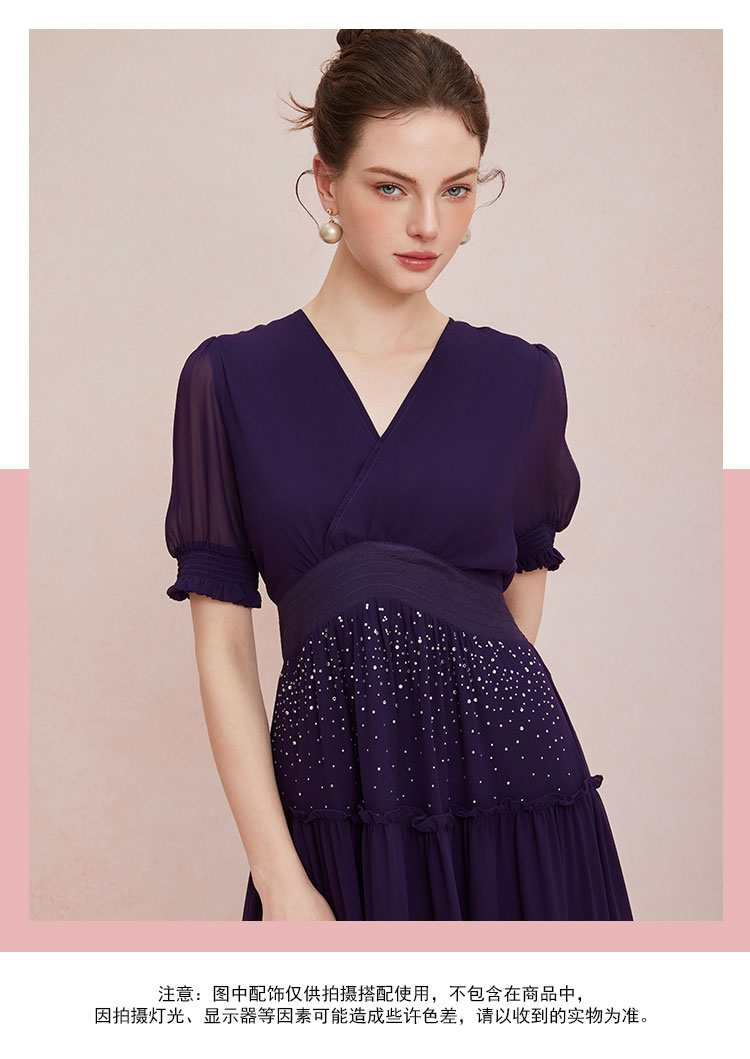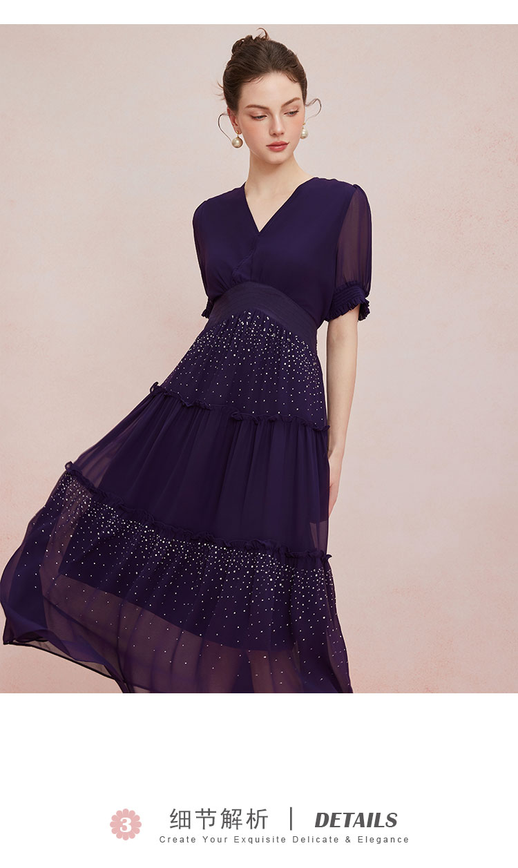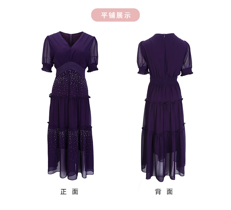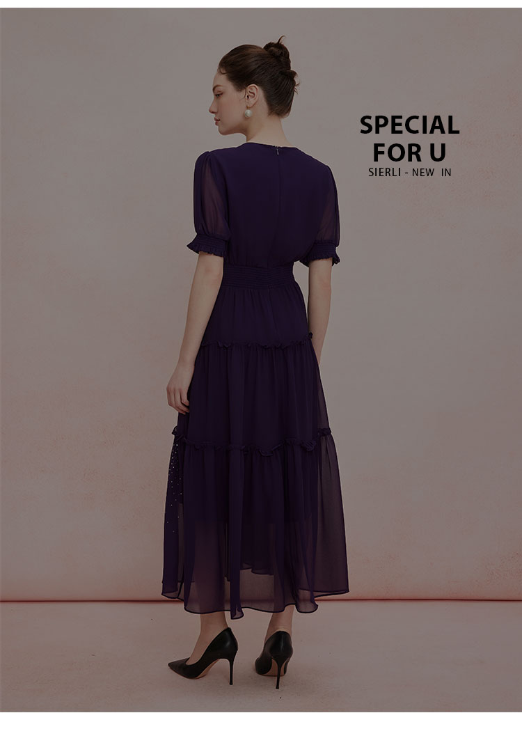 QF891斯尔丽25新款法式浪漫高腰节蛋糕收褶烫钻后腰超细橡筋显瘦连衣裙