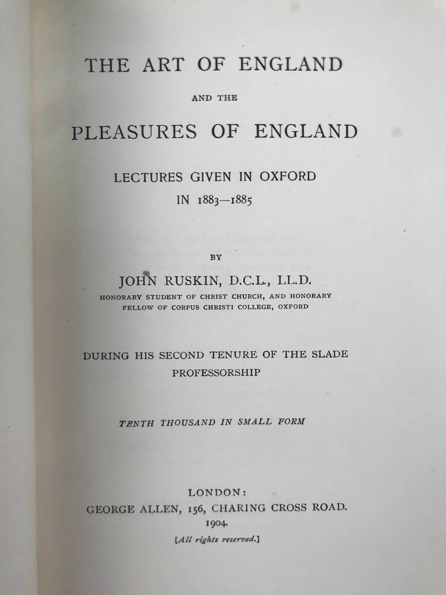 札尼斯朵夫工坊特装本!含藏书票!1904年 约翰·罗斯金《英格兰艺术/英格兰的愉悦之处》 全真皮精装32开