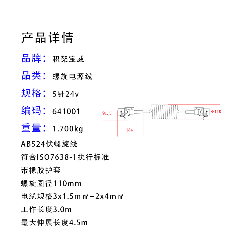 ABS螺旋电源线 ISO7638主挂连接线5芯5P24V 积架宝威641001(包邮)