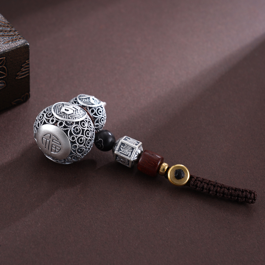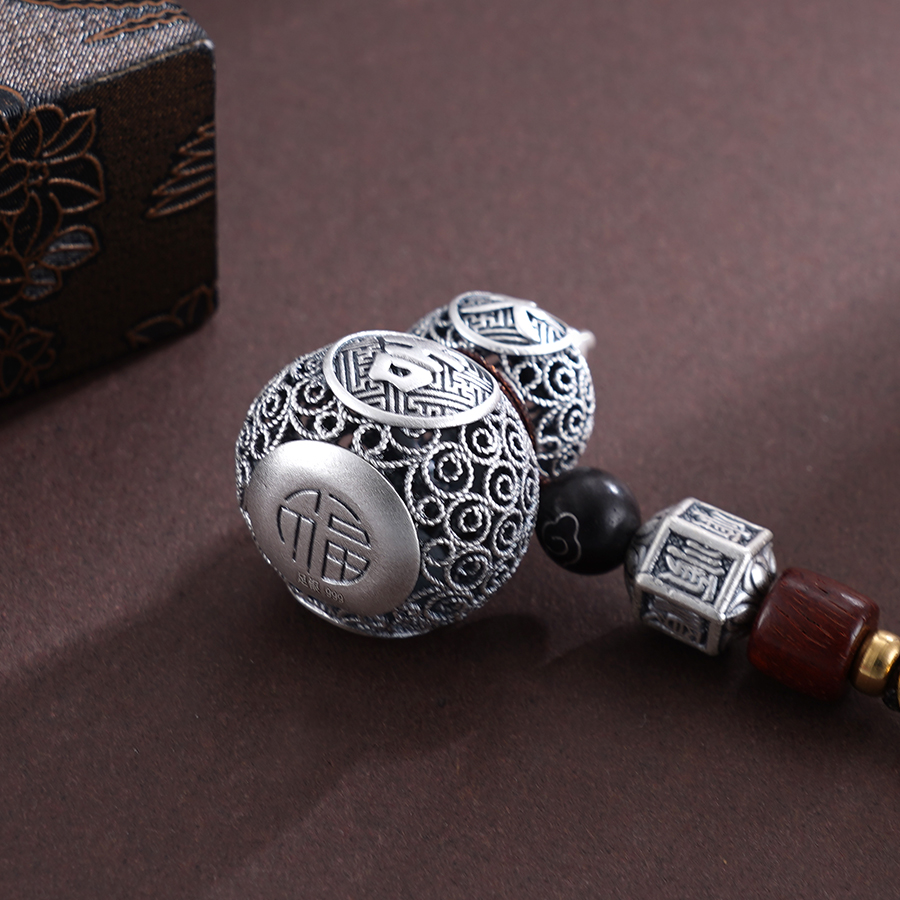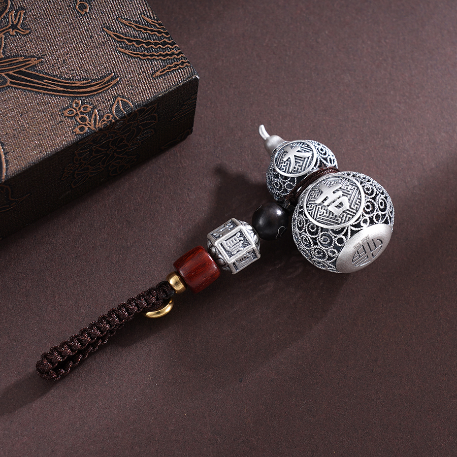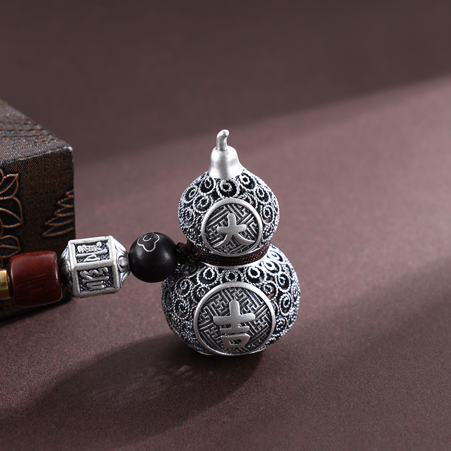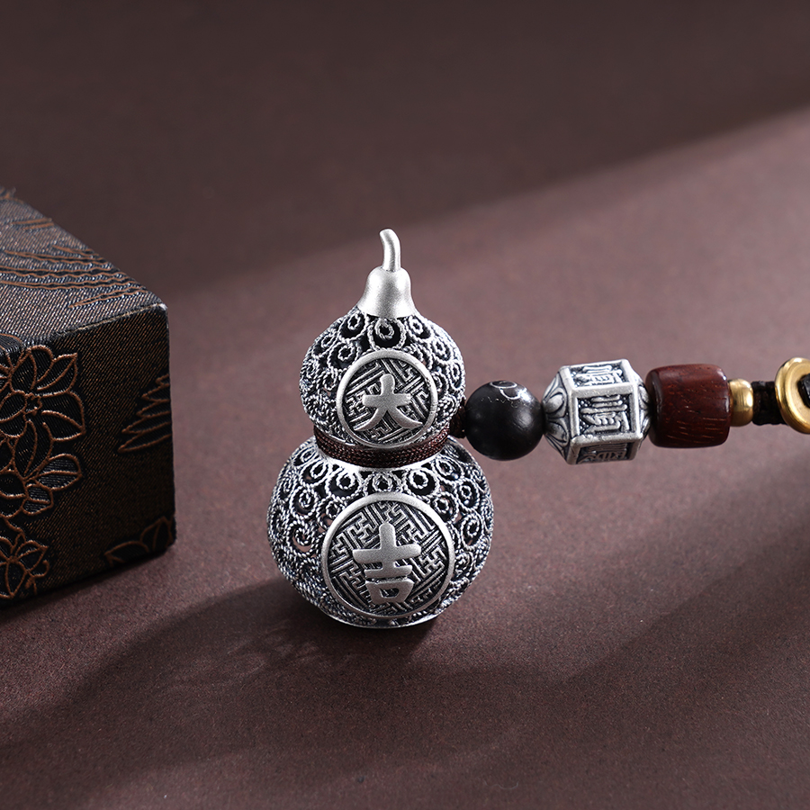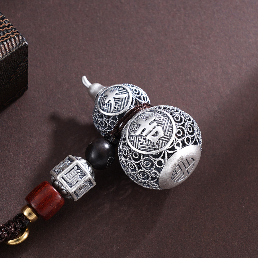 【寓意】:作品以葫芦为灵感设计,应用银花丝工艺编织而成,整体造型饱满立体,葫芦之上点缀着“大吉”二字,底部则錾刻有福字,寓意大吉大顺,福吉双临。