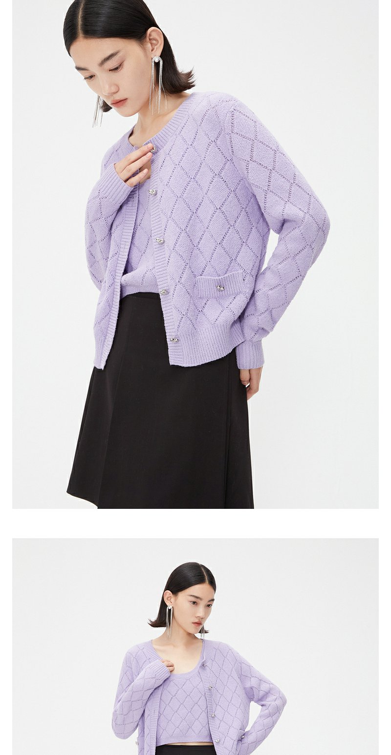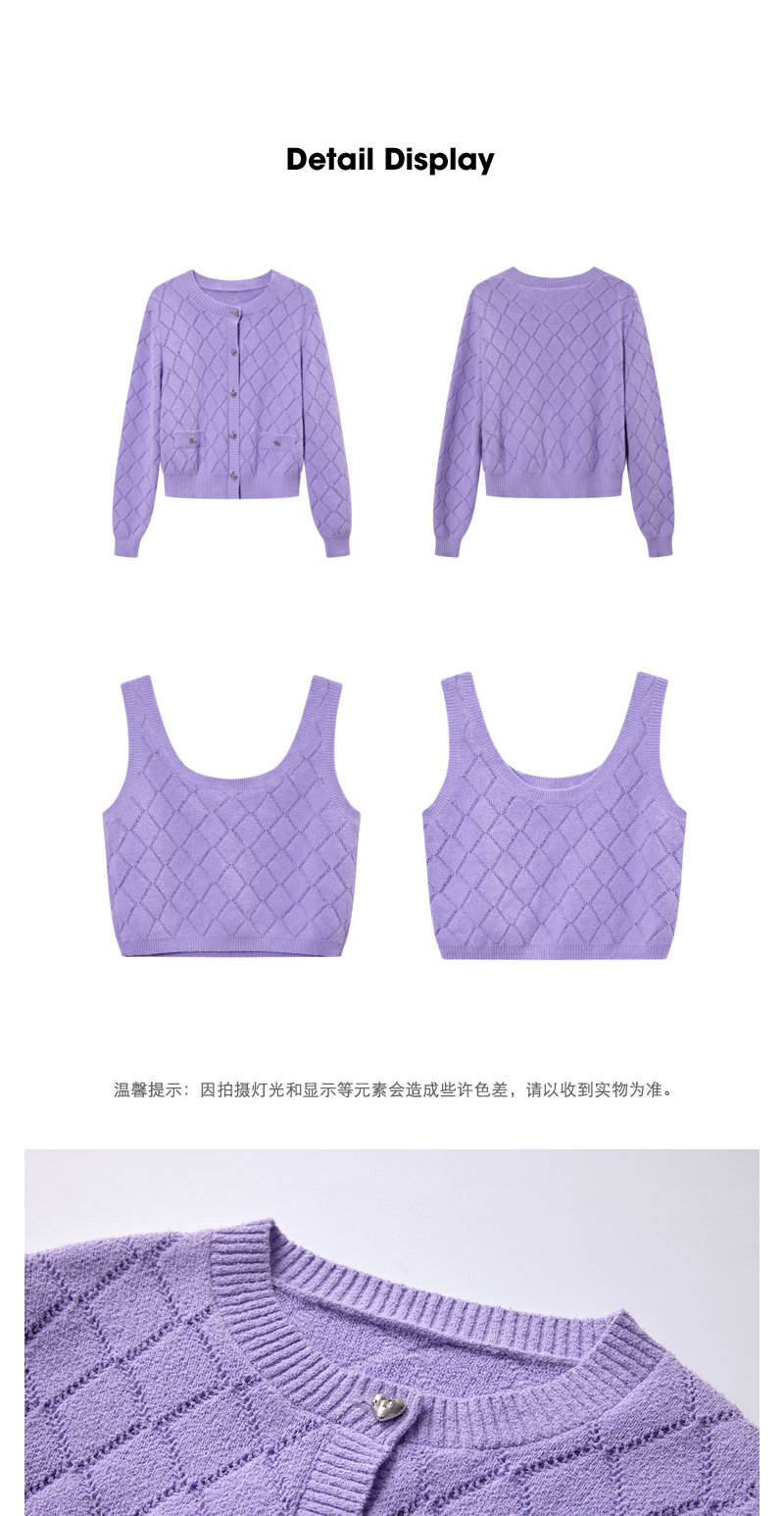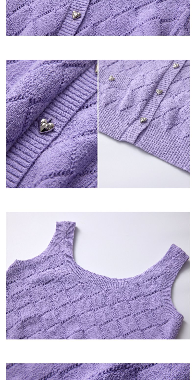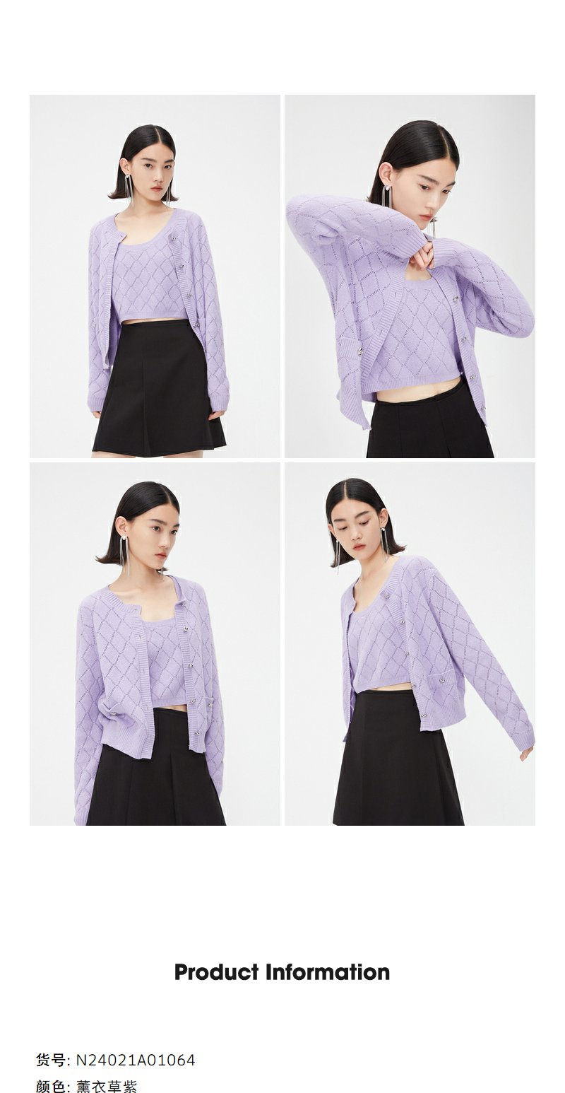NEELLY纳俪商场同款春季针织开衫套装女紫色圆领爱心纽扣吊带背心N24021A01064