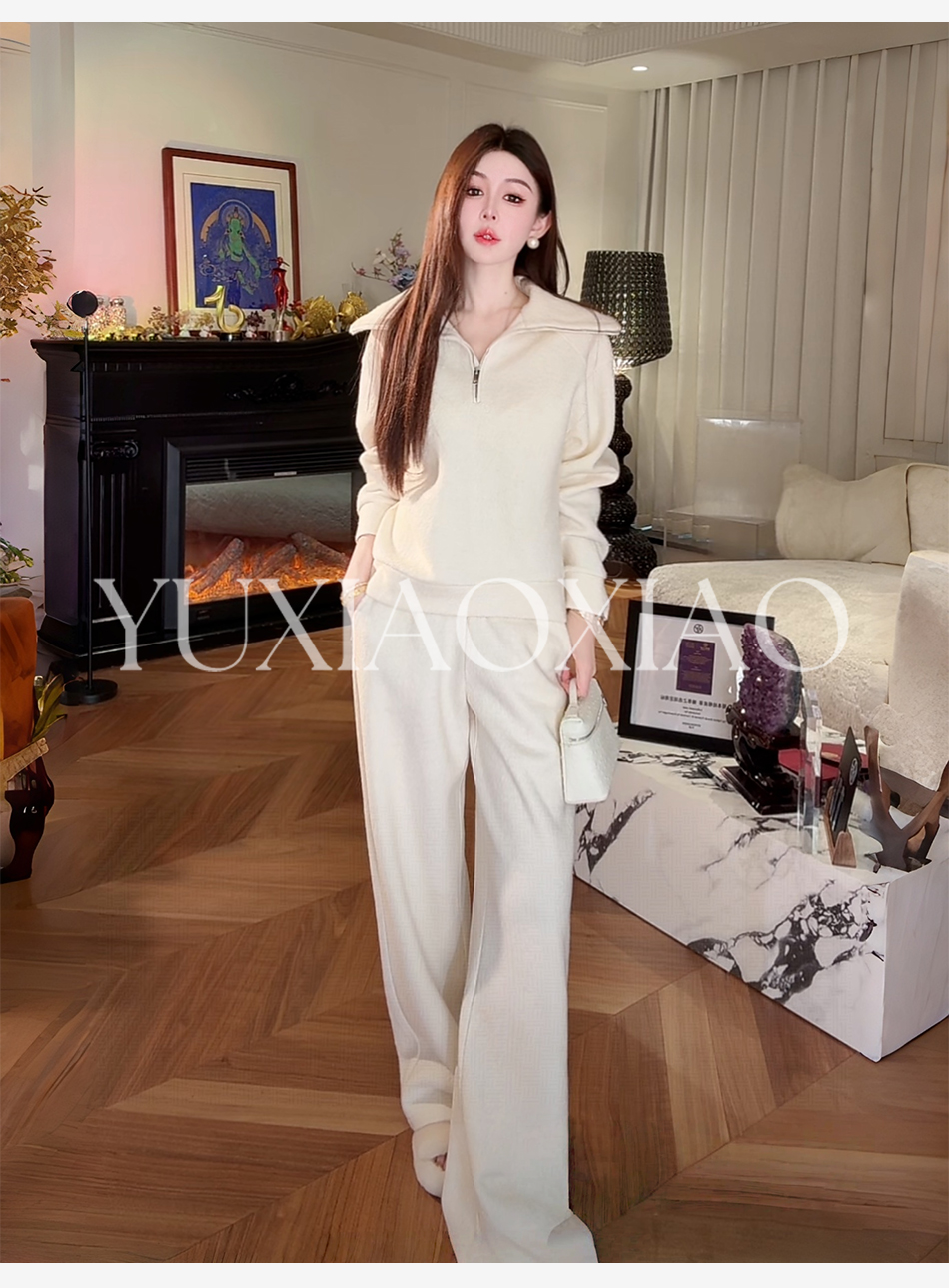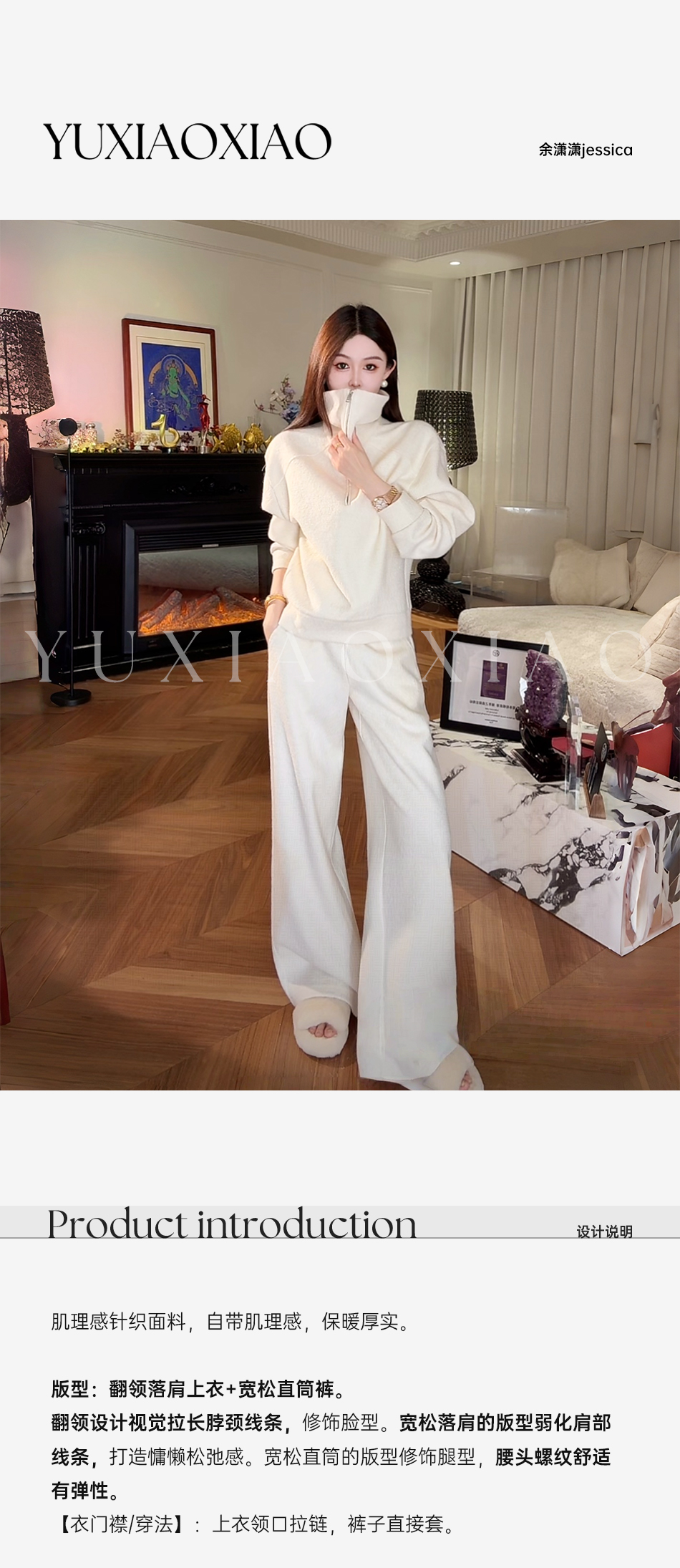 余潇潇【漫调老钱】含羊毛混纺肌理感落肩上衣&宽松直筒裤套装