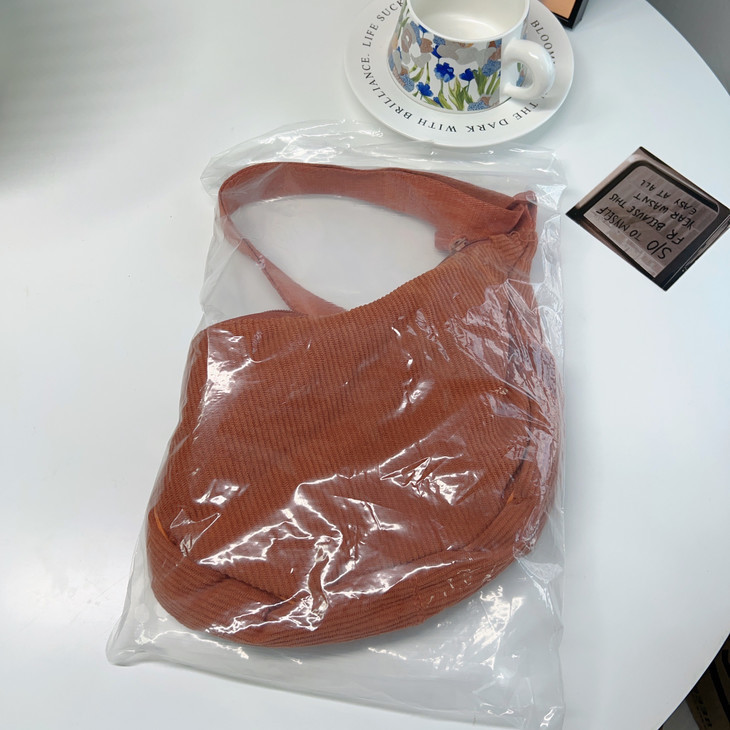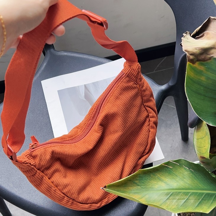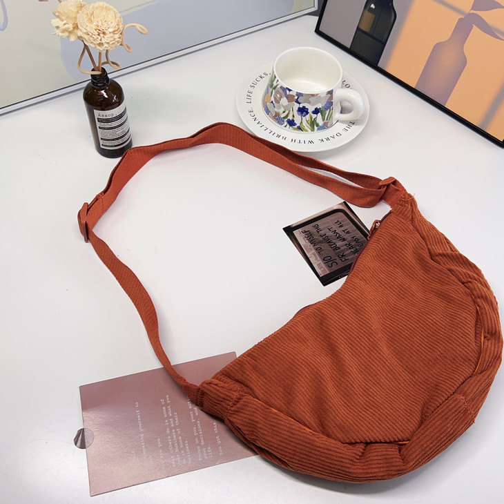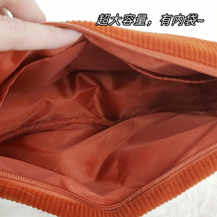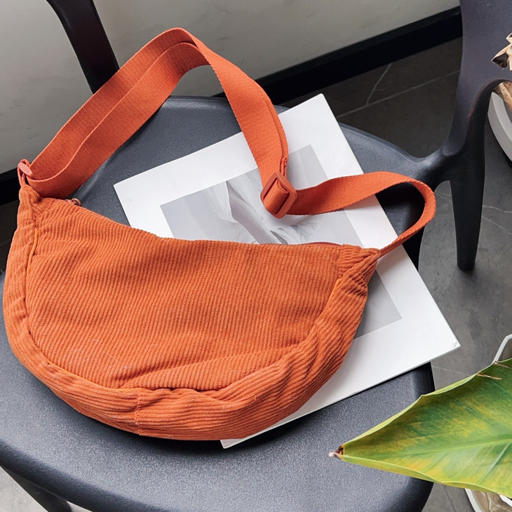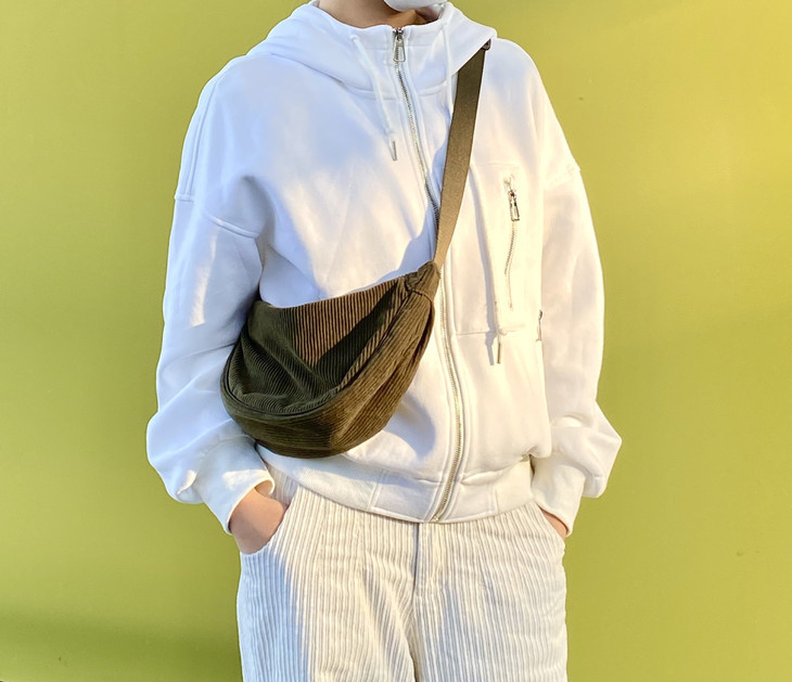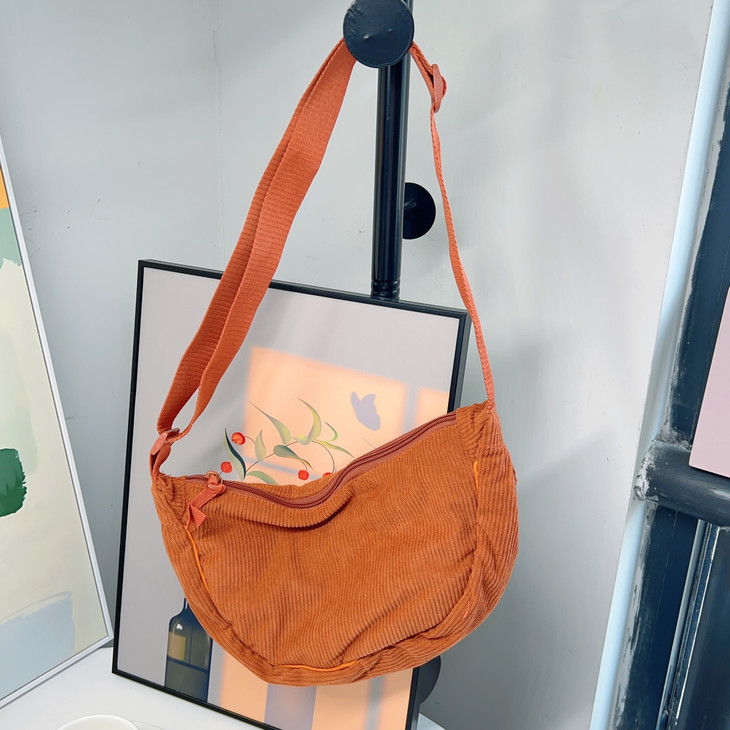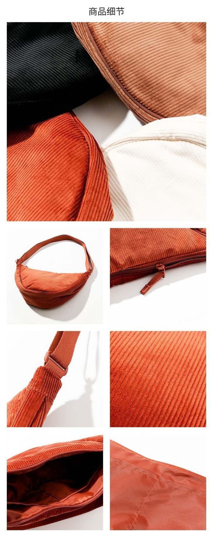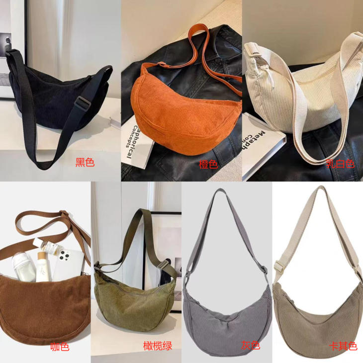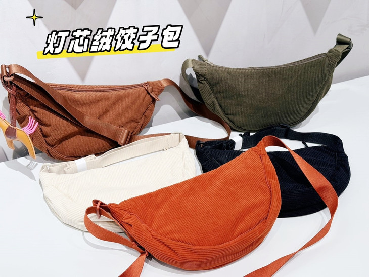 一一灯芯绒饺子包 颜色本白色,神秘黑,焦糖橘,摩卡棕,橄榄绿、卡其、灰色 重量约115g 尺寸宽30cm*高16cm*厚8cm 饺子造型,随意又随性,经典又实用! 灯芯绒面料款式,手感弹滑柔软、绒条清晰圆润、光泽柔和均匀、厚实且耐磨!