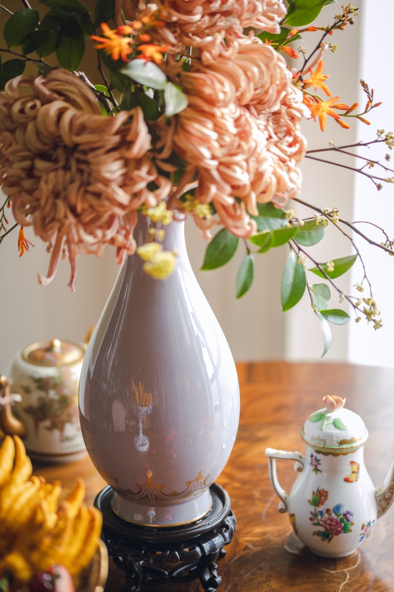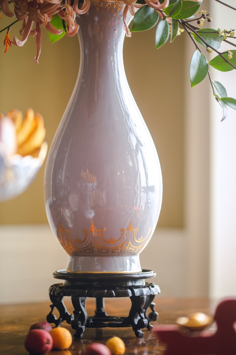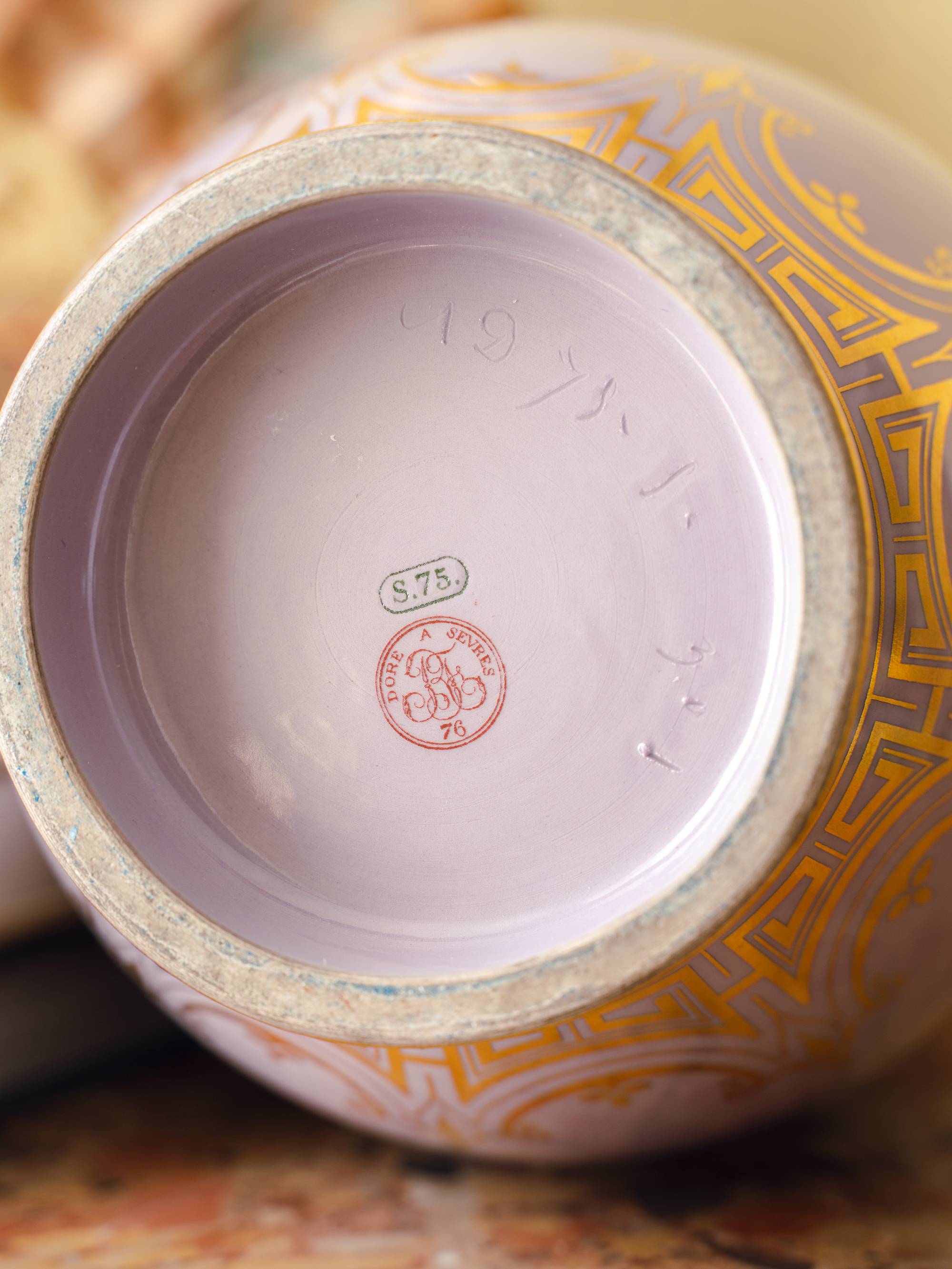 独角鹿西洋古董1875-1876年代法国御窑塞弗尔签名出品手绘描金阿拉伯花卉纹装饰粉紫变色釉瓷花瓶一对