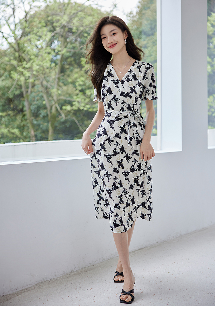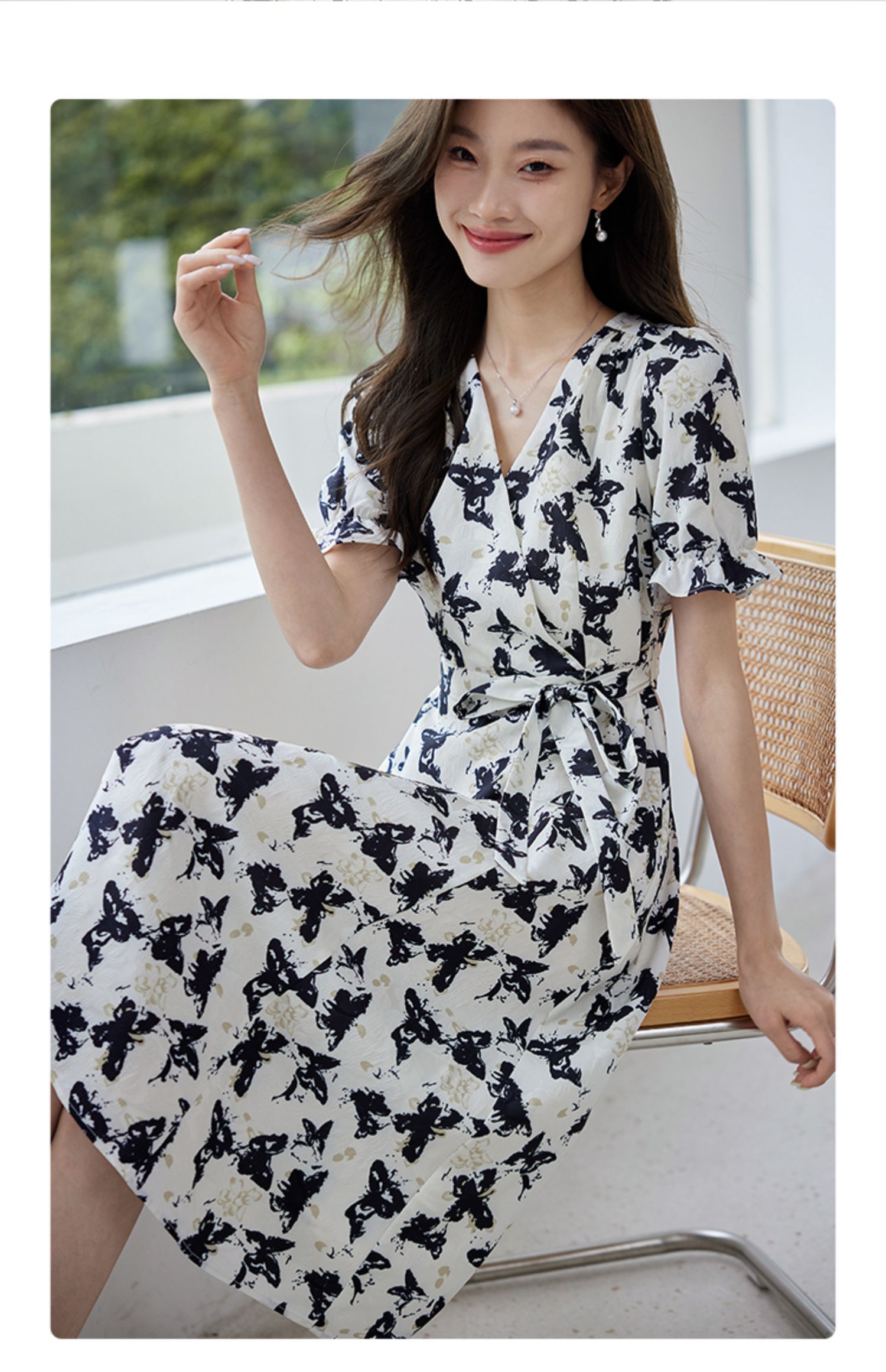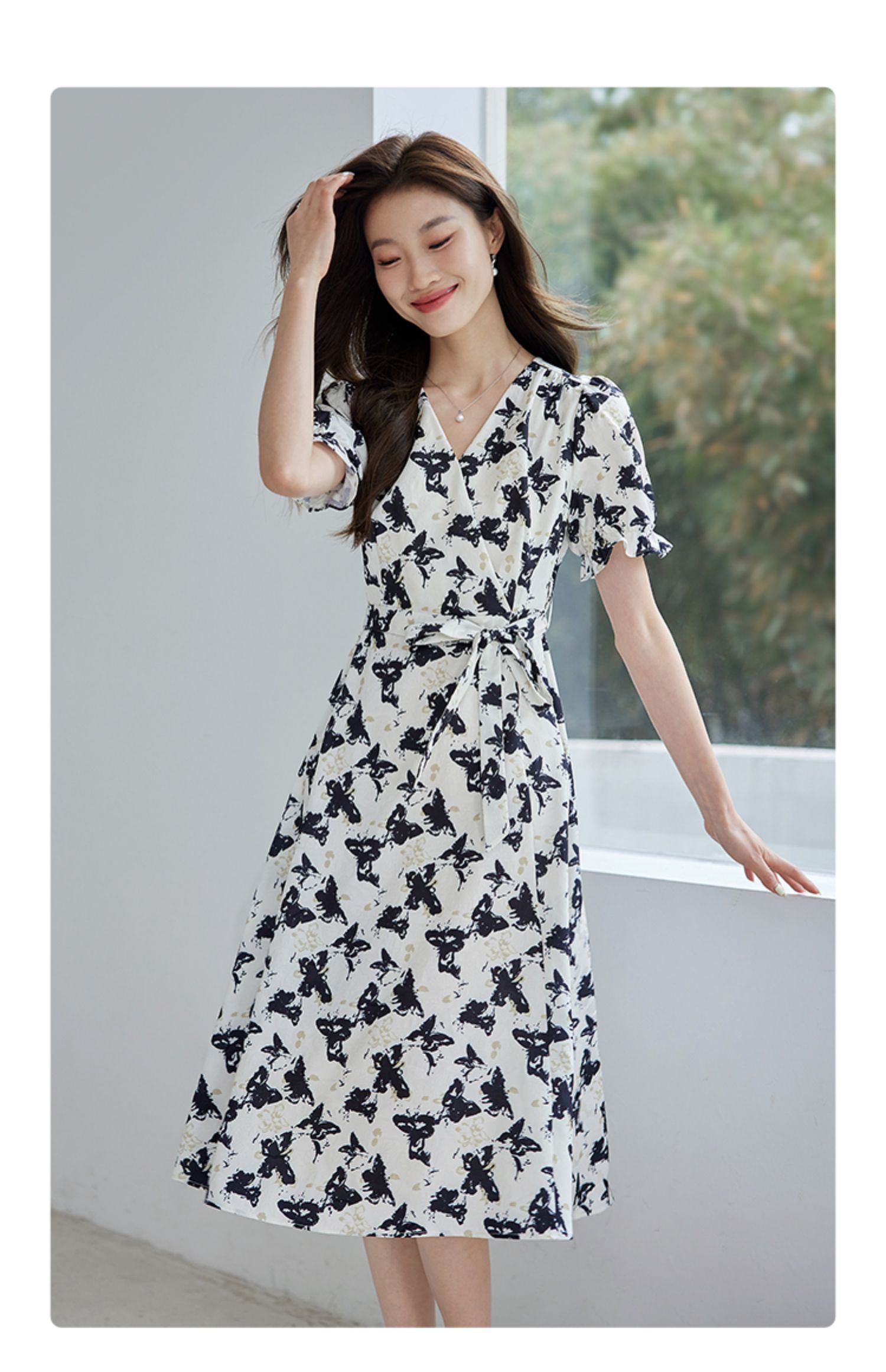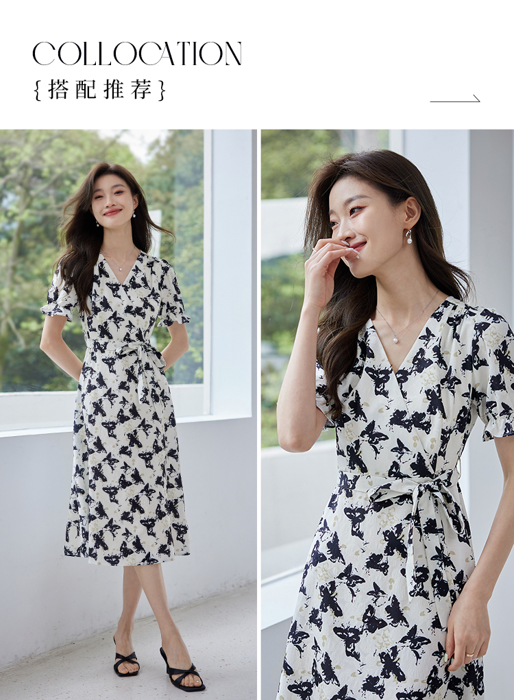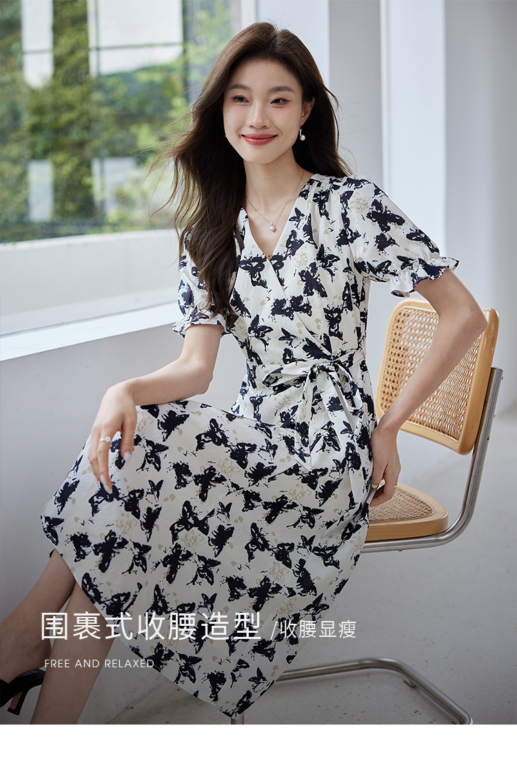 【专属特价】熙世界蝴蝶水墨印花V领连衣裙夏季新款复古轻熟风法式收腰裙子