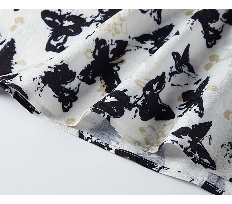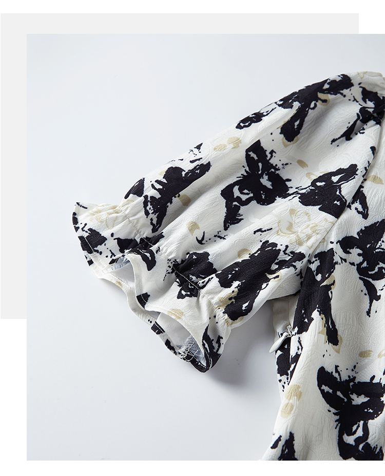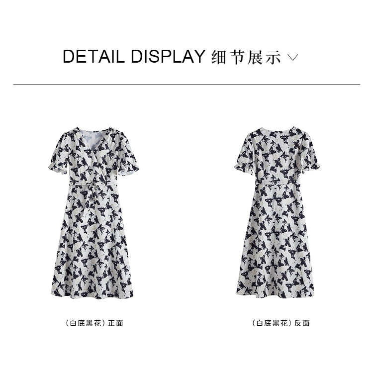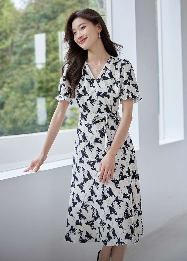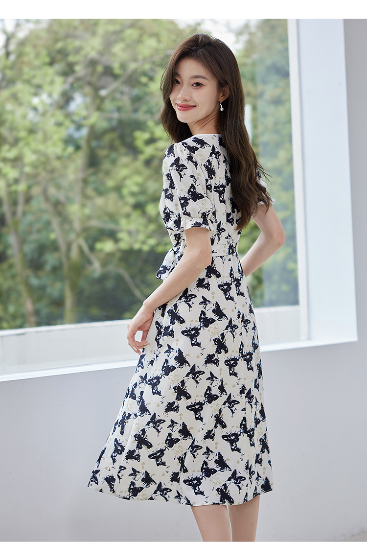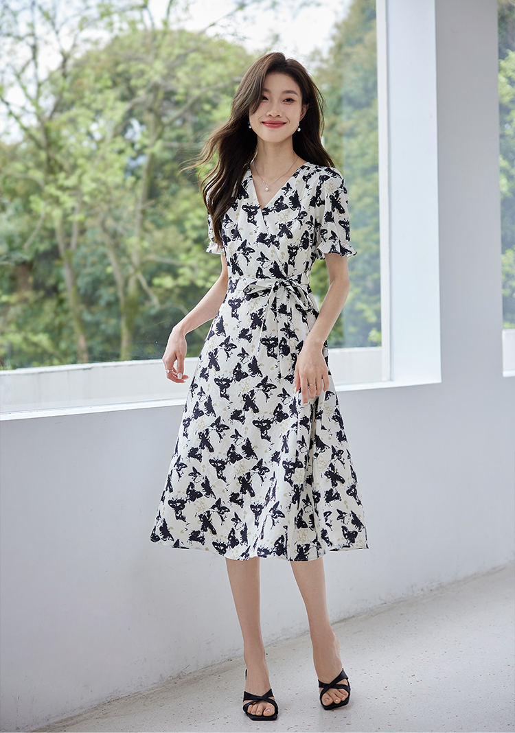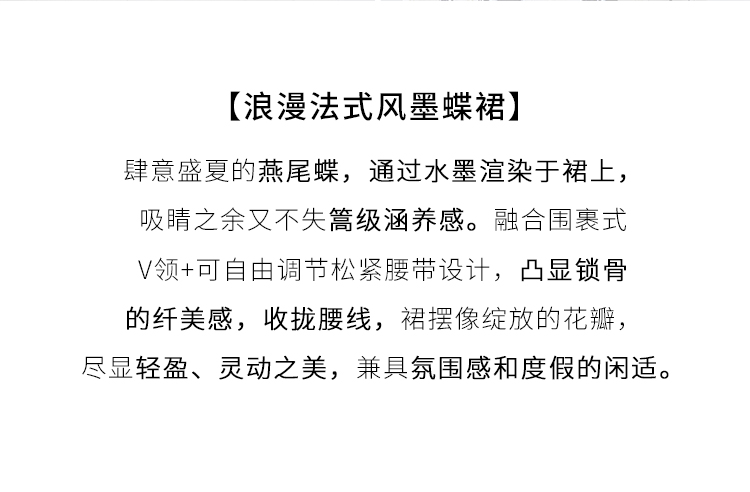 【专属特价】熙世界蝴蝶水墨印花V领连衣裙夏季新款复古轻熟风法式收腰裙子