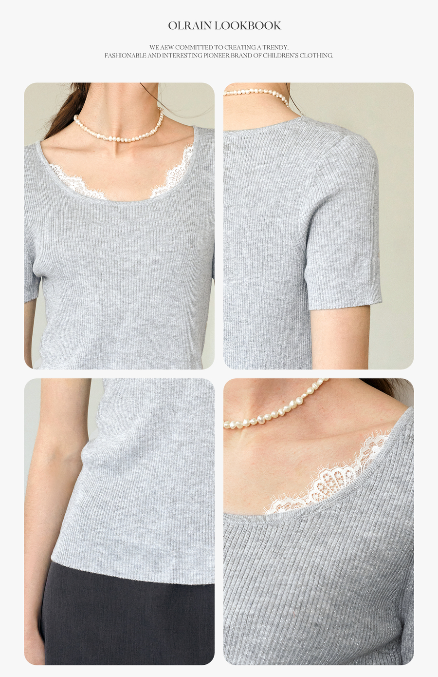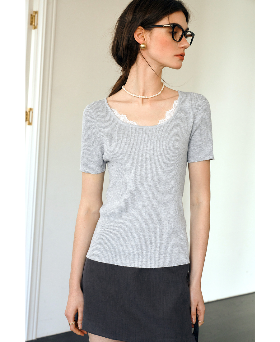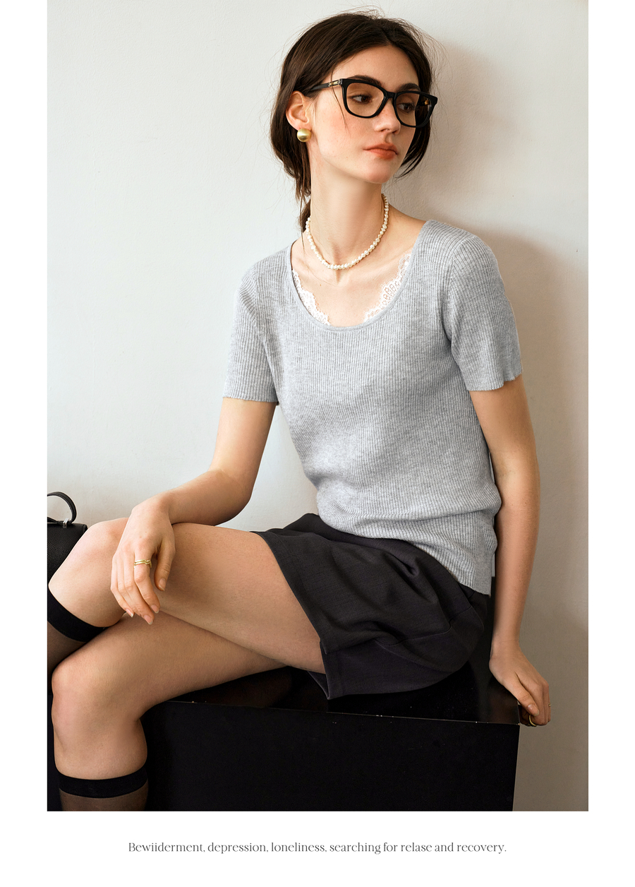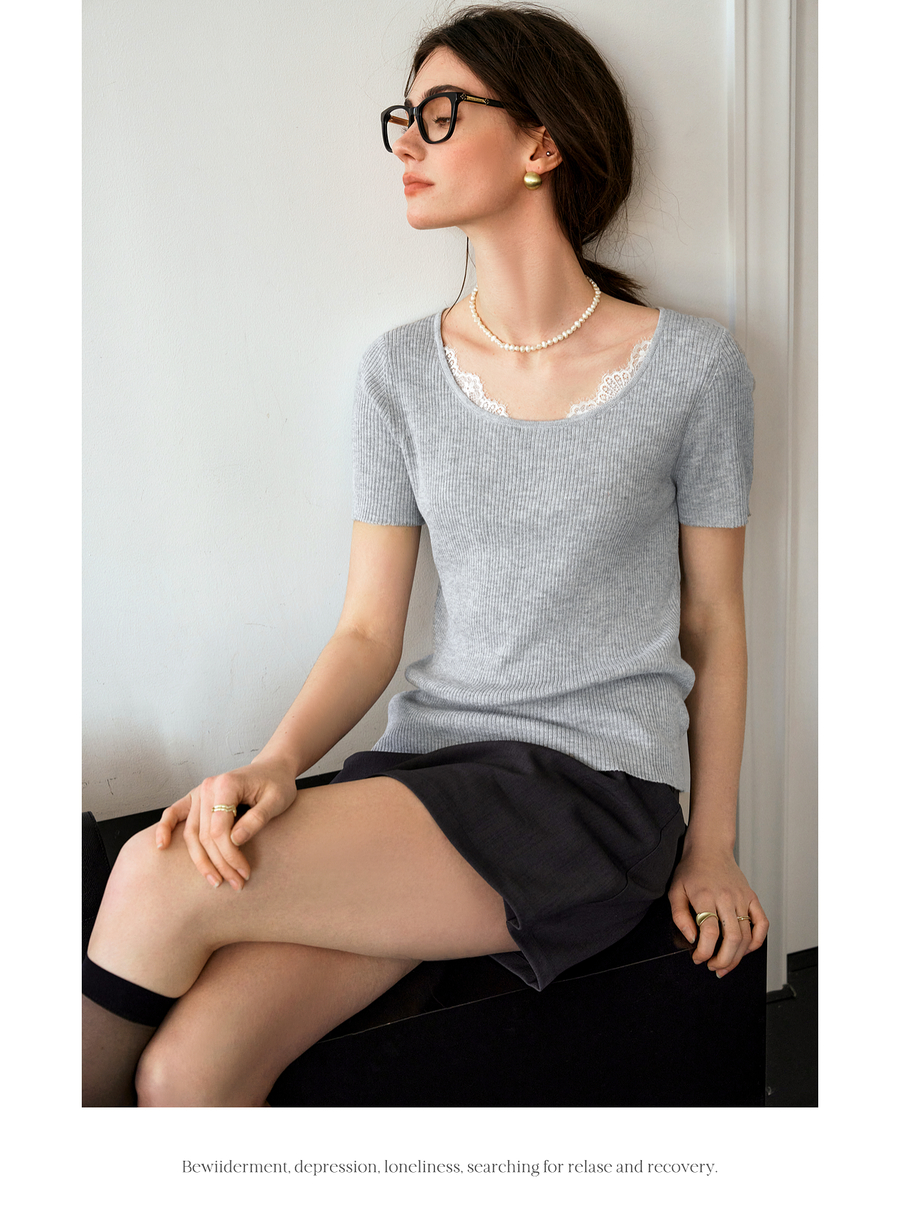 欧芮儿2025夏季新款蕾丝拼接圆领短袖针织正肩T恤女甜美简约上衣