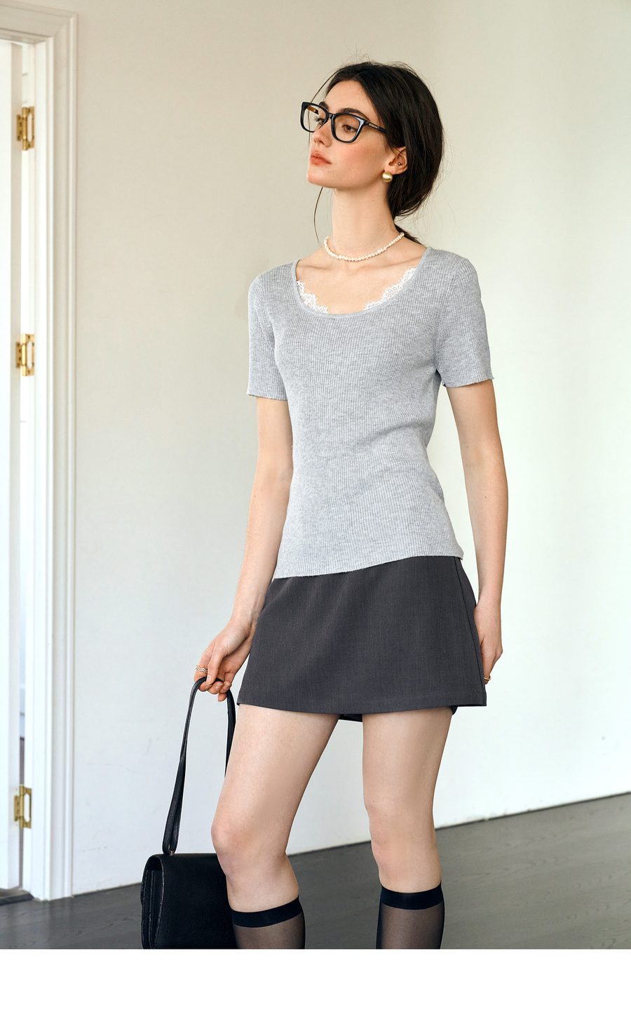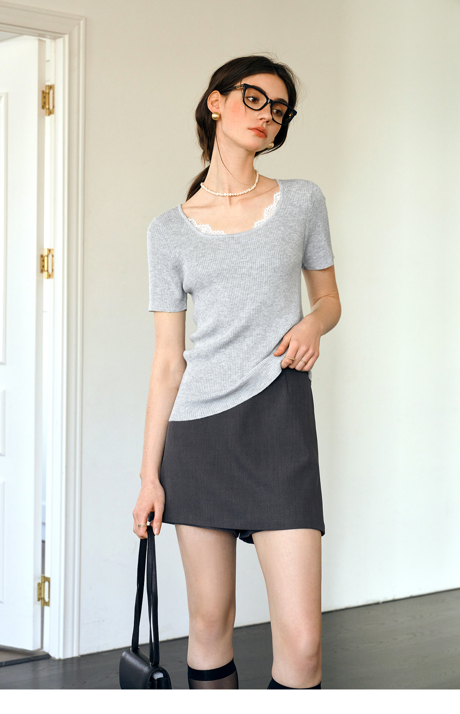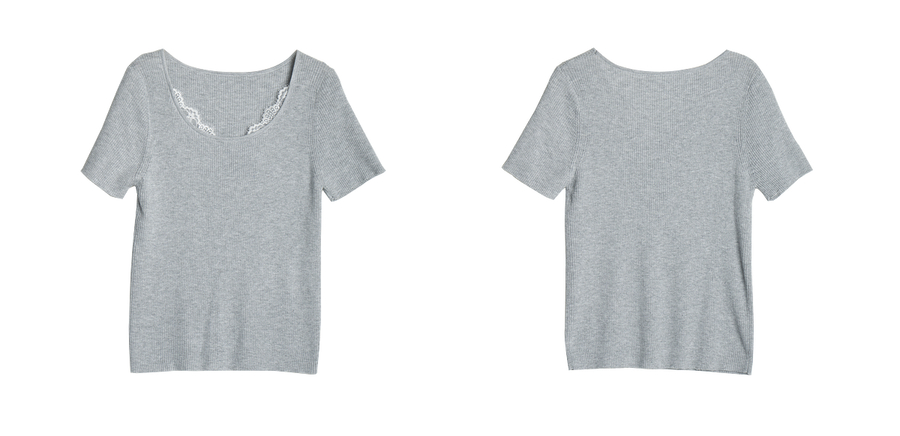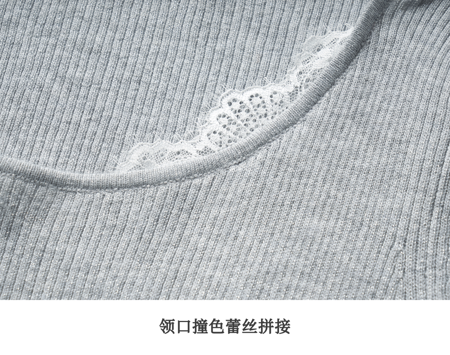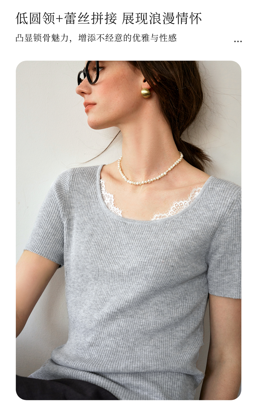 欧芮儿2025夏季新款蕾丝拼接圆领短袖针织正肩T恤女甜美简约上衣