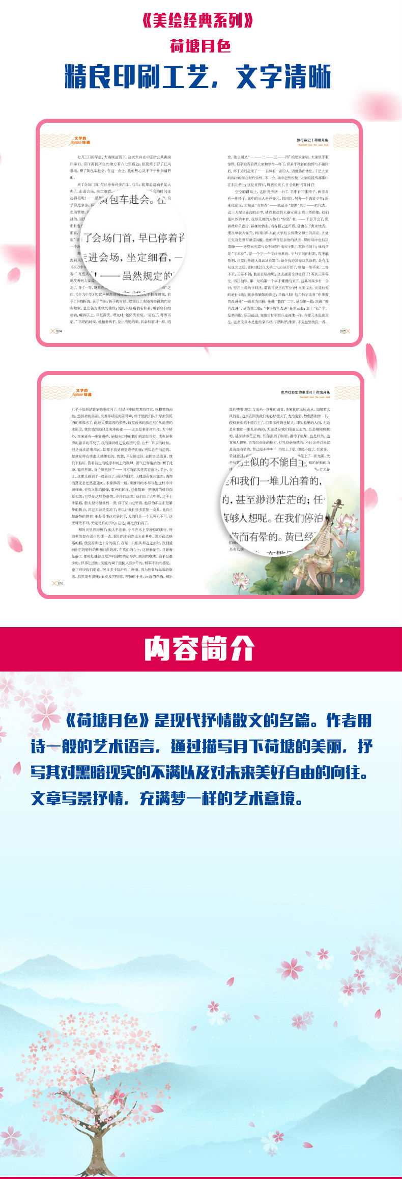 《荷塘月色》是现代抒情散文的名篇。作者用诗一般的艺术语言,通过描写月下荷塘的美丽,抒写其对黑暗现实的不满以及对未来美好自由的向往。文章写景抒情,充满梦一样的艺术意境。