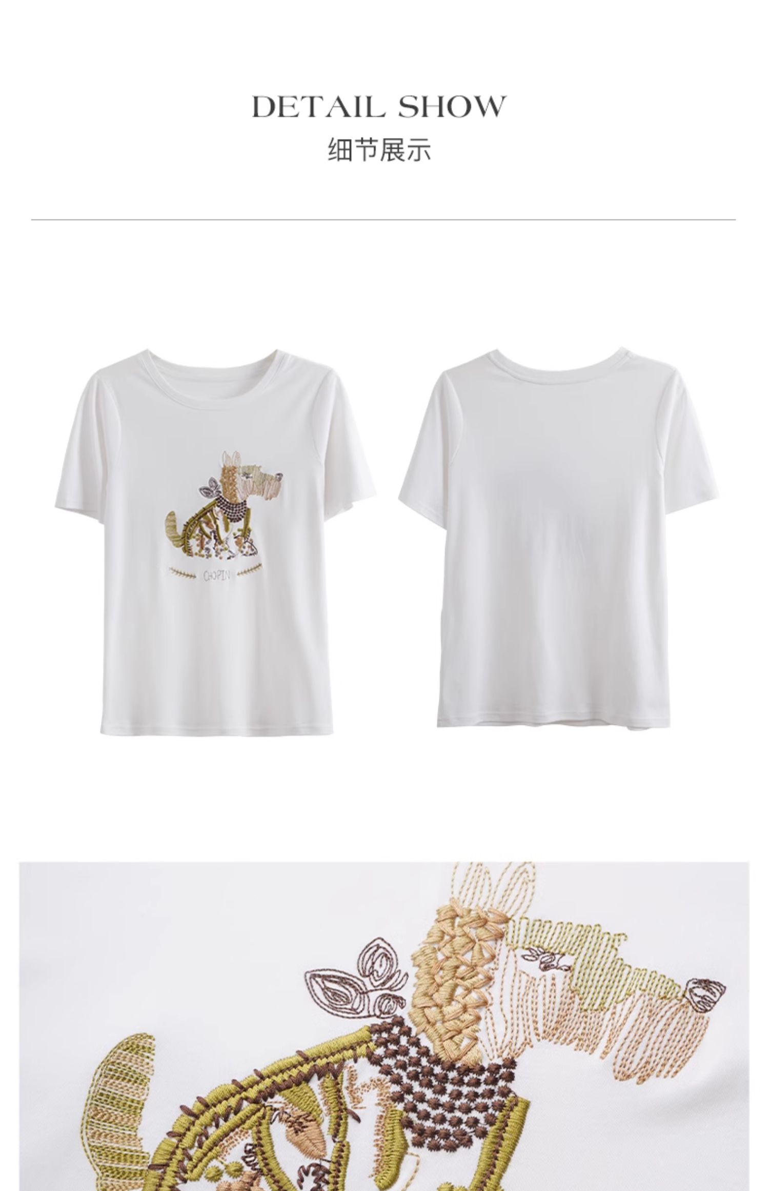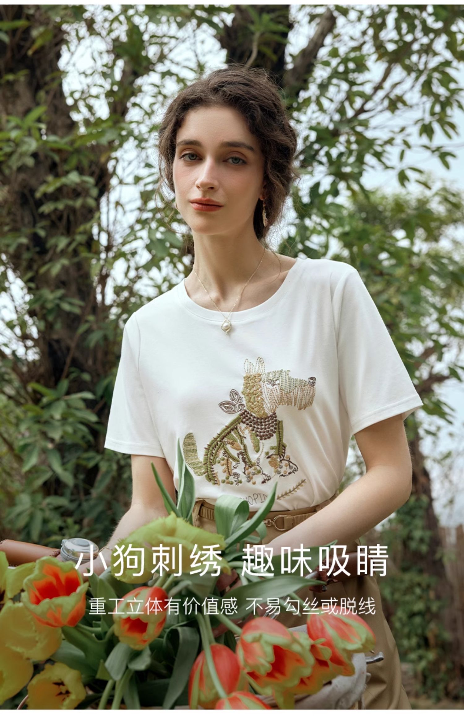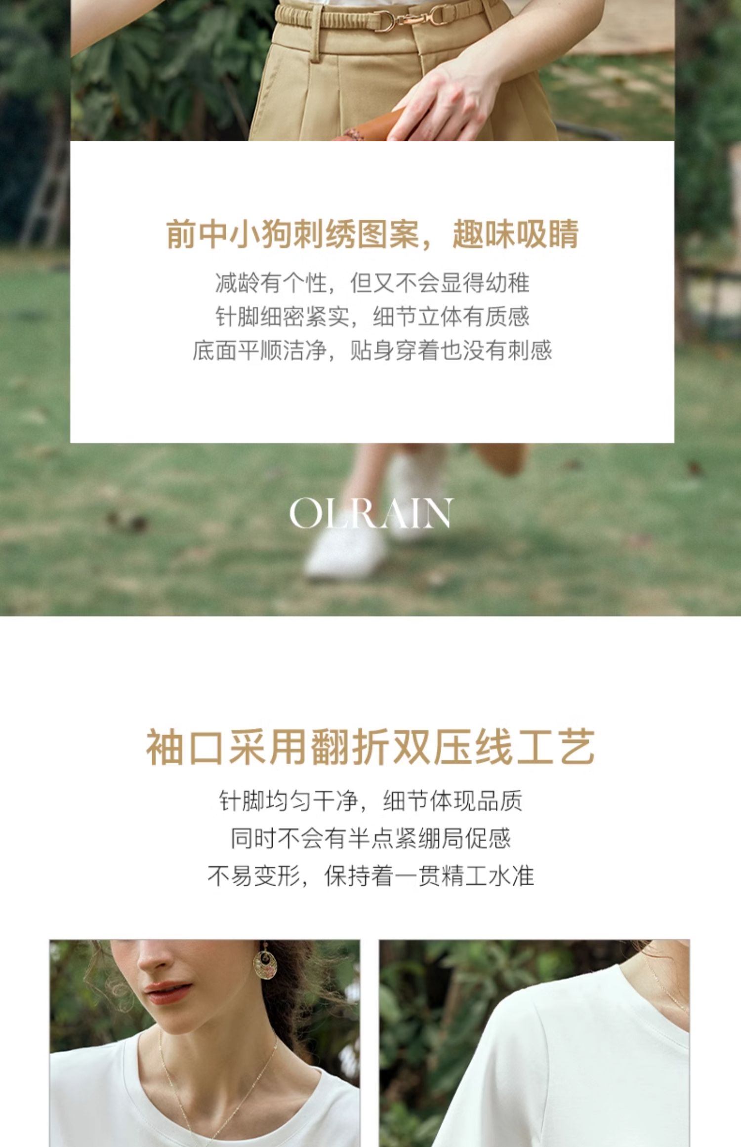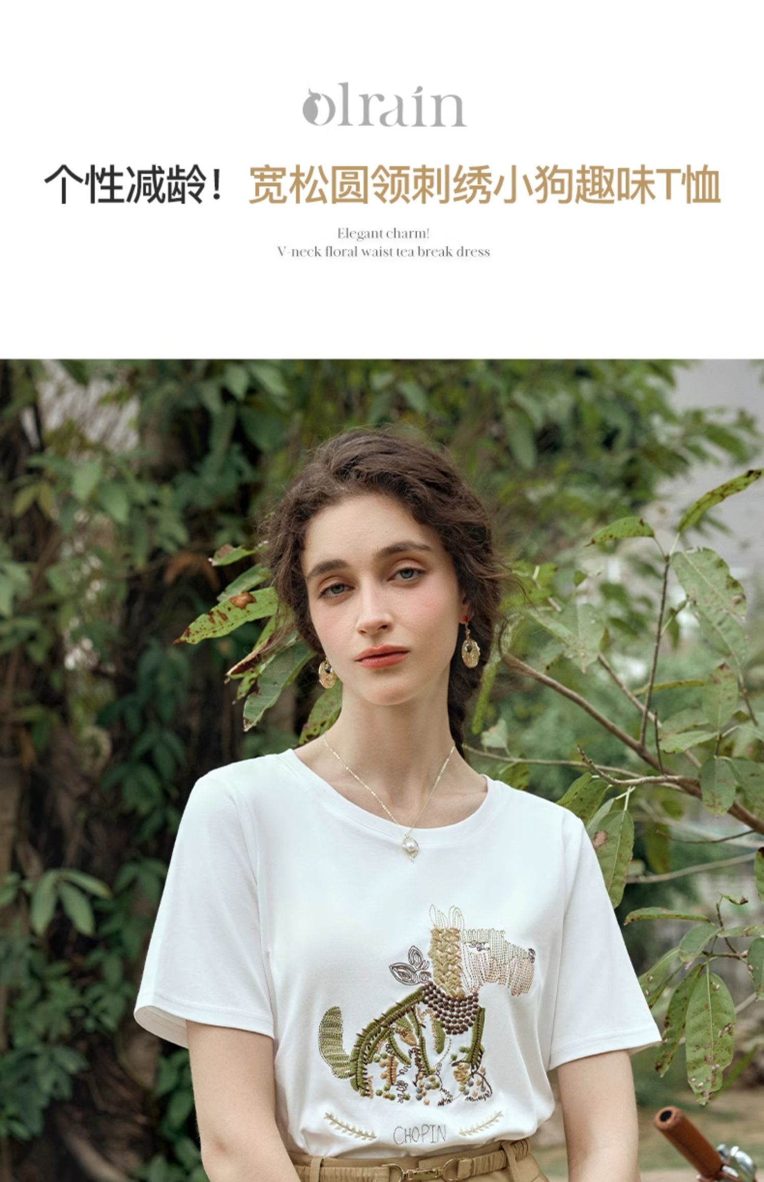 OLrain欧芮儿米白色宽松T恤女夏季2024新款圆领刺绣小狗趣味短袖