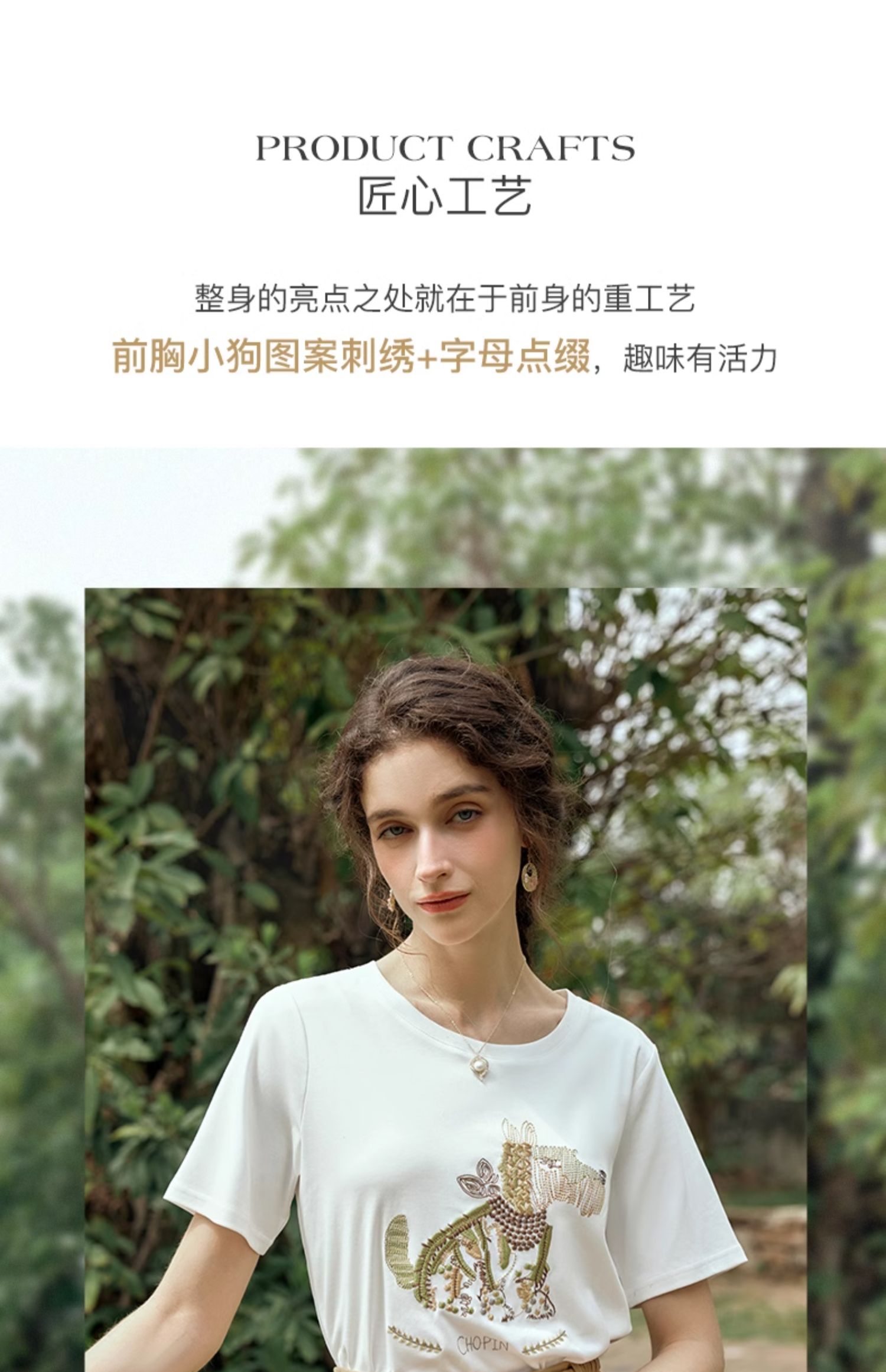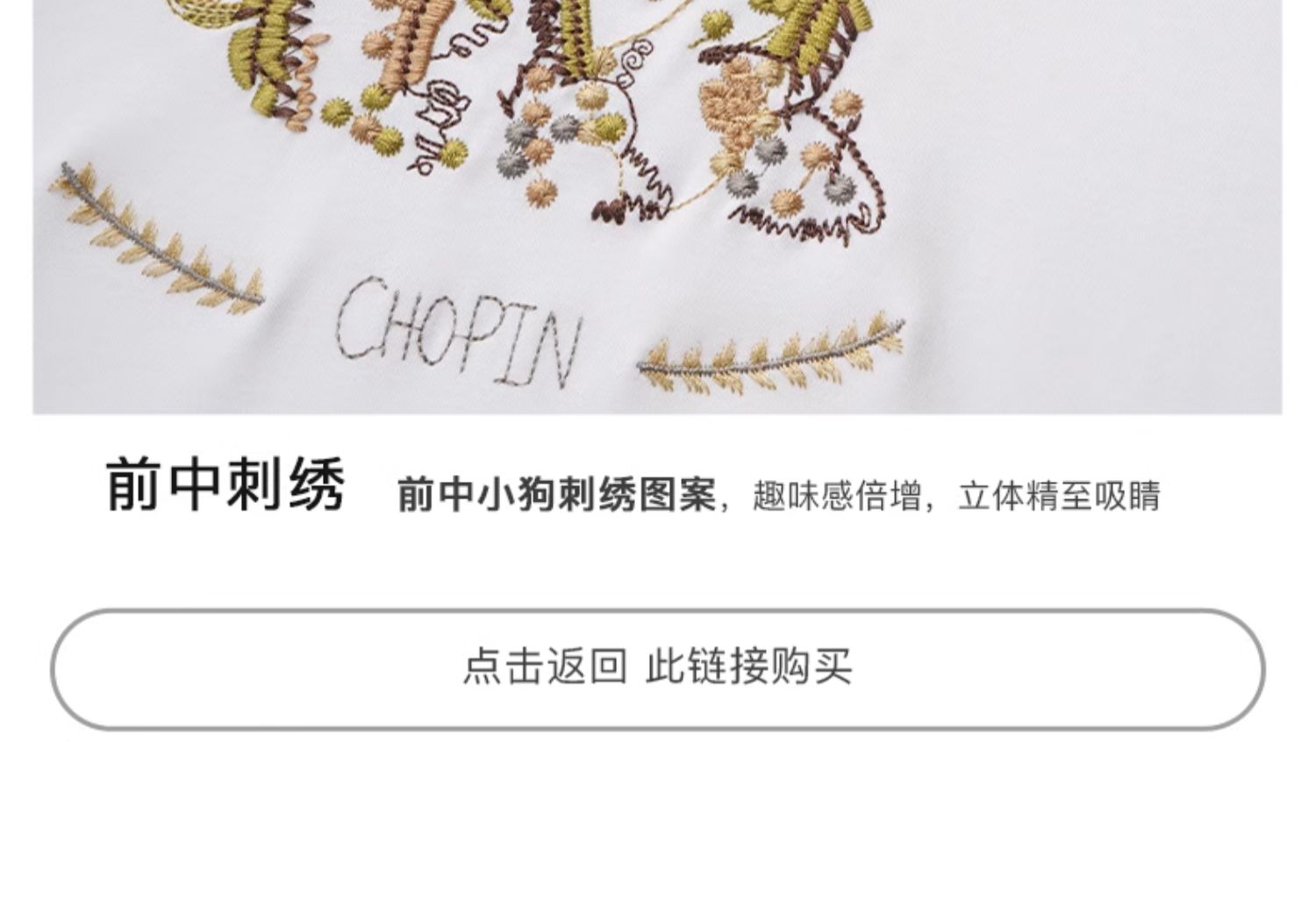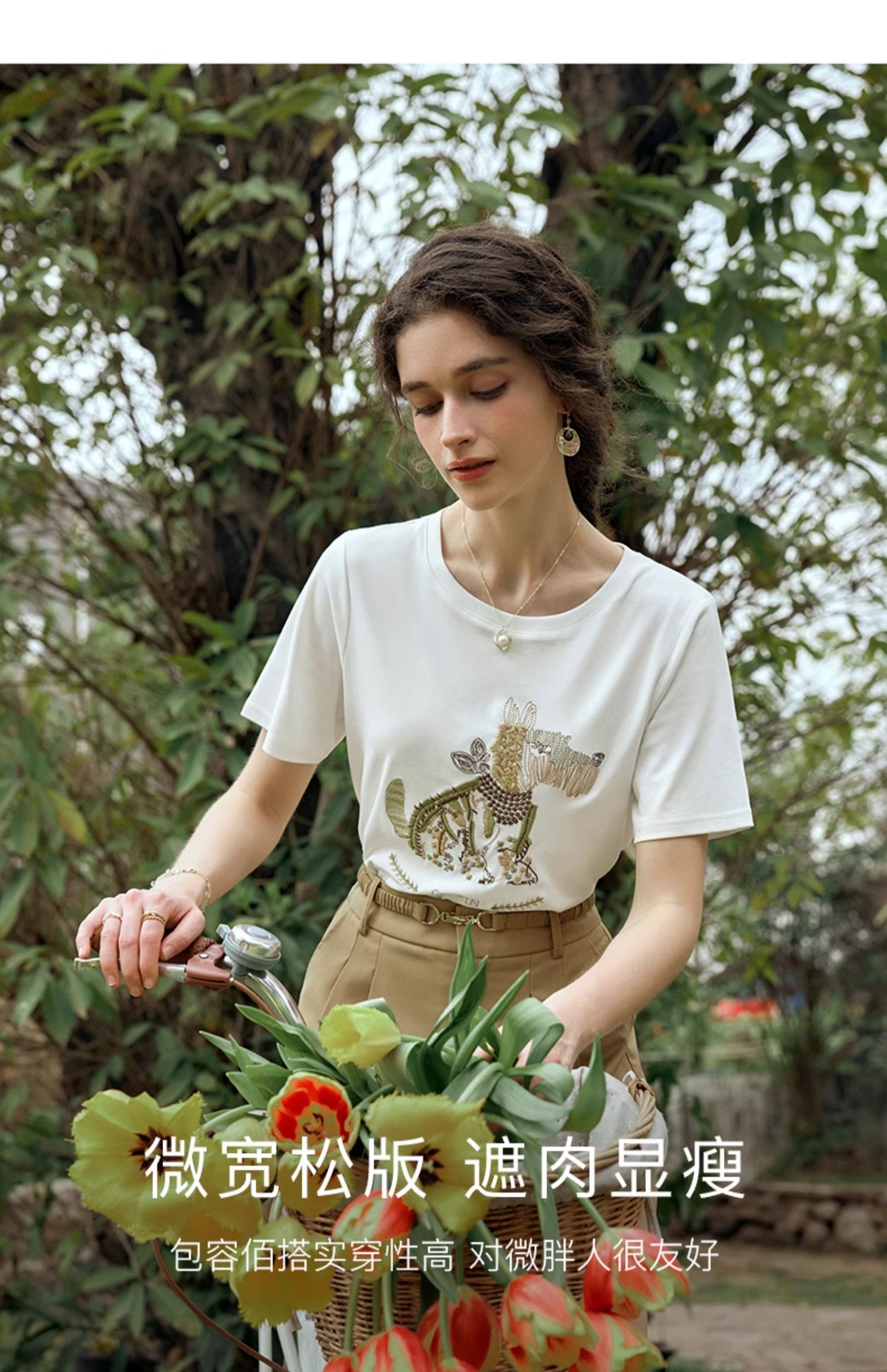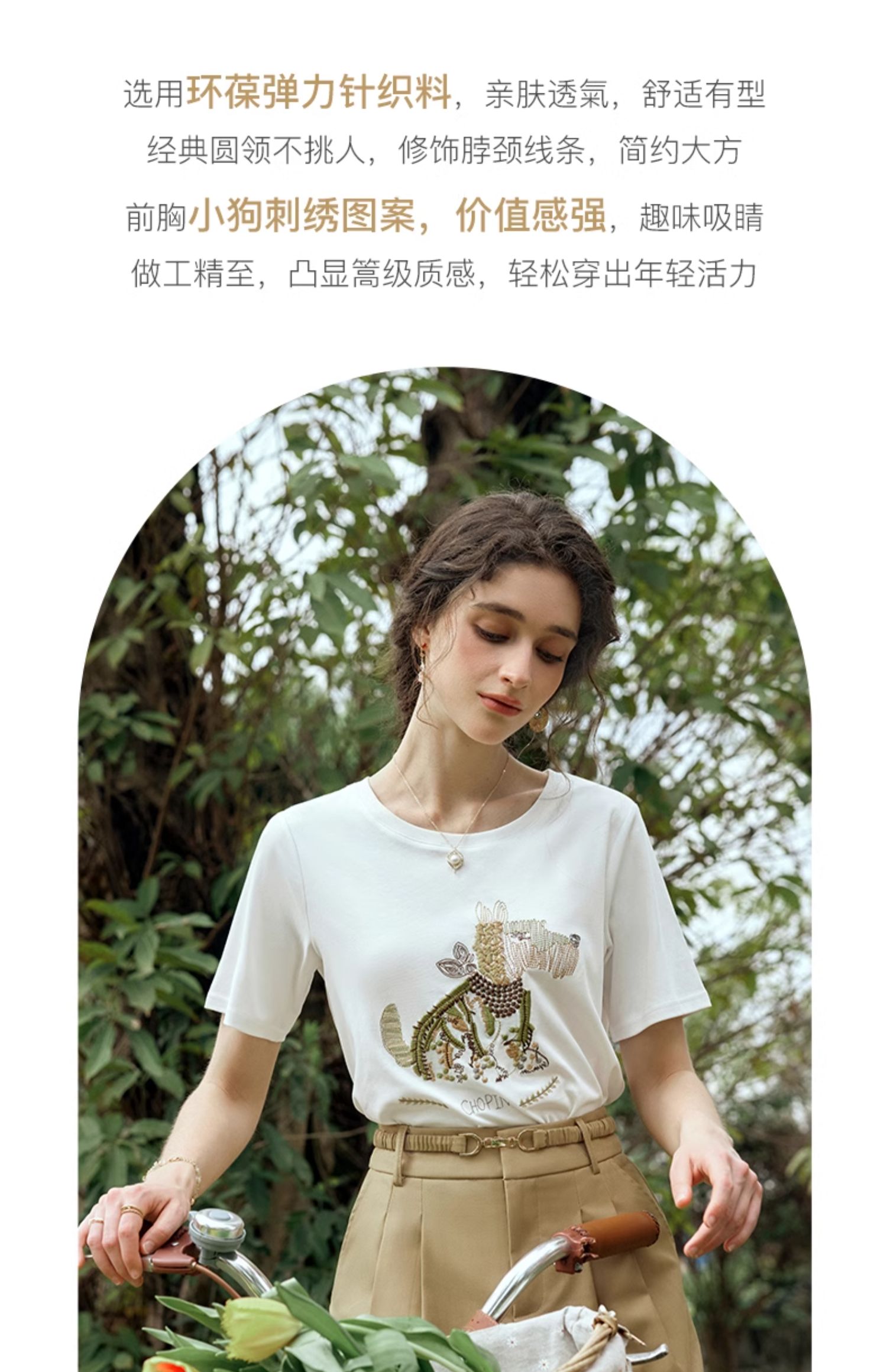OLrain欧芮儿米白色宽松T恤女夏季2024新款圆领刺绣小狗趣味短袖