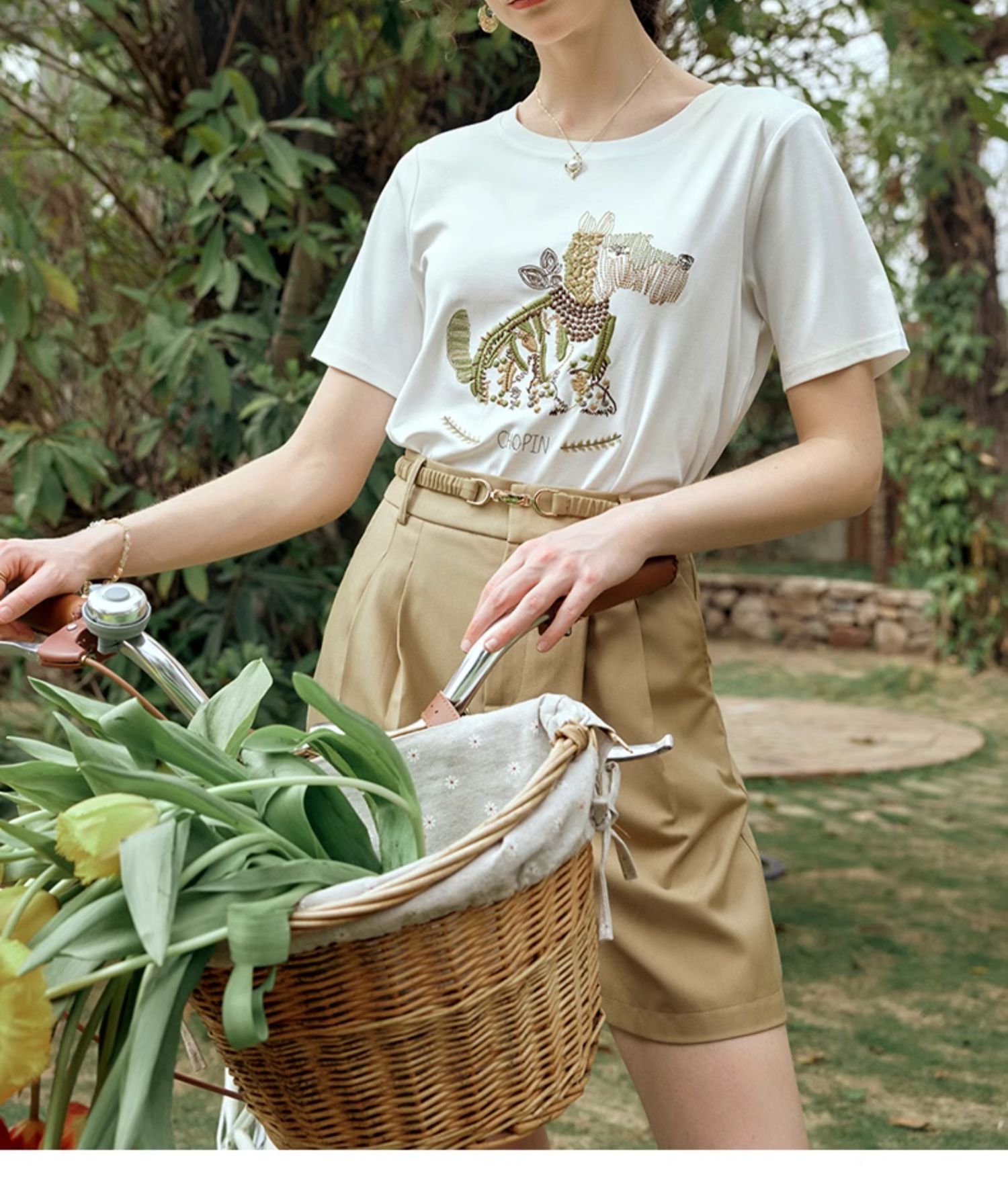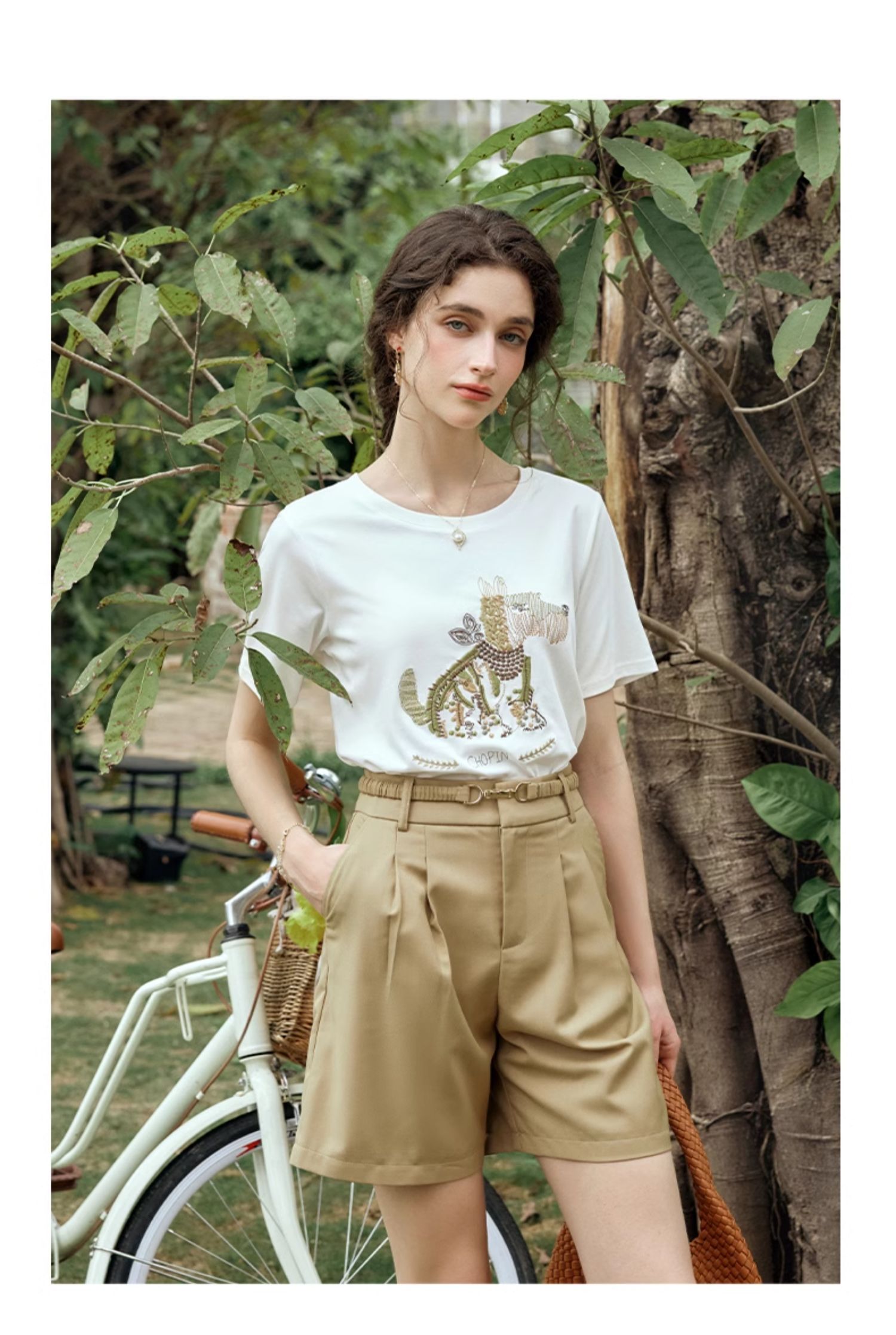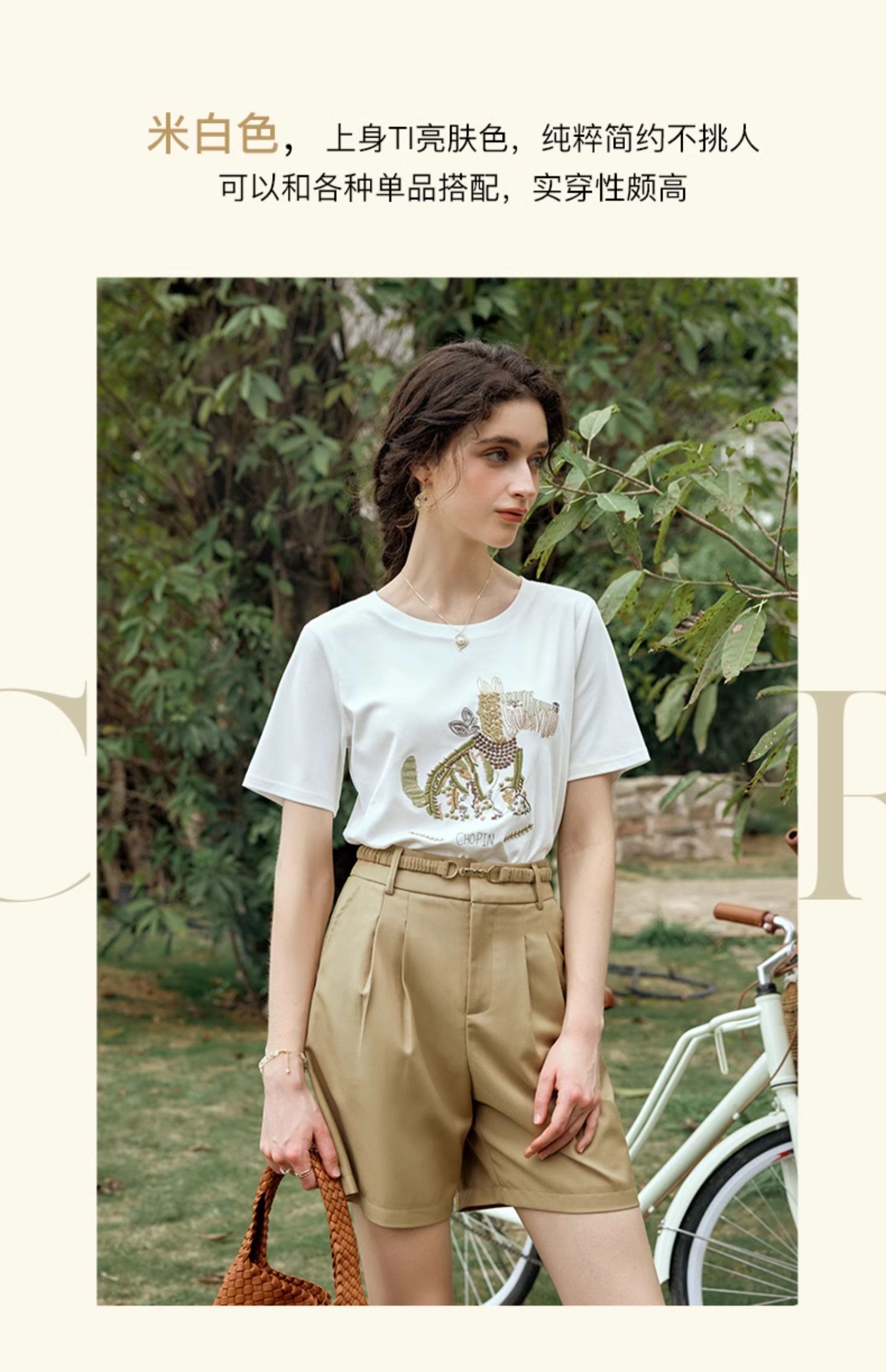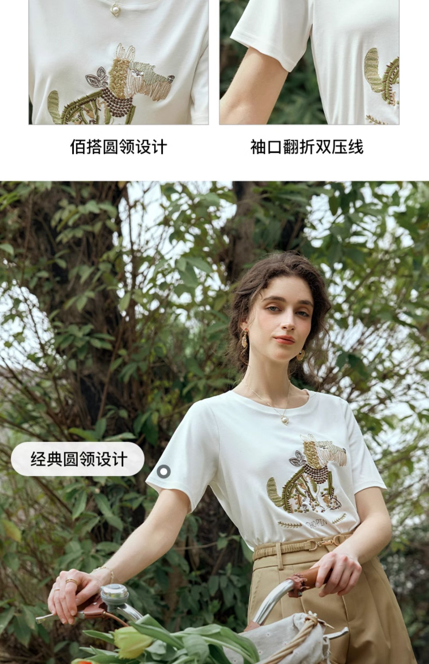 OLrain欧芮儿米白色宽松T恤女夏季2024新款圆领刺绣小狗趣味短袖