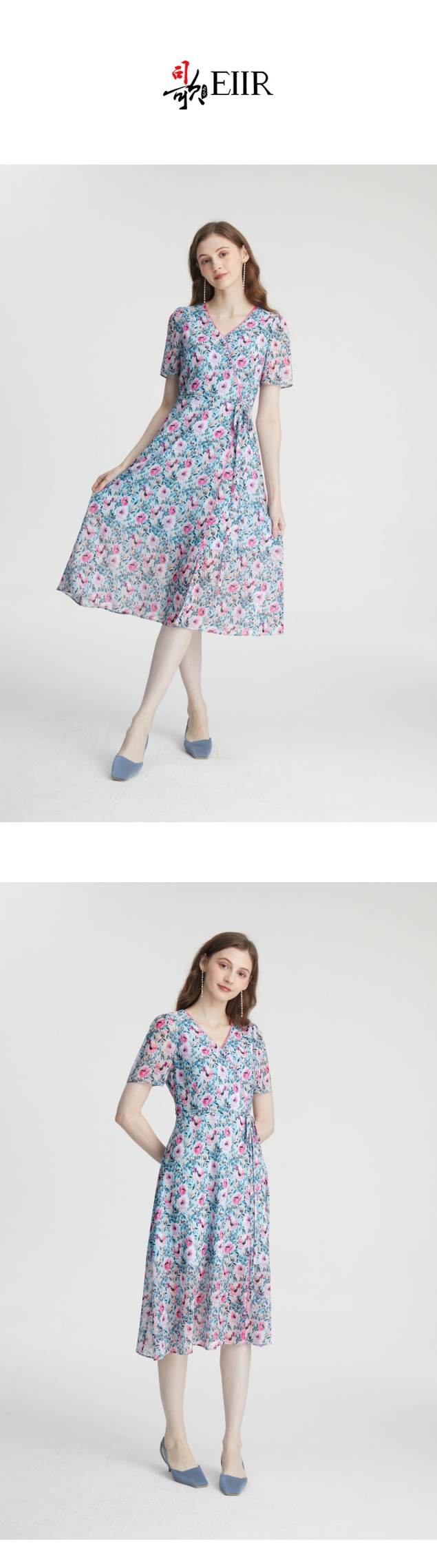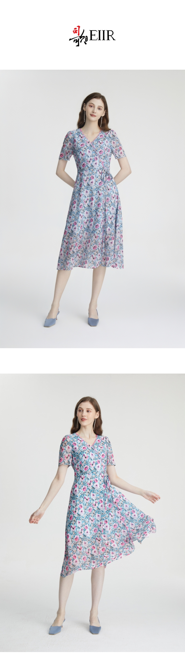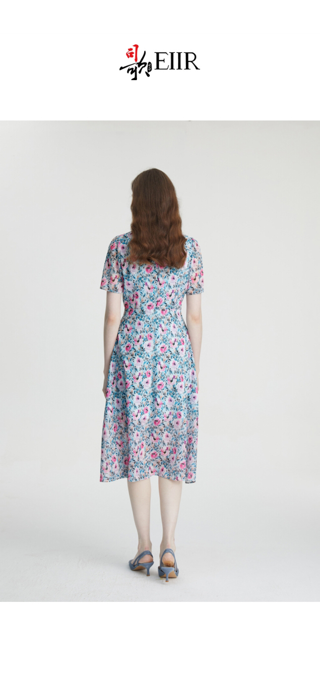 司歌V领印花雪纺短袖连衣裙A871026