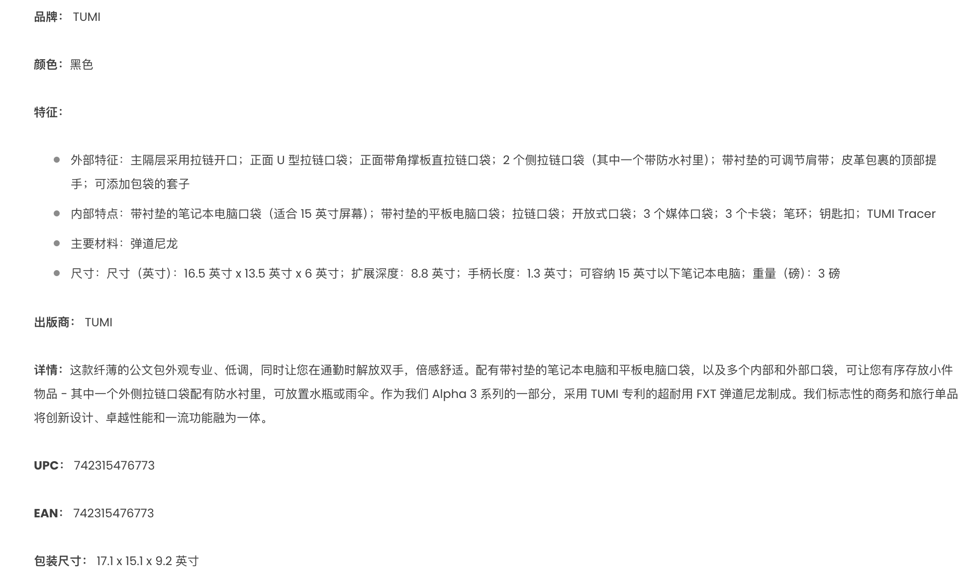 TUMI 途明 Alpha 3系列男女笔记本电脑公文包 742315476773
