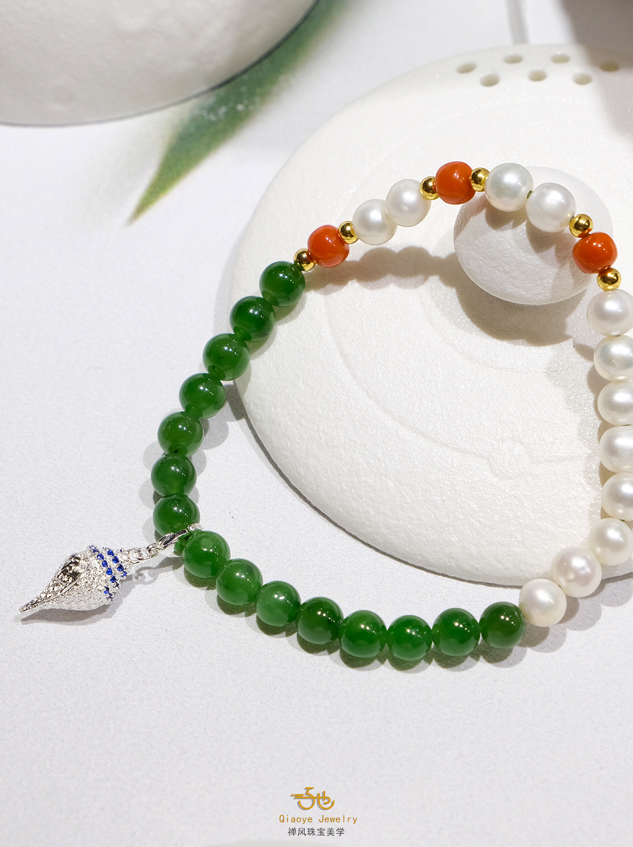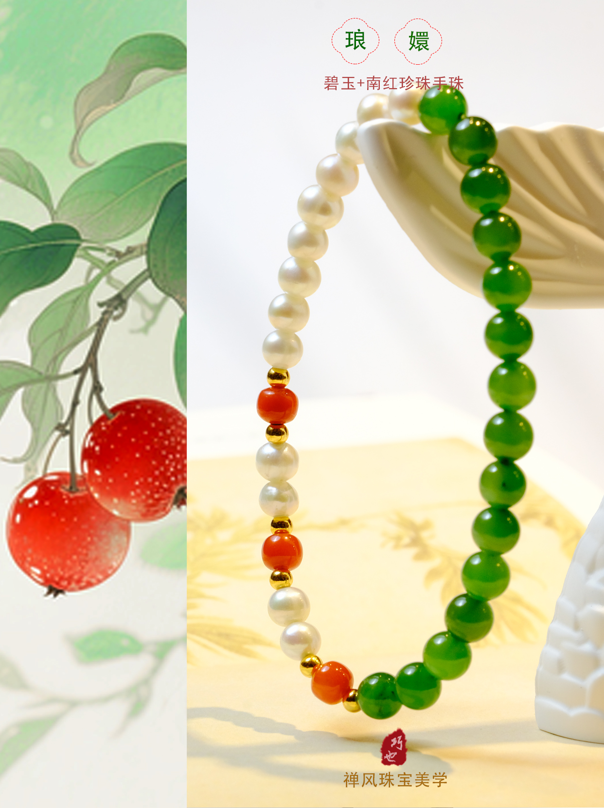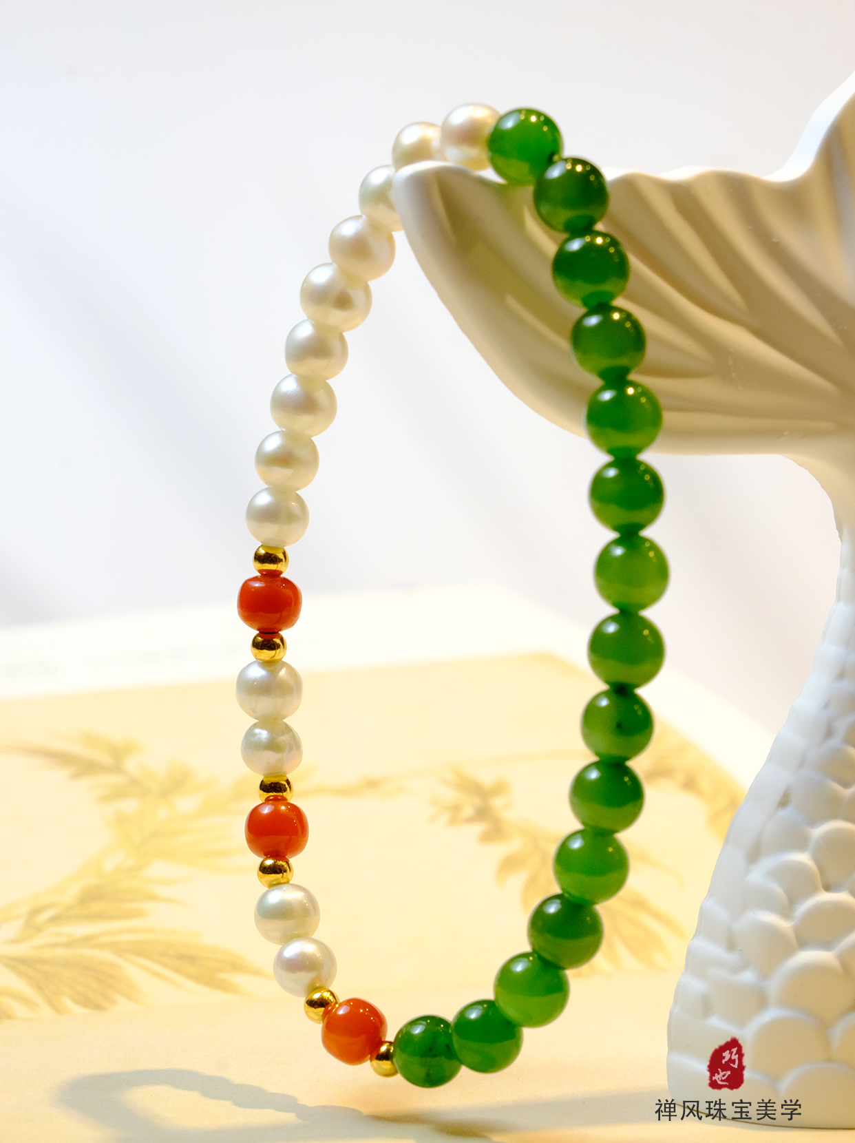 盈盈碧玉珠,恰似江南烟雨中的春水,温润通透,流转着千年的诗意与柔情;颗颗珍珠,圆润皎洁,宛如月光凝成的露珠,带着不染纤尘的清雅;明艳南红,似天边的晚霞,热烈奔放,蕴含着生生不息的生命力。碧玉的翠、珍珠的白、南红的红,三色交织,碰撞出独特的东方美学,每一颗珠子都诉说着古老的故事。