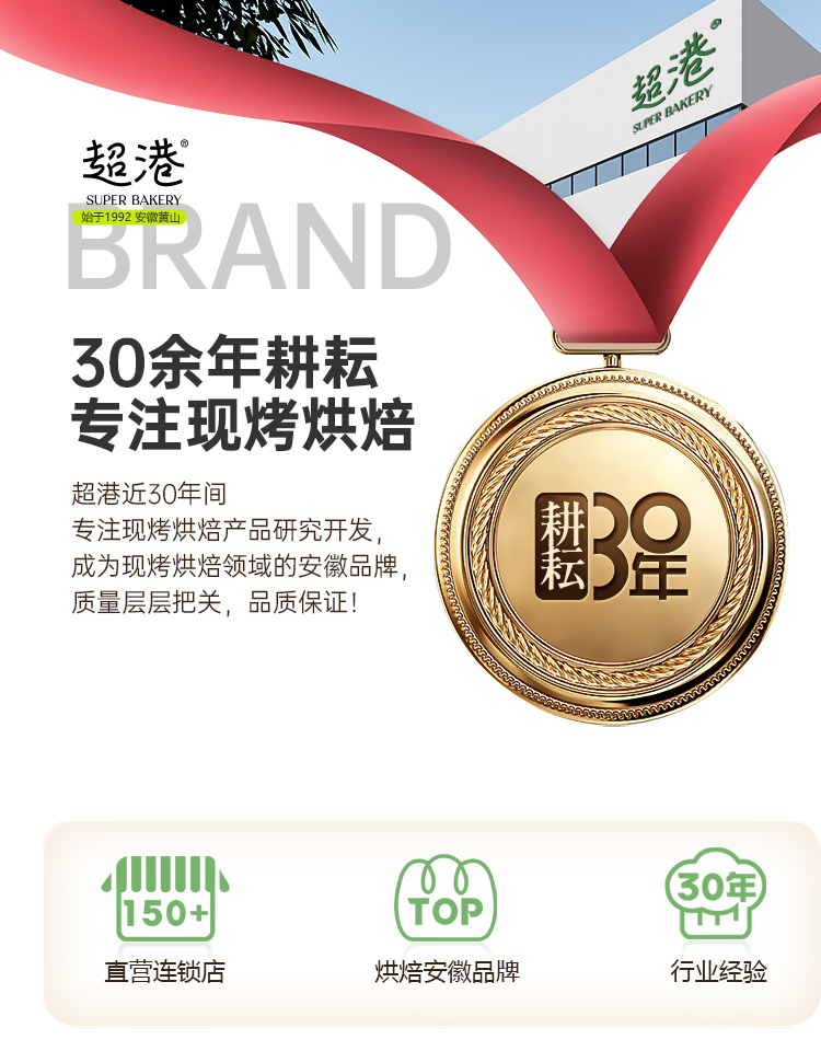 超港创立于1992年,是一家集生产销售面包、蛋糕、传统糕点、中西点于一体的全国性连锁烘焙企业,拥有百余家直营门店。超港以“玩味烘焙、文创美学”为经营理念。