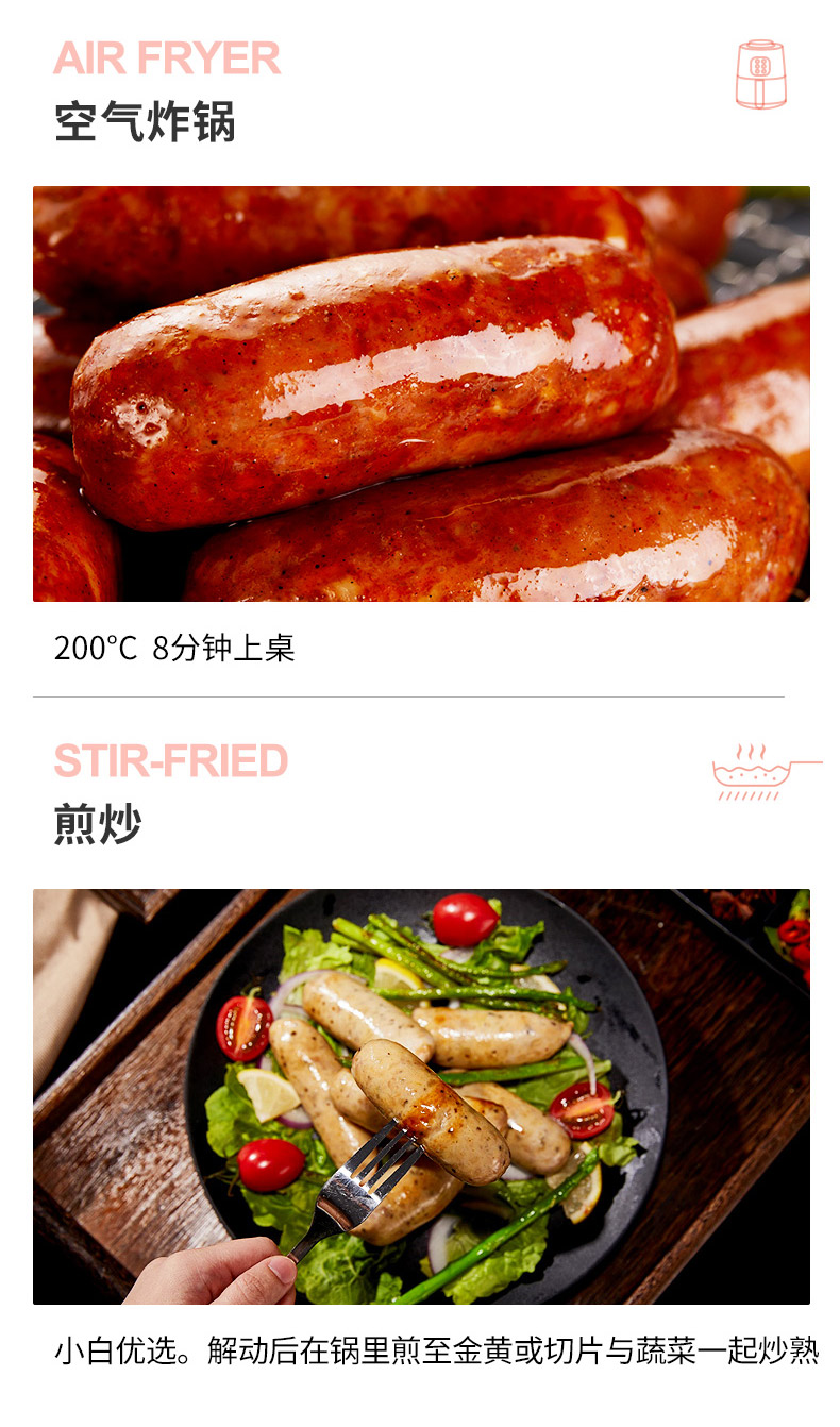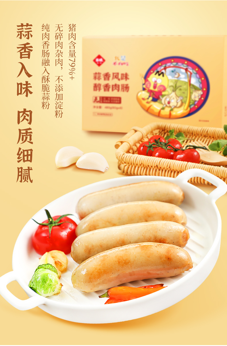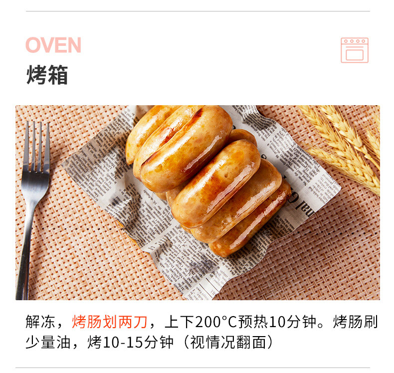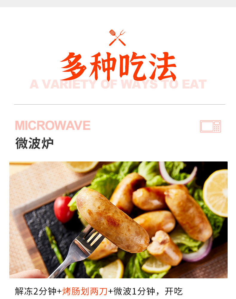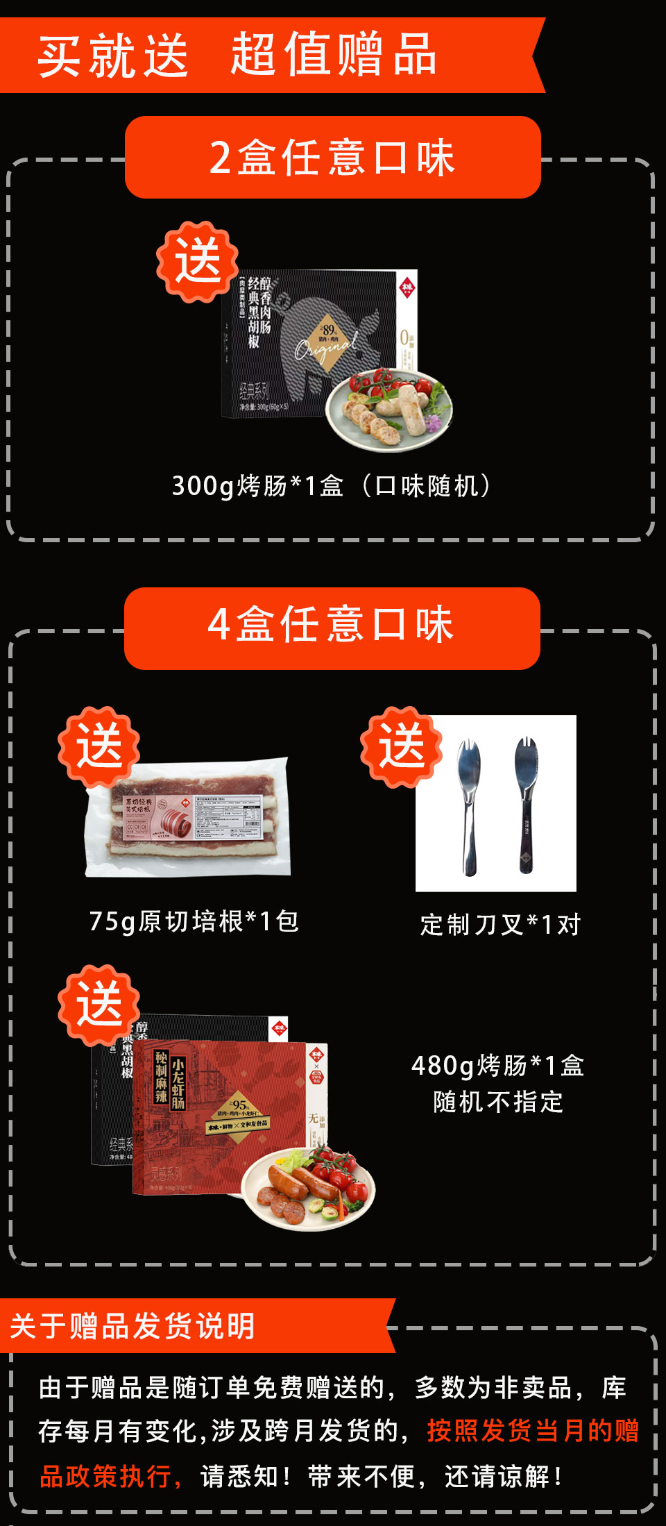 买四送三:买4盒赠正装480g烤肠*1盒(口味随机)+原切培根75g*1包+定制刀叉1对