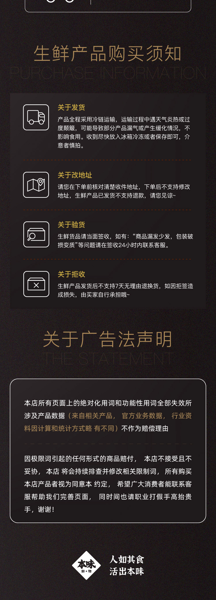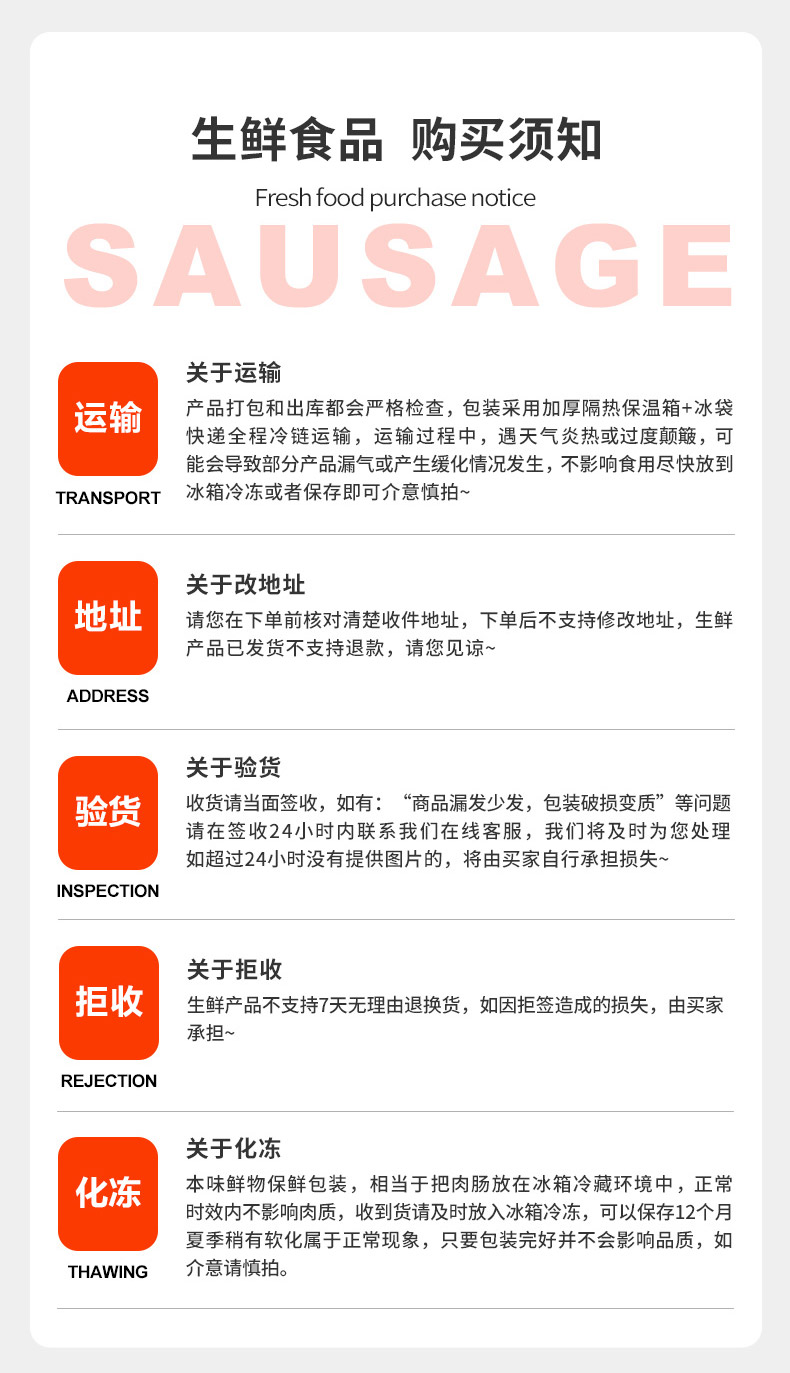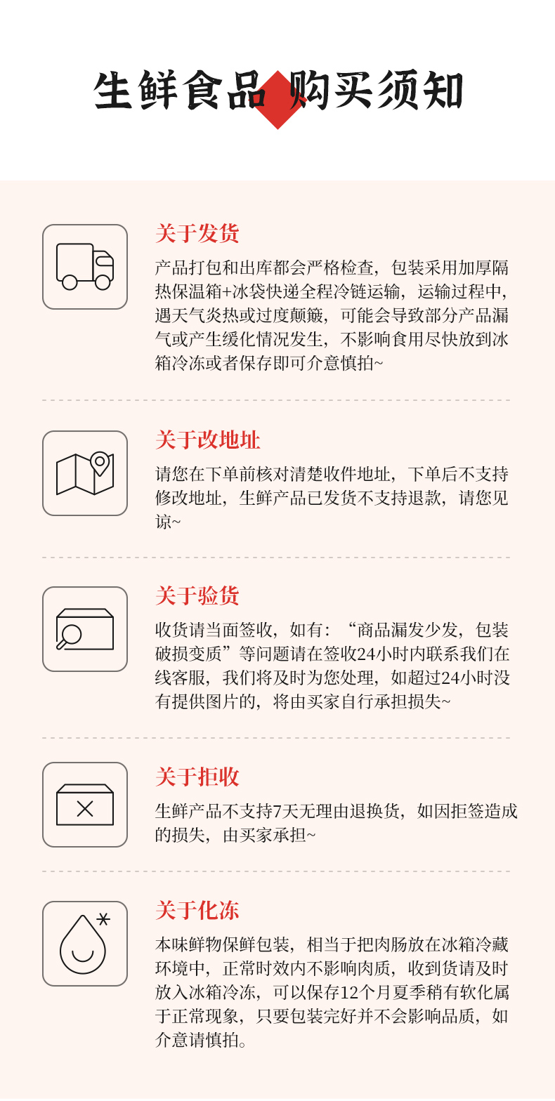 4. 生鲜产品不支持7天无理由退换货,如因地址错误、收件地址不详细、快递联络不上收件人等情况,造成的包裹延迟派送或拒拒签造成的损失,由买家自行承担!