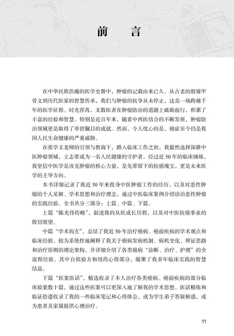 本书首次全面总结了陕西省名中医陈光伟教授从医近50年的学术思想及临床经验。书中介绍的经验方、用药心得、典型医案等都是作者多年的实践经验结晶,具有较强的实用性。本书内容翔实,学术价值较高,适宜广大中医临床工作者及中医药院校师生阅读参考。本书共分三篇,上篇为医家小传,记录笔者行医经历。中篇为学术经验荟萃,总结概括了笔者行医以来的主要学术主张、临证思辨方法及遣方用药特点,详细介绍了临床常见肿瘤的诊治经验、“自拟验方”和“用药心得”。下篇为医案精华,精选临床验案数十篇,分为癌病和癌前疾病两类,每则医案均有按语,以明晰辨治思路,彰显方药特色。