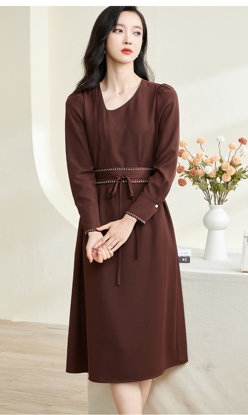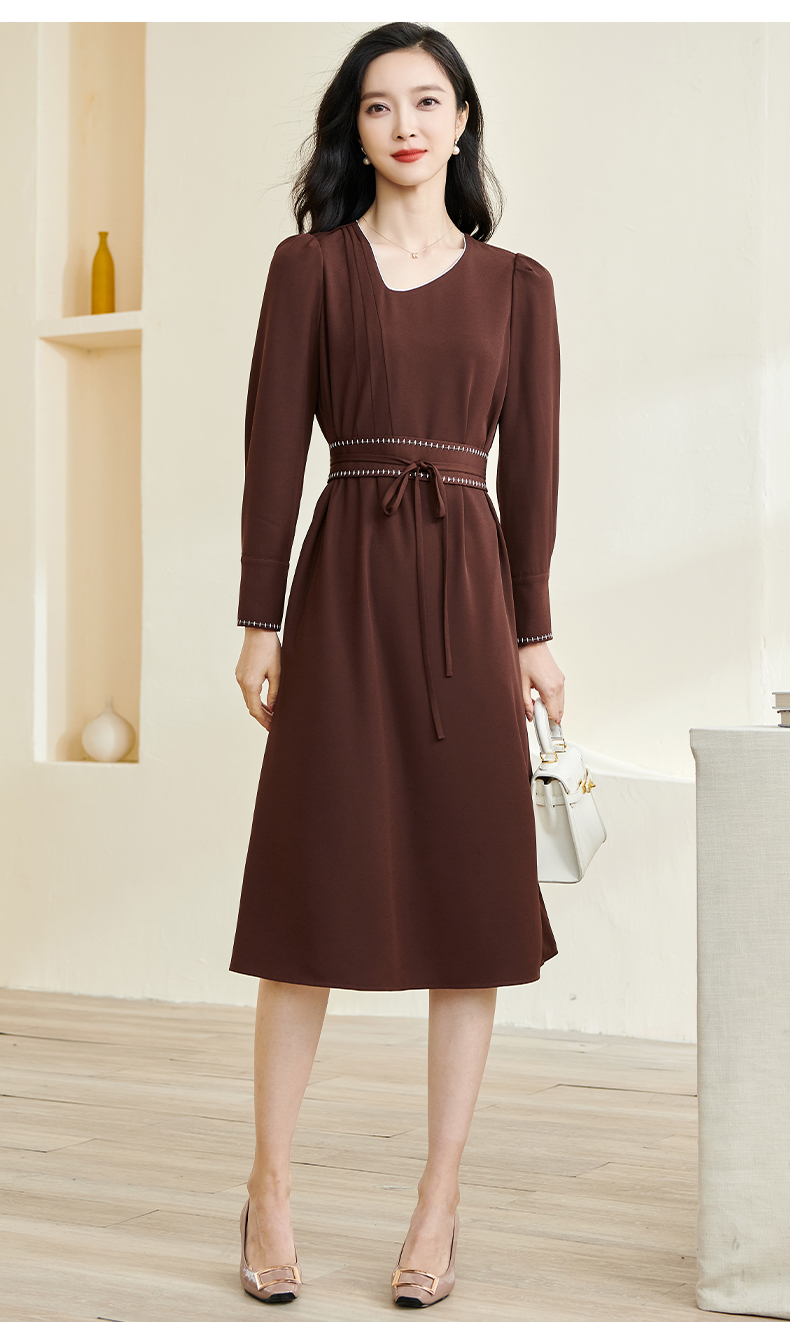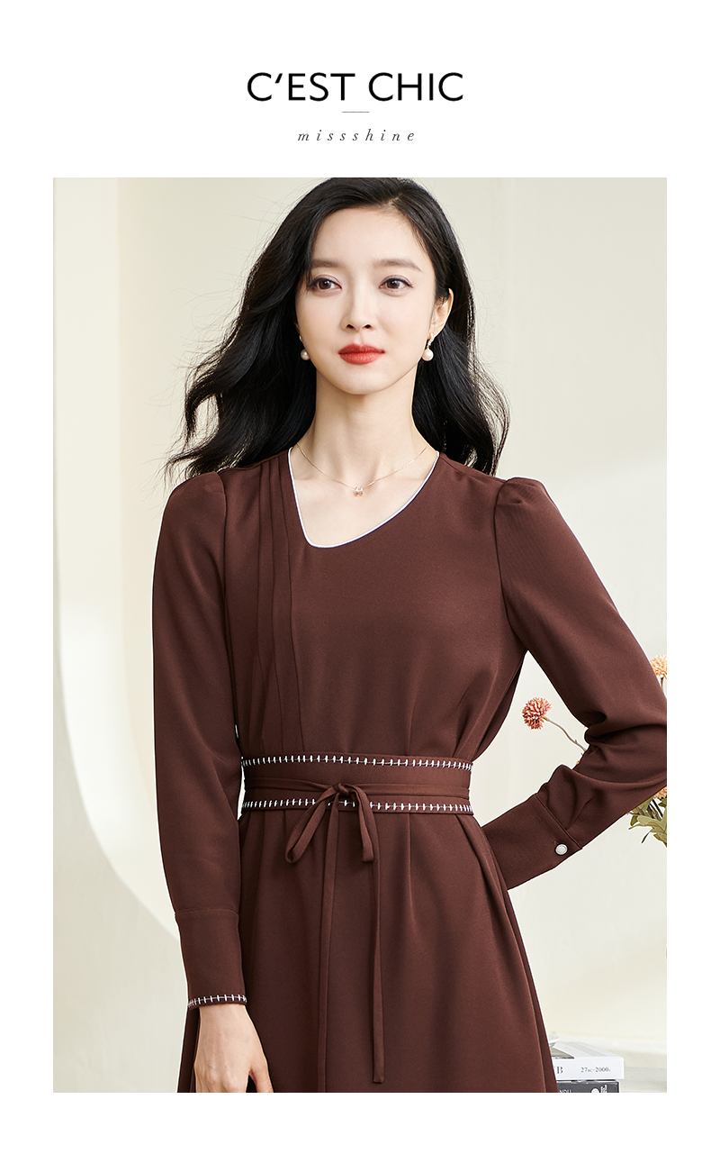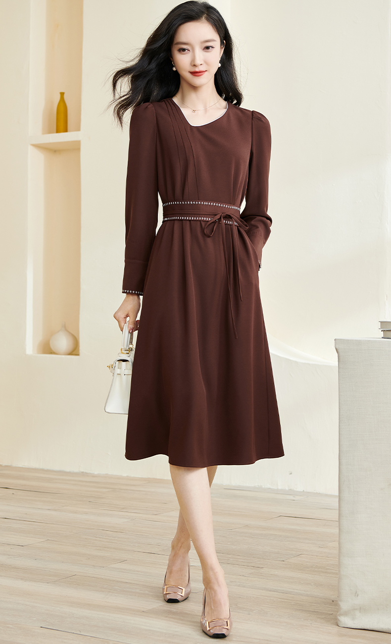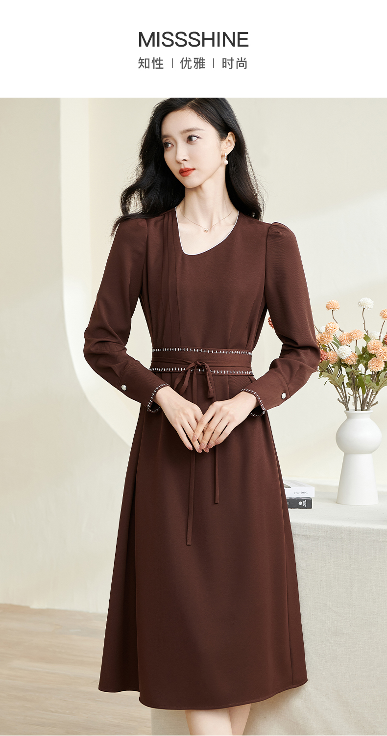 剩S/M/L/XL/XXL 米思阳2026春季新款气质通勤咖色连衣裙系带收腰长袖中长裙子2891