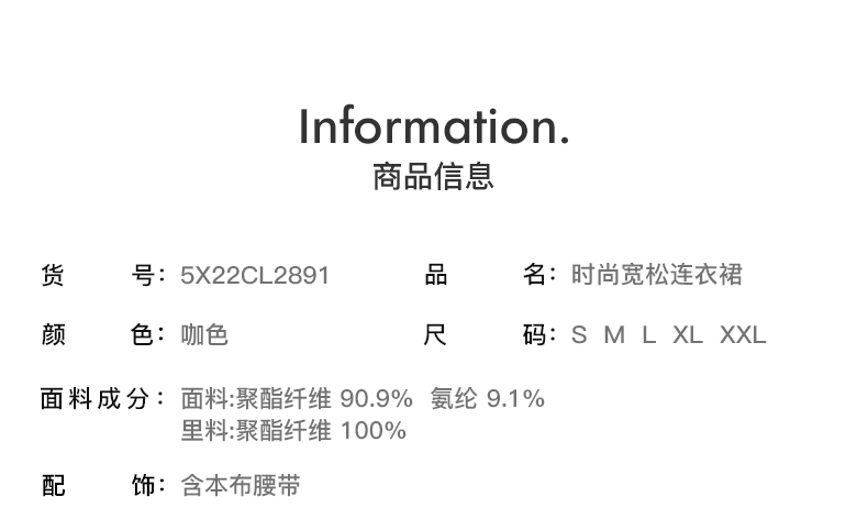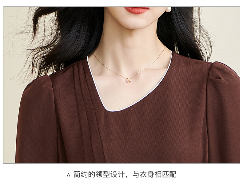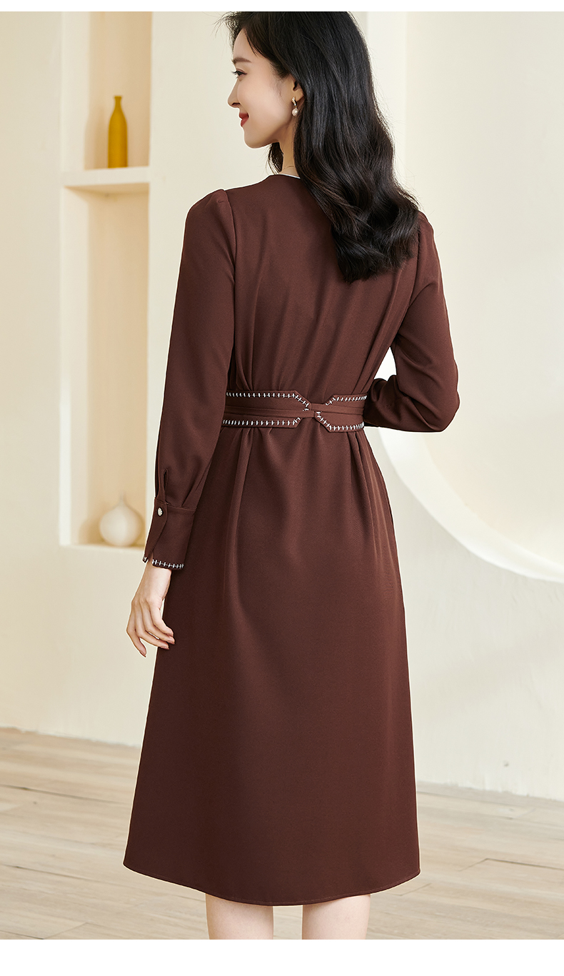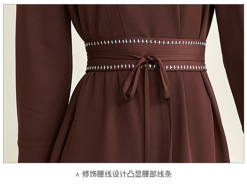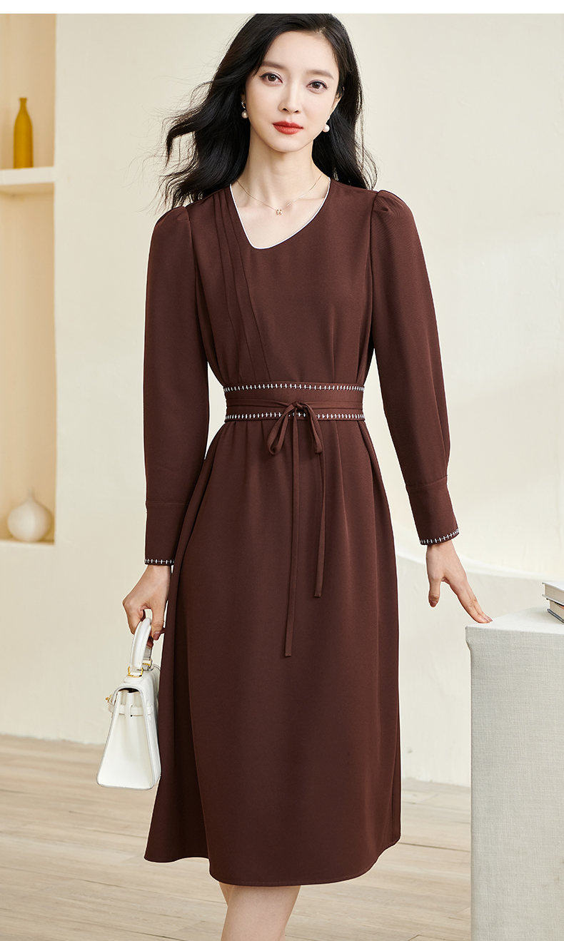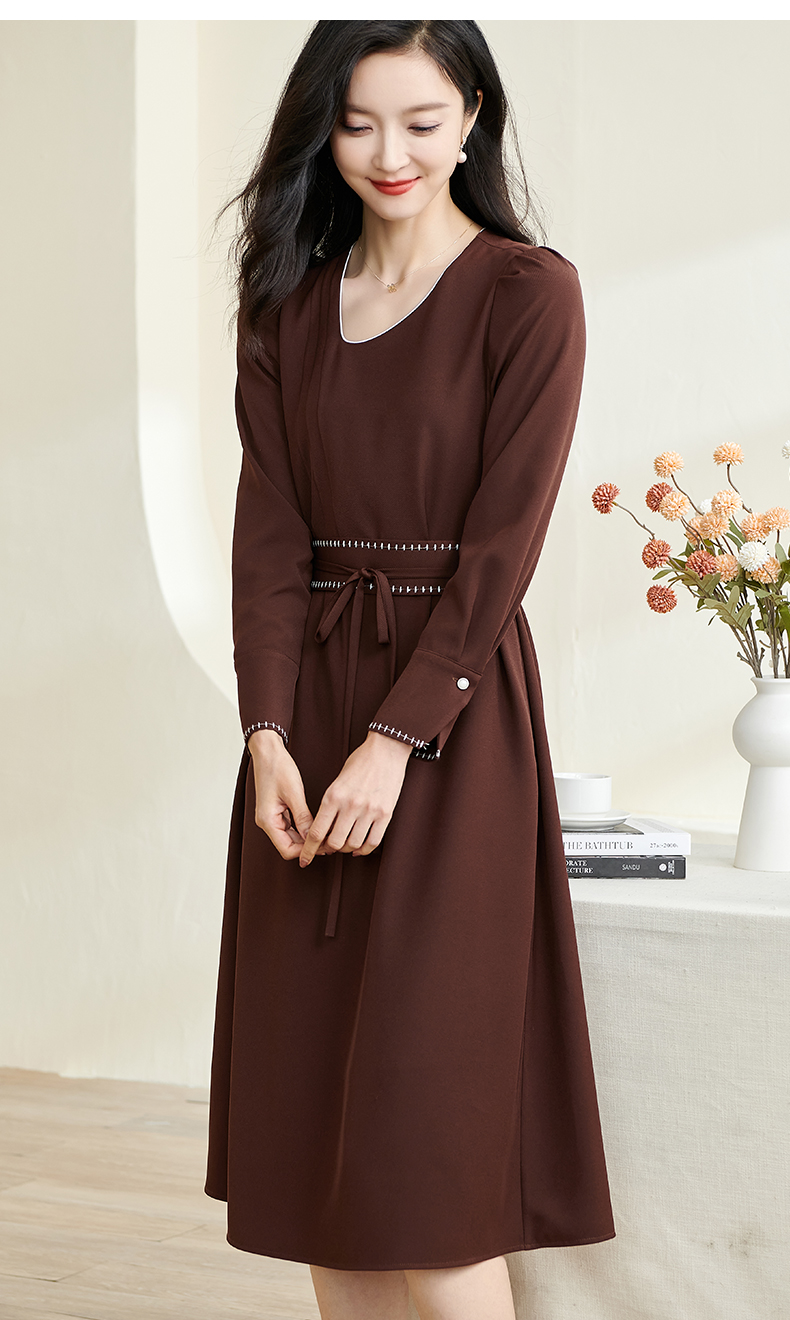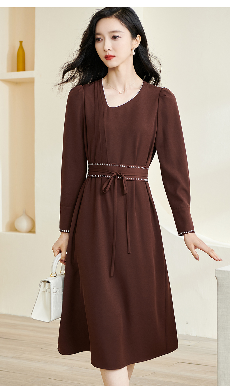 剩S/M/L/XL/XXL 米思阳2026春季新款气质通勤咖色连衣裙系带收腰长袖中长裙子2891
