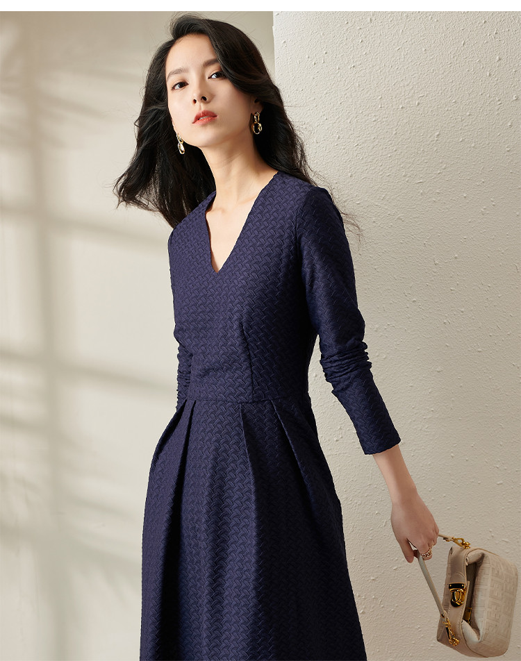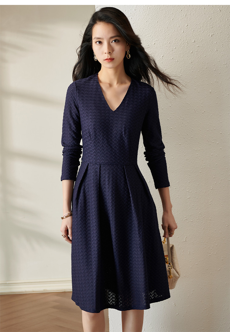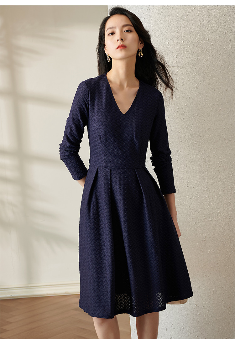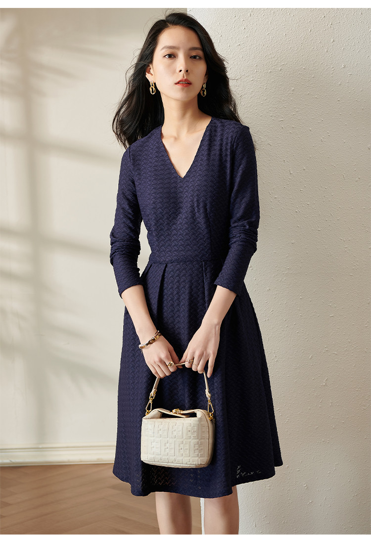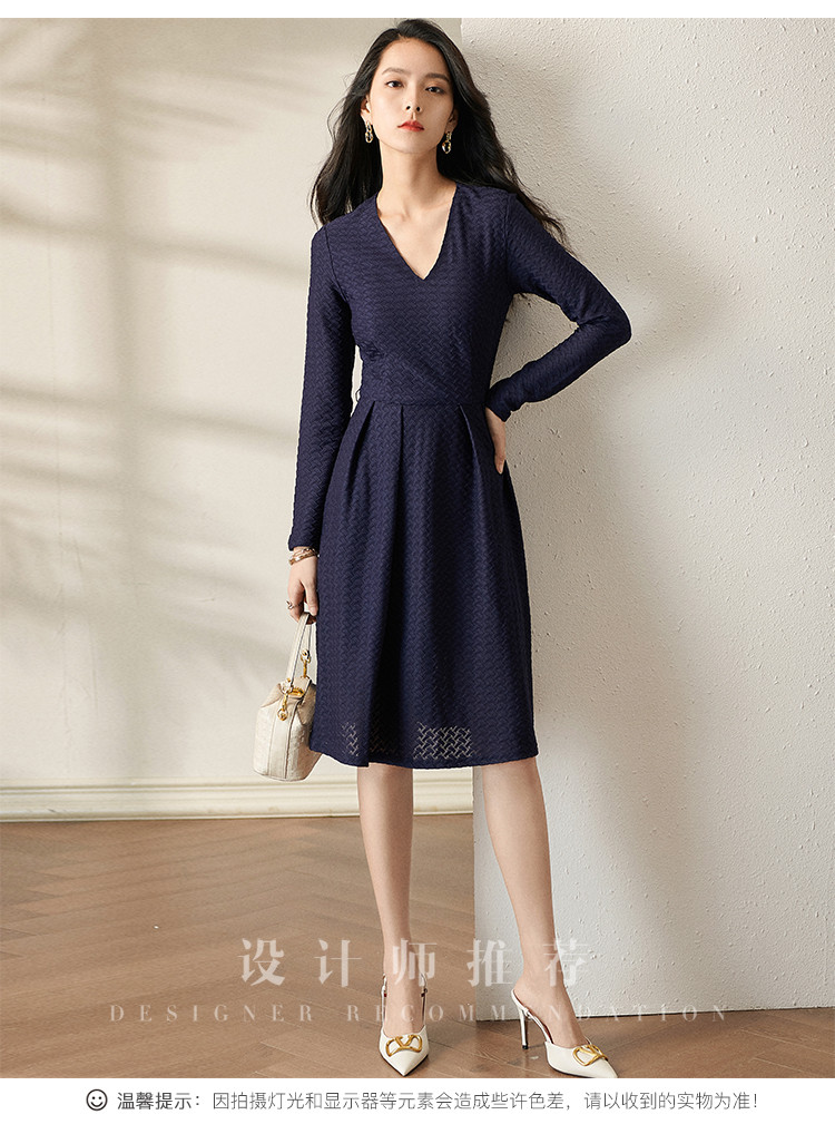 剩S 芳外透气梭织裙子2022新款秋季透气梭织花纹V领长袖连衣裙