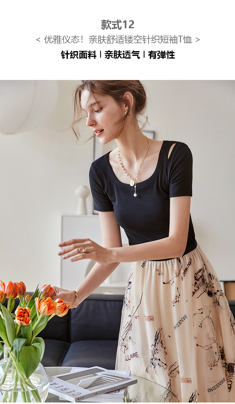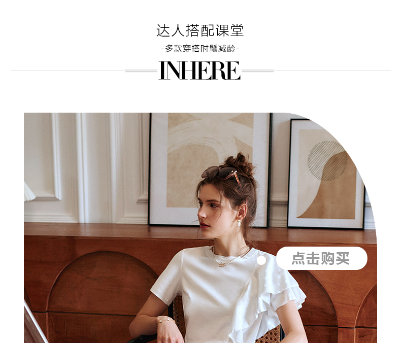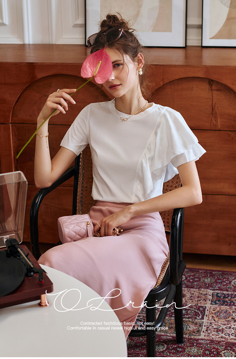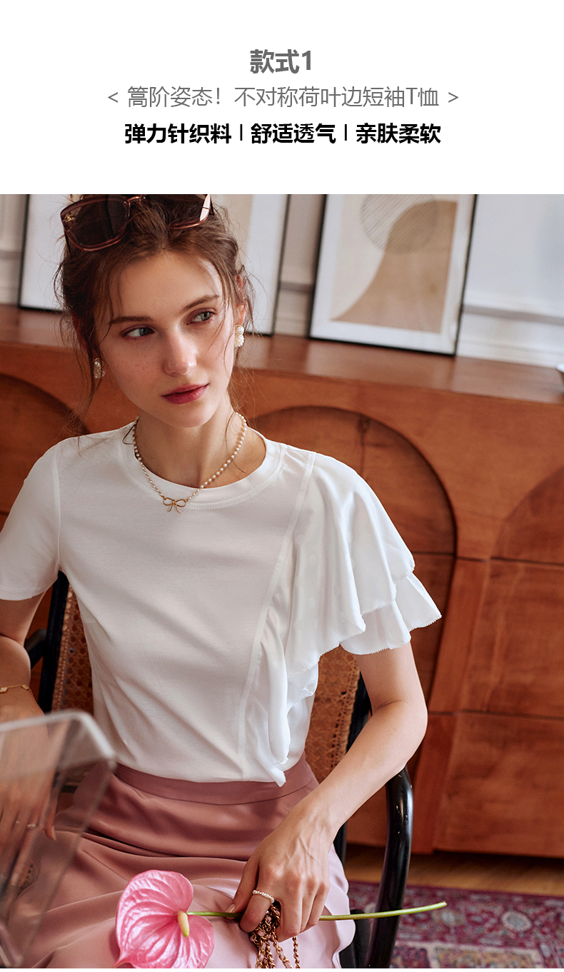 欧芮儿白色短袖T恤女2021夏新款宽松不对称荷叶边设计感针织上衣