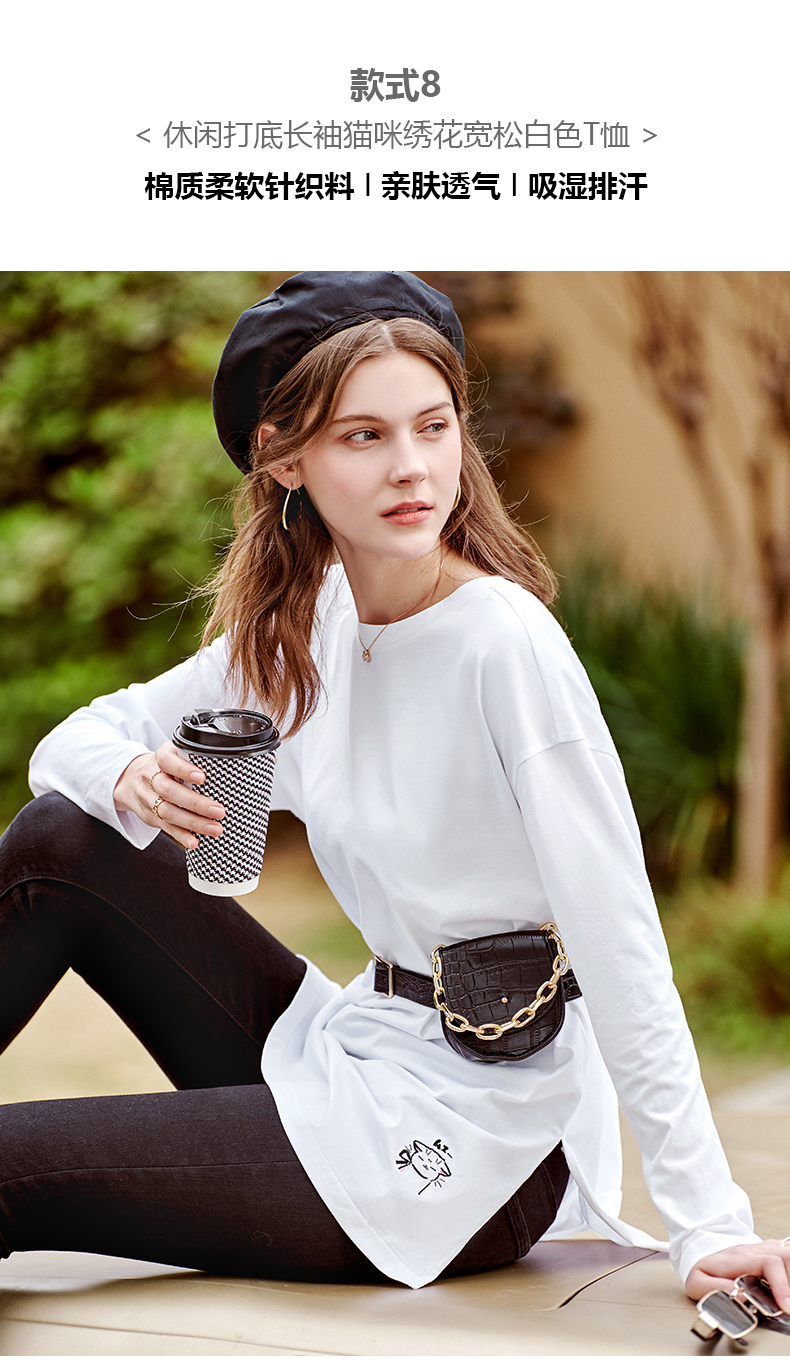 OLrain欧芮儿2026新款女夏宽松休闲猫咪印花天丝长袖T恤圆领上衣