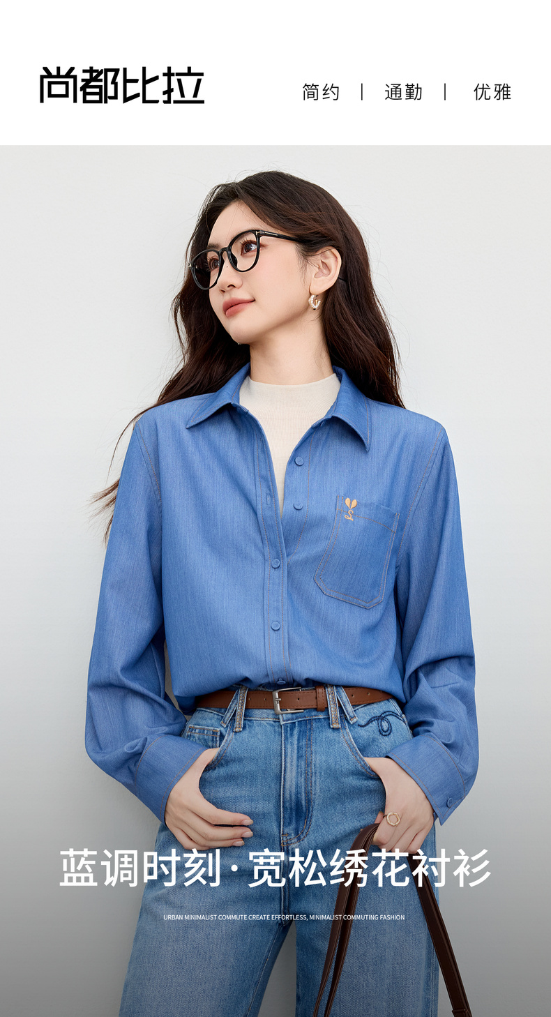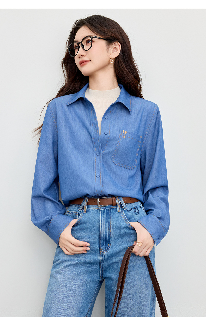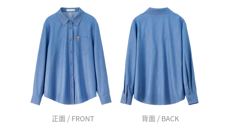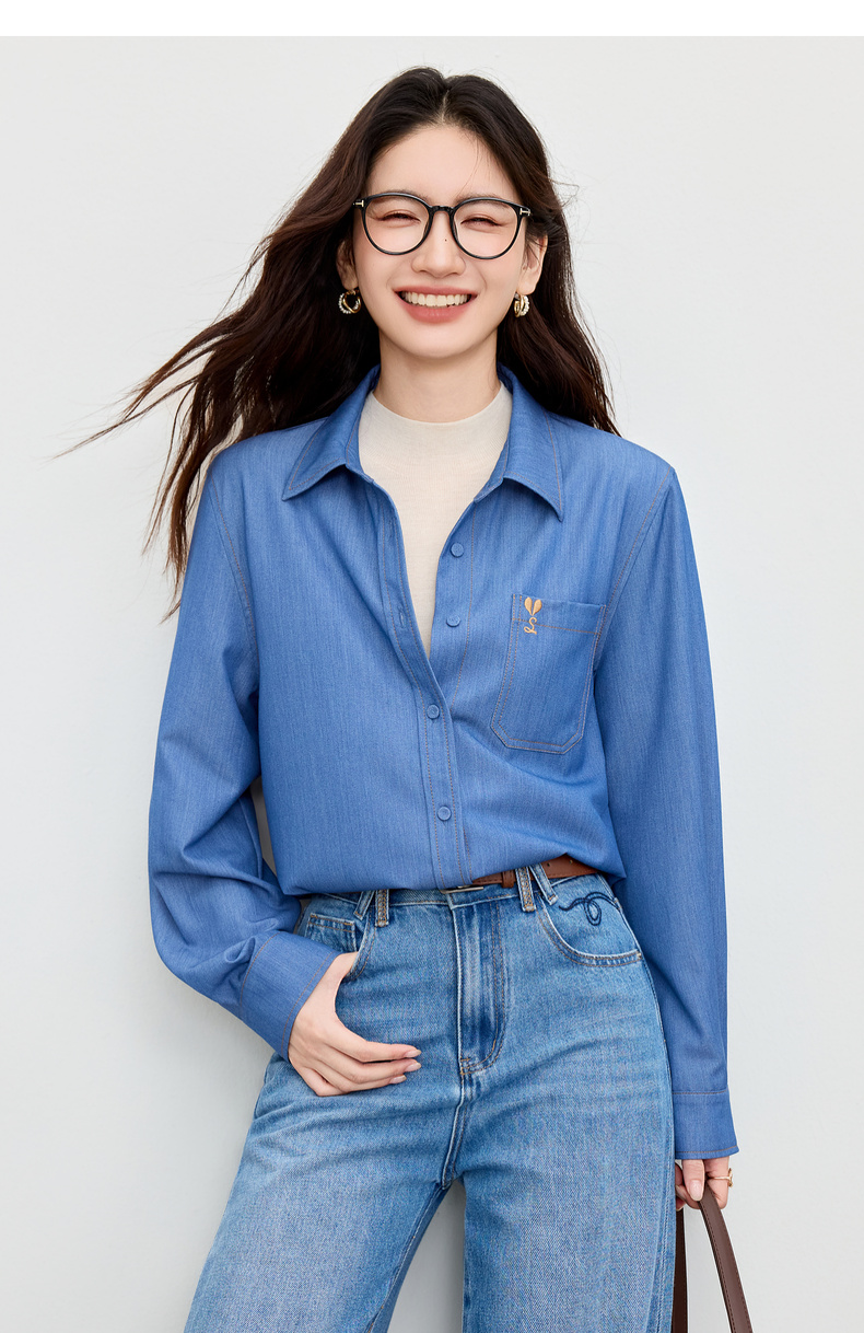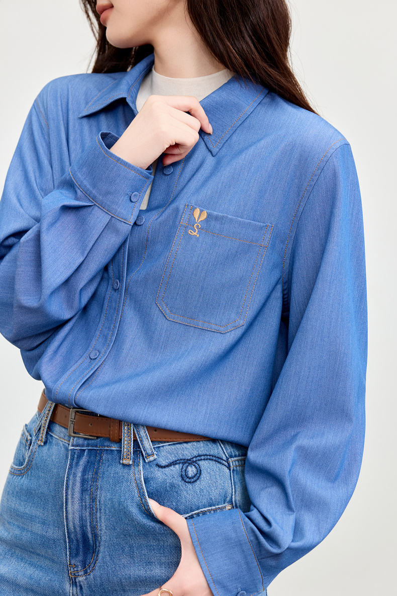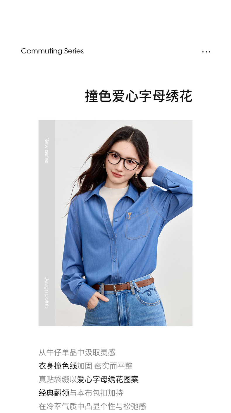 【内购】【撞色绣花】通勤翻领明线设计爱心字母图案宽松显瘦落肩袖衬衫-153CA2762