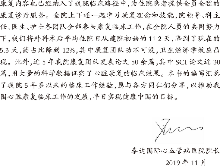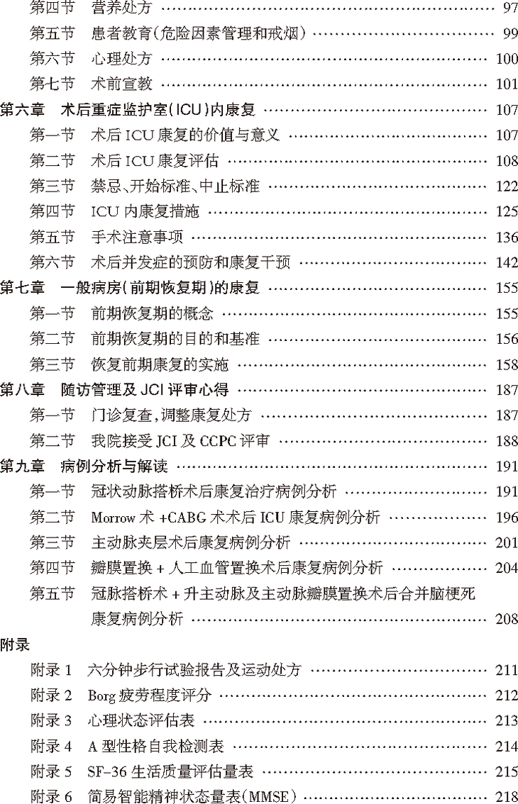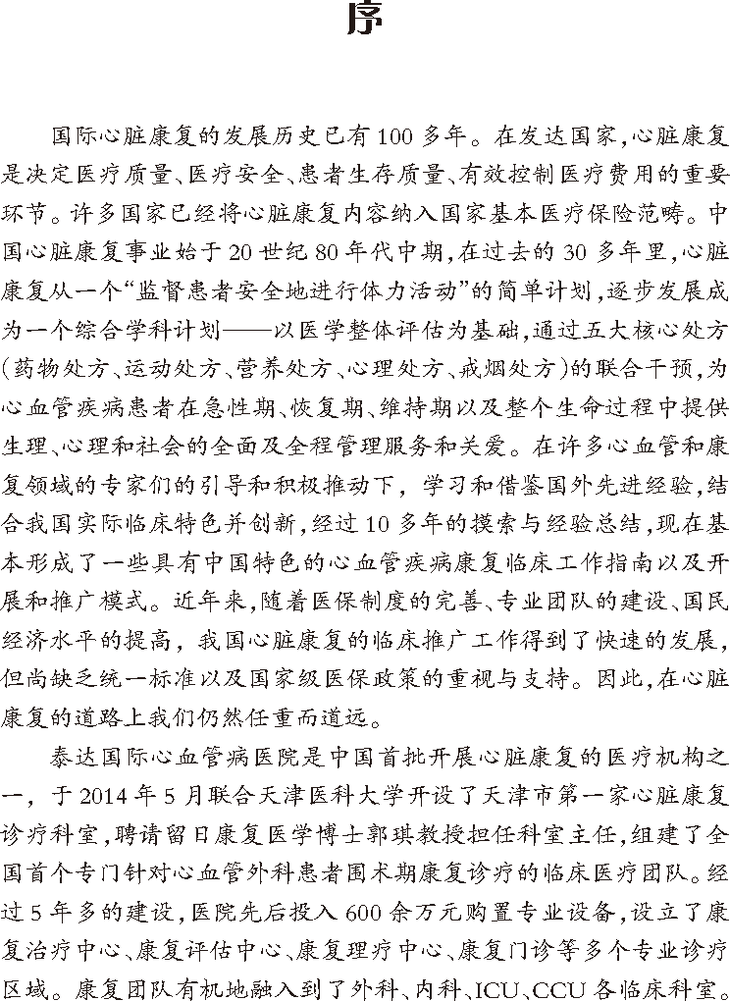 我国心血管疾病占城乡居民总死亡的首位,威胁国民的健康。每年约有心血管外科手术患者20余万,并且手术患者需求逐年增多。虽然,目前我国心血管外科技术已经达到国际先进水平,但令人遗憾的是,心血管外科手术风险高、步骤复杂,手术治疗并未使心血管疾病的死亡率下降,也没有降低心血管疾病的复发率和急性心血管事件。心血管疾病患者出院后6个月内死亡、卒中和再住院率高达25%,4年累积病死率高达22.6%。心血管疾病发病低龄化、高发病率、高再发率和死亡率,不仅严重危害国民健康同时也影响我国社会经济的发展。因此,如何高效率、低成本减少心血管疾病的发病率、复发率和死亡率,改善患者的生活质量,延长健康寿命,减轻社会医保压力,是我国社会发展面临的严峻考验,也是临床医务工作者还待解决的当务之急。在发达国家,心脏康复已经成为心血管疾病治疗体系中重要的组成部分。系统回顾和荟萃分析显示心脏康复综合管理可使心血管疾病死亡率降低58%,并能提高临床心血管疾病治疗的有效性,降低医疗费用,明显提高患者的生活质量。在我国,心脏康复的临床推广工作虽然得到了快速的发展,全国开展心脏康复的医疗机构也从3年前的不足十家发展到了现在的300多家;但是在其快速崛起的同时,也出现了心脏康复人才缺乏、康复知识技能匮乏、康复临床技术手段混乱的局面,亟须制定一套符合我国临床工作的临床路径和指南等行业标准。本书在大量参考国外内权威著作和最新相关文献的基础上,结合了作者团队5年的心脏康复临床实践和经验,以图文并茂、深入浅出的方式向读者系统讲解了心血管外科患者的围手术期的临床康复技术的标准化操作,可为今后我国心血管外科康复的临床路径的设定、临床指南的修订,以及医疗保险项目的增改与完善提供了参考依据。此外,本书相关的临床康复诊疗技术的应用与普及,可以有效地提高我国心血管疾病的临床防治水平和术后康复水平,提高公共医疗资源的使用效率,减轻国家医疗负担。