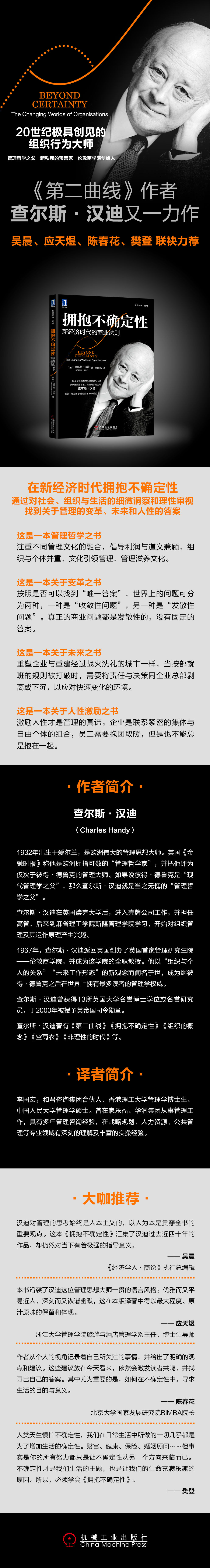 本书以汉迪自己的工作、管理咨询与生活经历为素材,通过对社会、组织与生活的细微洞察和理性审视,从组织规划、个人发展及未来趋势论述了不确定性对社会、企业与个人造成的影响,同时有针对性地提出了应对措施。