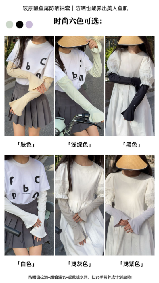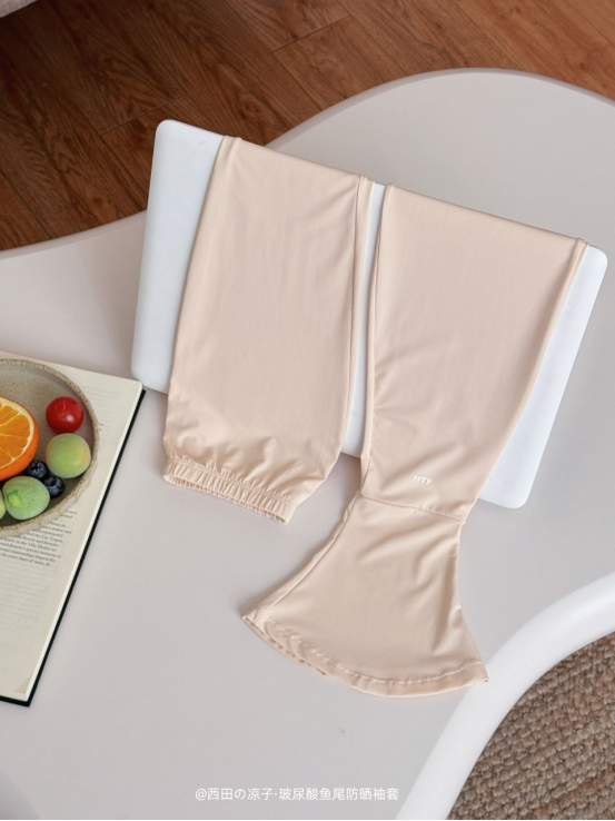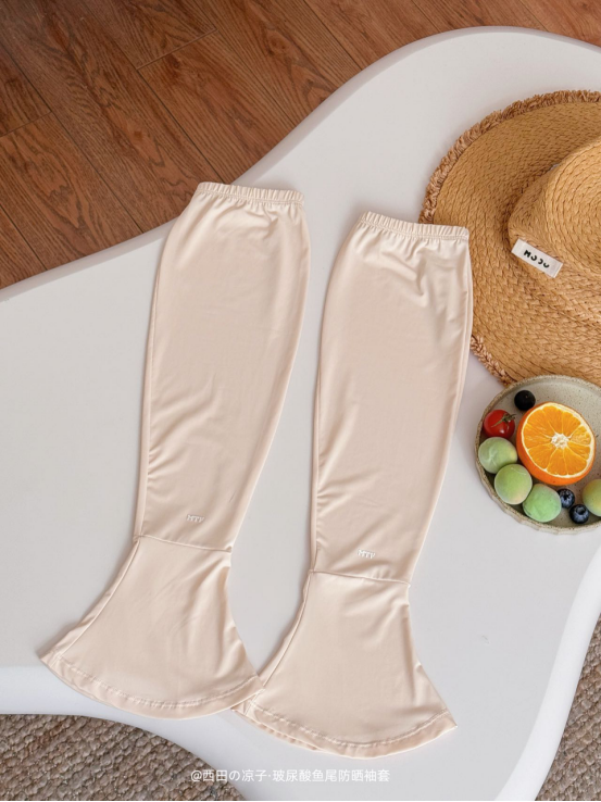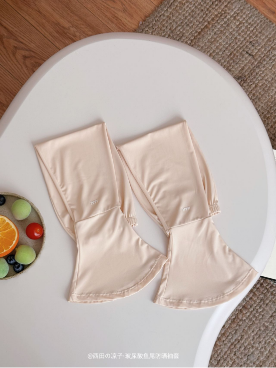 肤色还非常适合不喜欢“明显防晒装备” 但又怕晒黑的用户,隐蔽性强,时尚又实用 西田の凉子玻尿酸鱼尾防晒袖套采用肤色设计 在满足美观的同时,还拥有一流的功能表现