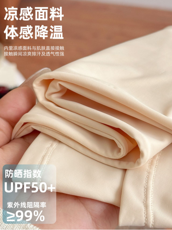 玻尿酸护肤涂层 令肌肤在高温中依然保持水润 加长鱼尾袖口全面包覆手背与关节 防晒零死角,冰感凉爽面料触感柔滑