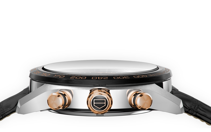 镜面 材质 | 蓝宝石水晶玻璃 | 表盘 | 抛光精钢和精细磨砂表壳表壳 黑色熊猫盘,腕表点缀18K 5N玫瑰金指针、时标、表冠与按钮 黑色测速计刻度的固定陶瓷表圈 星期显示 计时 |