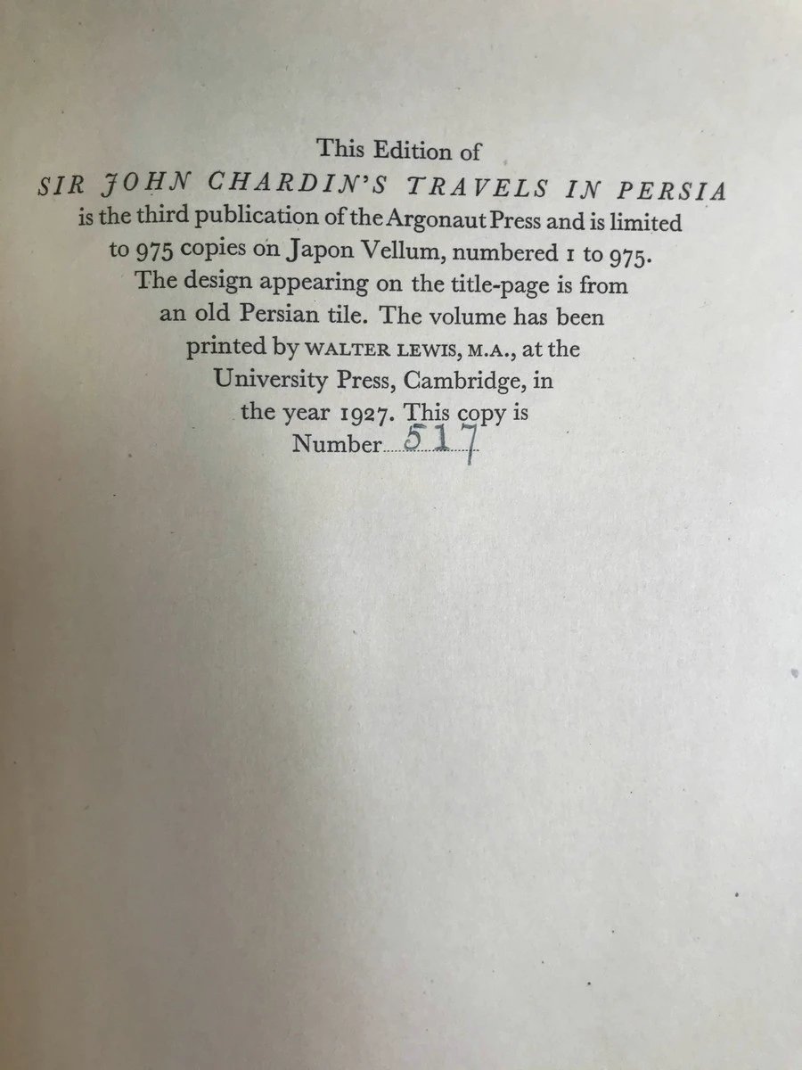 限量版毛边本!有编号!1927年 约翰·夏尔丹波斯游记 配插图与地图 漆布精装16开